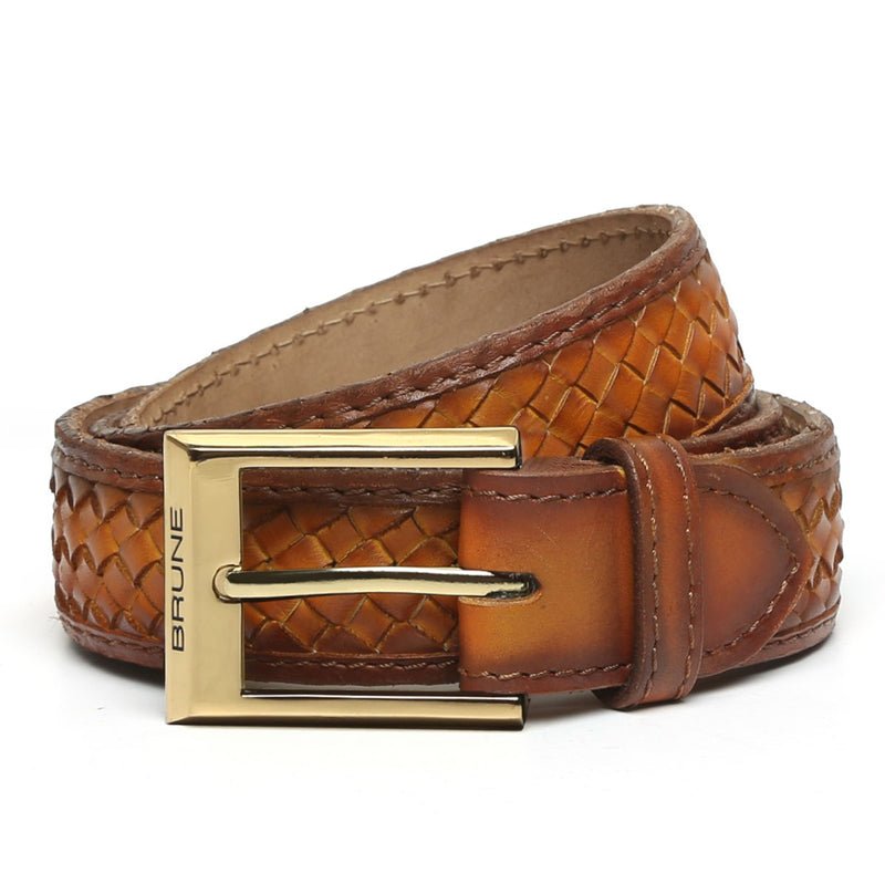 Dark Brown Leather Belt Full Hand Weaved Shiny Golden Buckle By Brune & Bareskin