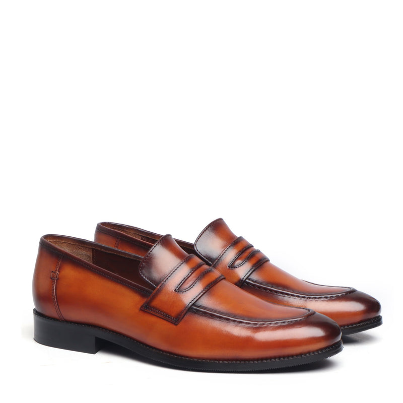 Brown moccasin with dark hand-treated burnishing effect for a very elegant stained look of the shoe. Made from imported hi veg tanned leather. keeps the shine alive with more use. this slip-on kind fit moccasin shoe is a hand-made shoe by BRUNE & BARESKIN. made by English craftsmen with the experience of 4 decades since theking and queens of the world could only afford such look.