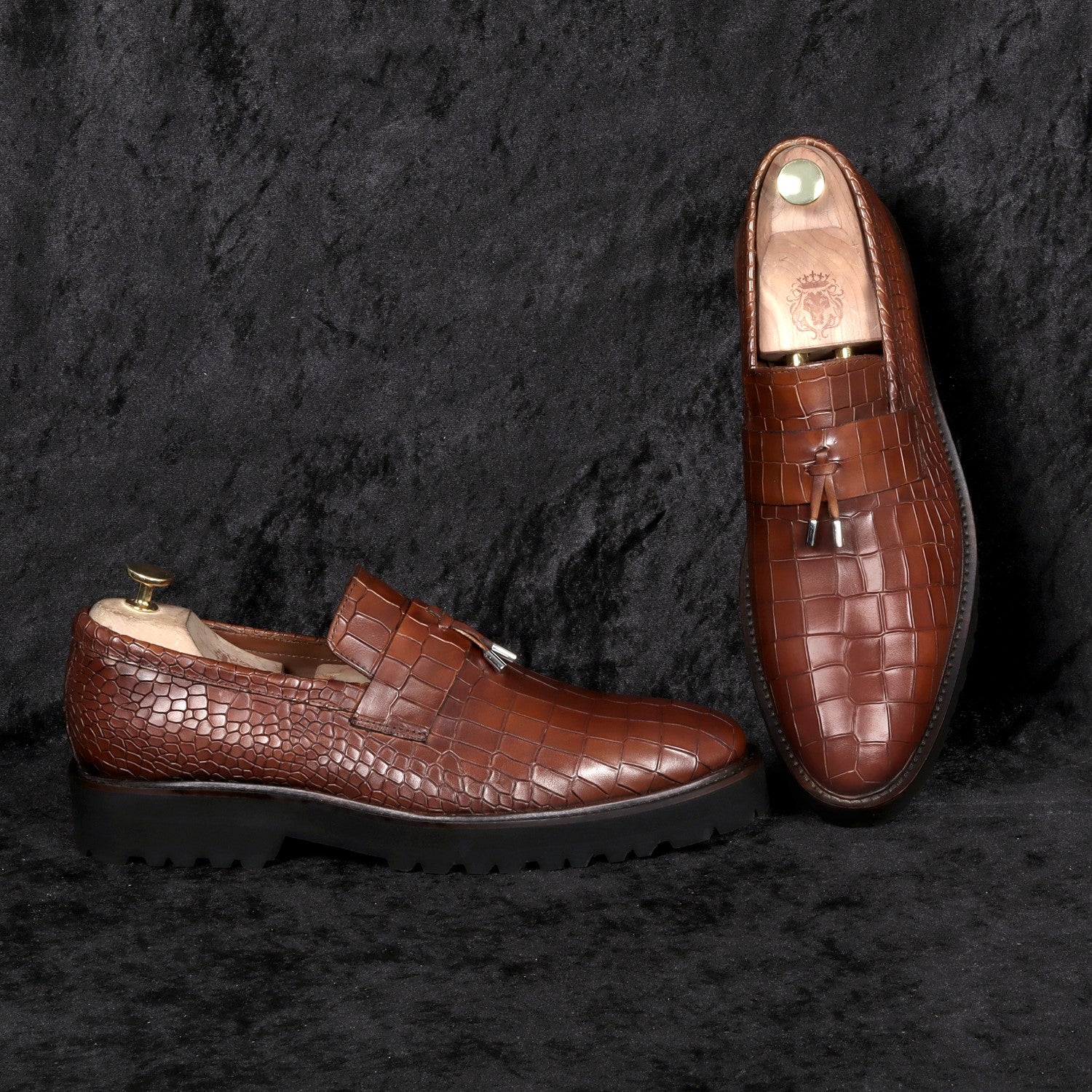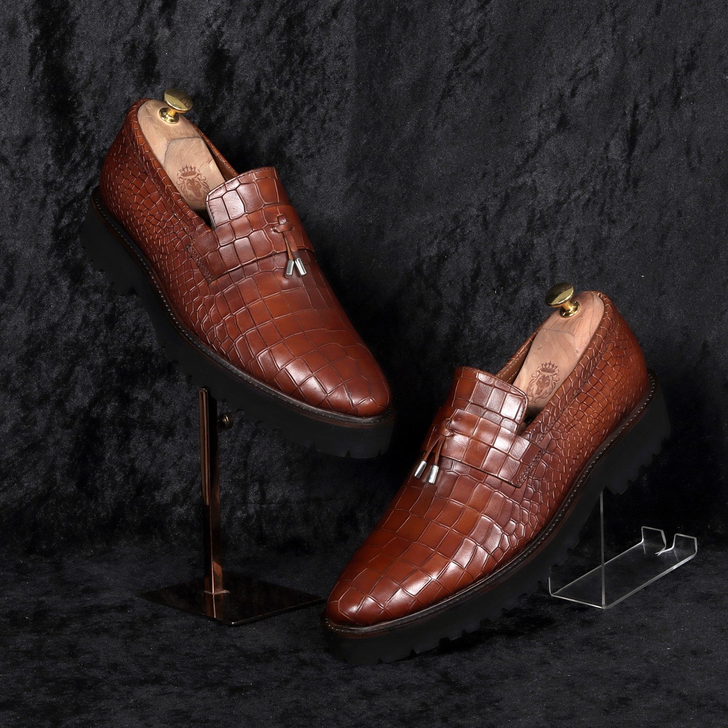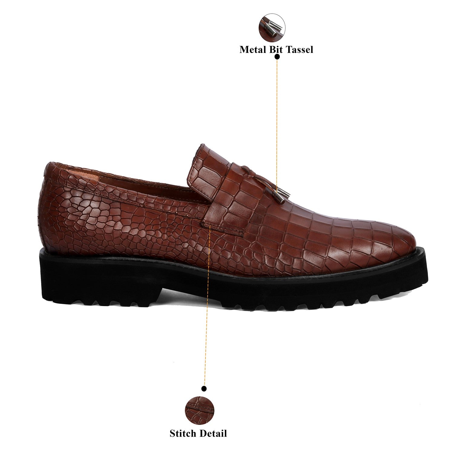 The styling makes it as elegant as any BRUNE & BARESKIN shoe would be but still offering the special design. The handcrafted black deep cut textured genuine leather formal shoe ensures your style game always be on a higher point. They're made from croco print leather and embellished with silver metal bits tassels design. The fascinating metal bit style on deep cut leather makes it perfect to leave an unforgettable mark. This Shoe is entirely made up of our expertise with hands. The metal bit tassel on the apron toe design makes this shoe extra elegant.