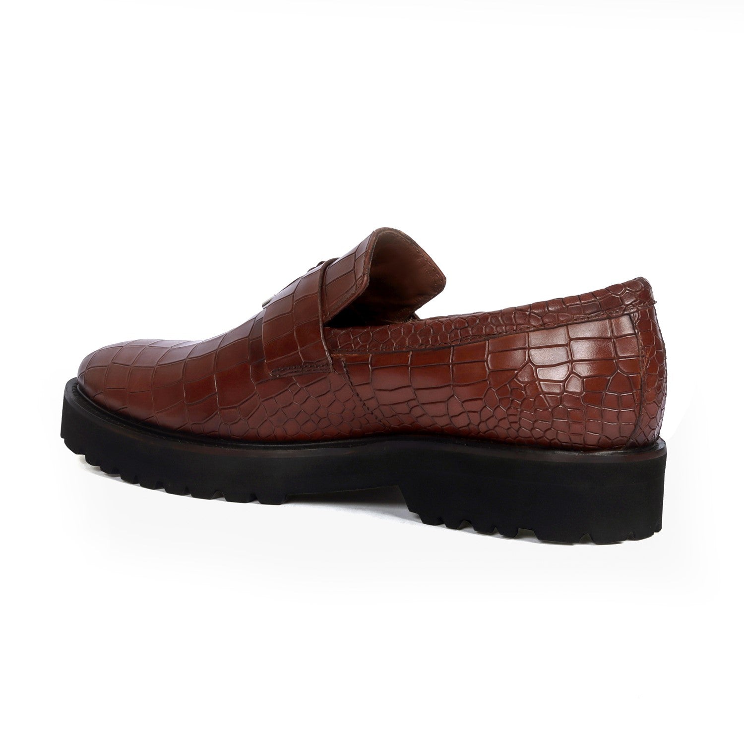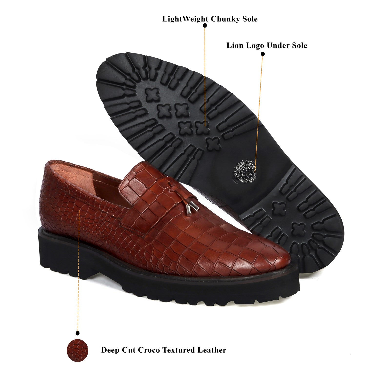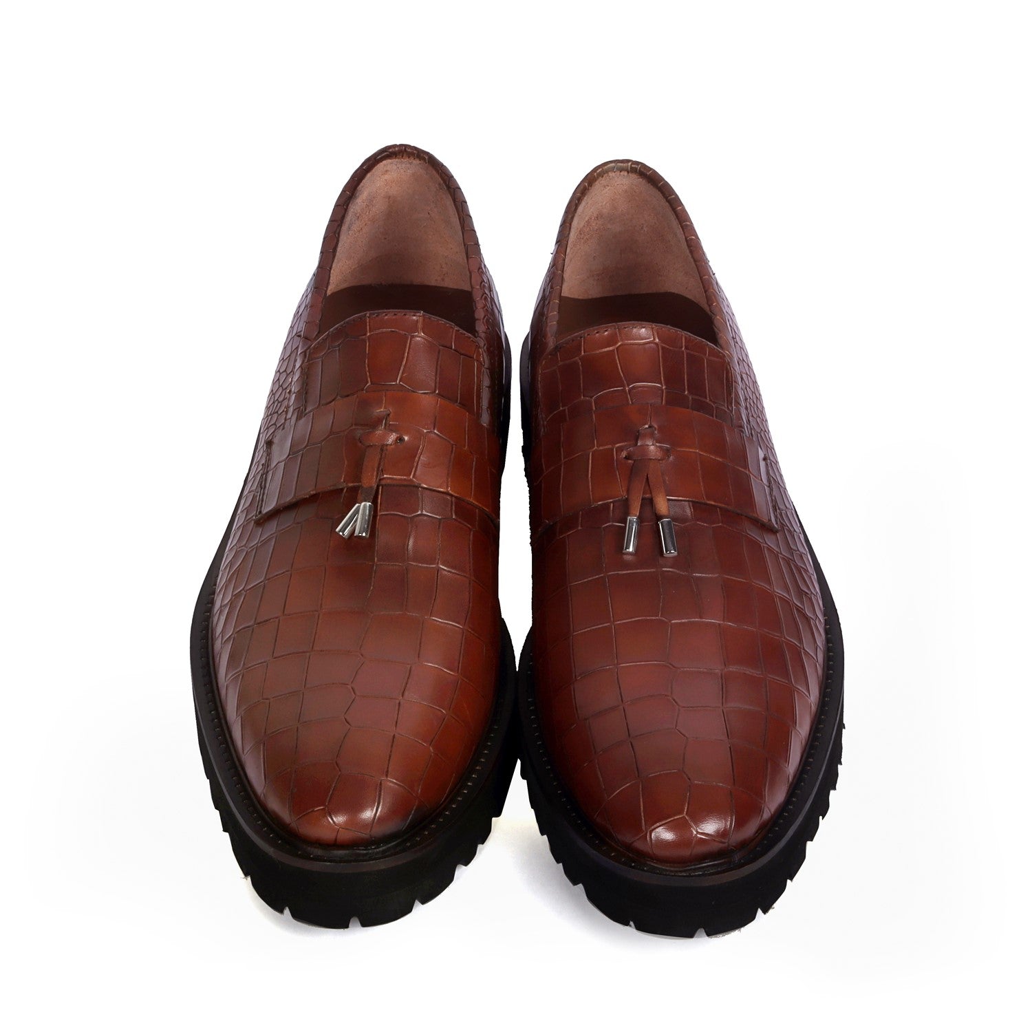The styling makes it as elegant as any BRUNE & BARESKIN shoe would be but still offering the special design. The handcrafted black deep cut textured genuine leather formal shoe ensures your style game always be on a higher point. They're made from croco print leather and embellished with silver metal bits tassels design. The fascinating metal bit style on deep cut leather makes it perfect to leave an unforgettable mark. This Shoe is entirely made up of our expertise with hands. The metal bit tassel on the apron toe design makes this shoe extra elegant.