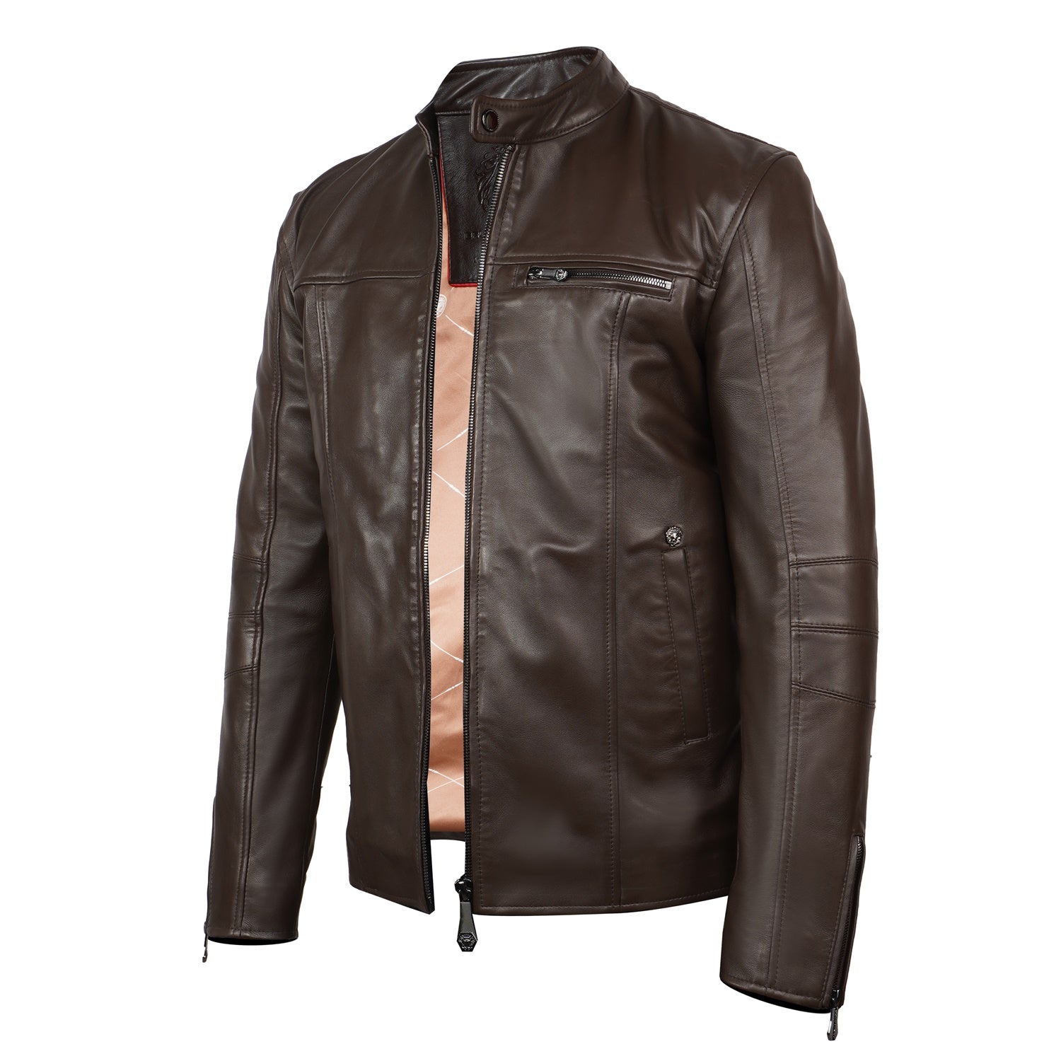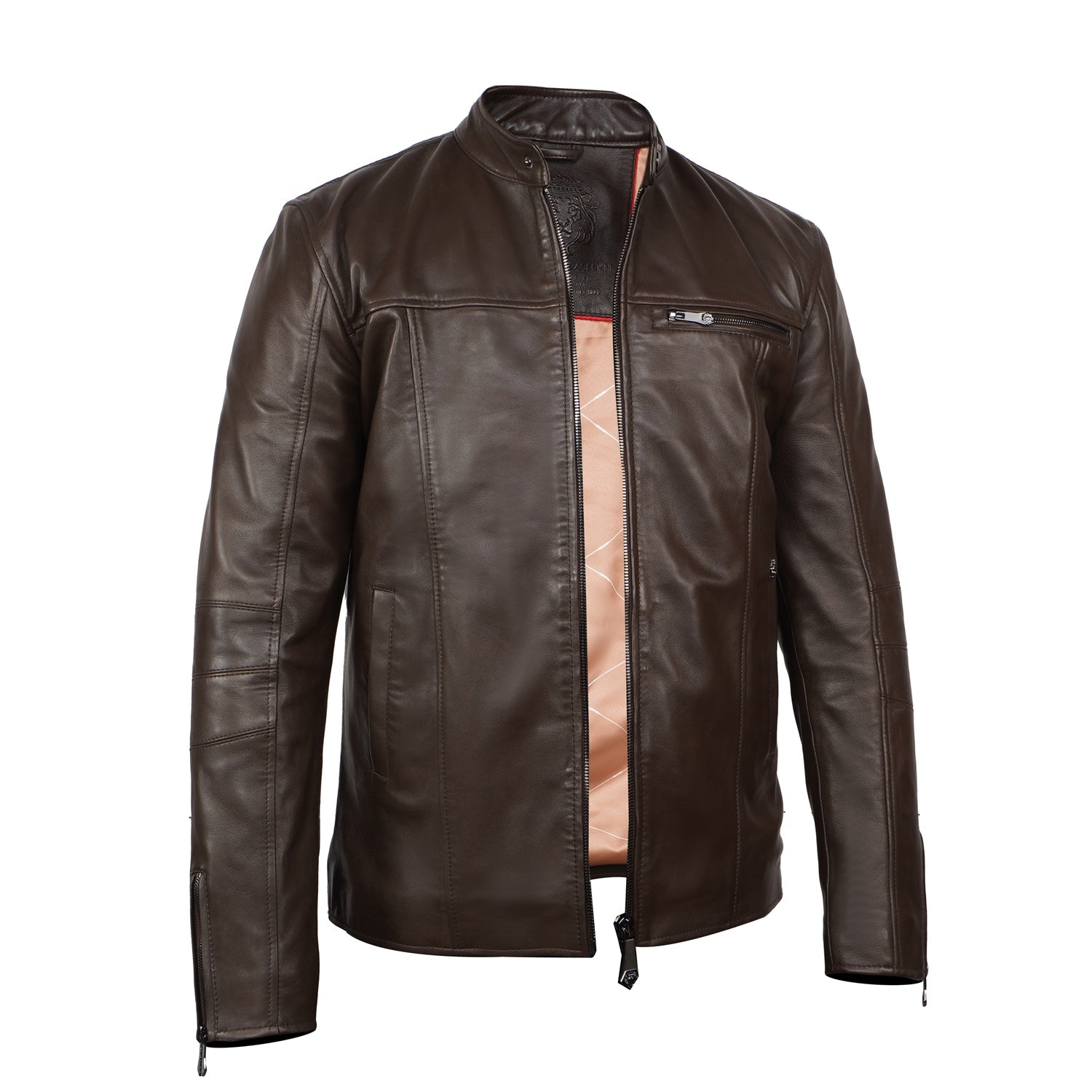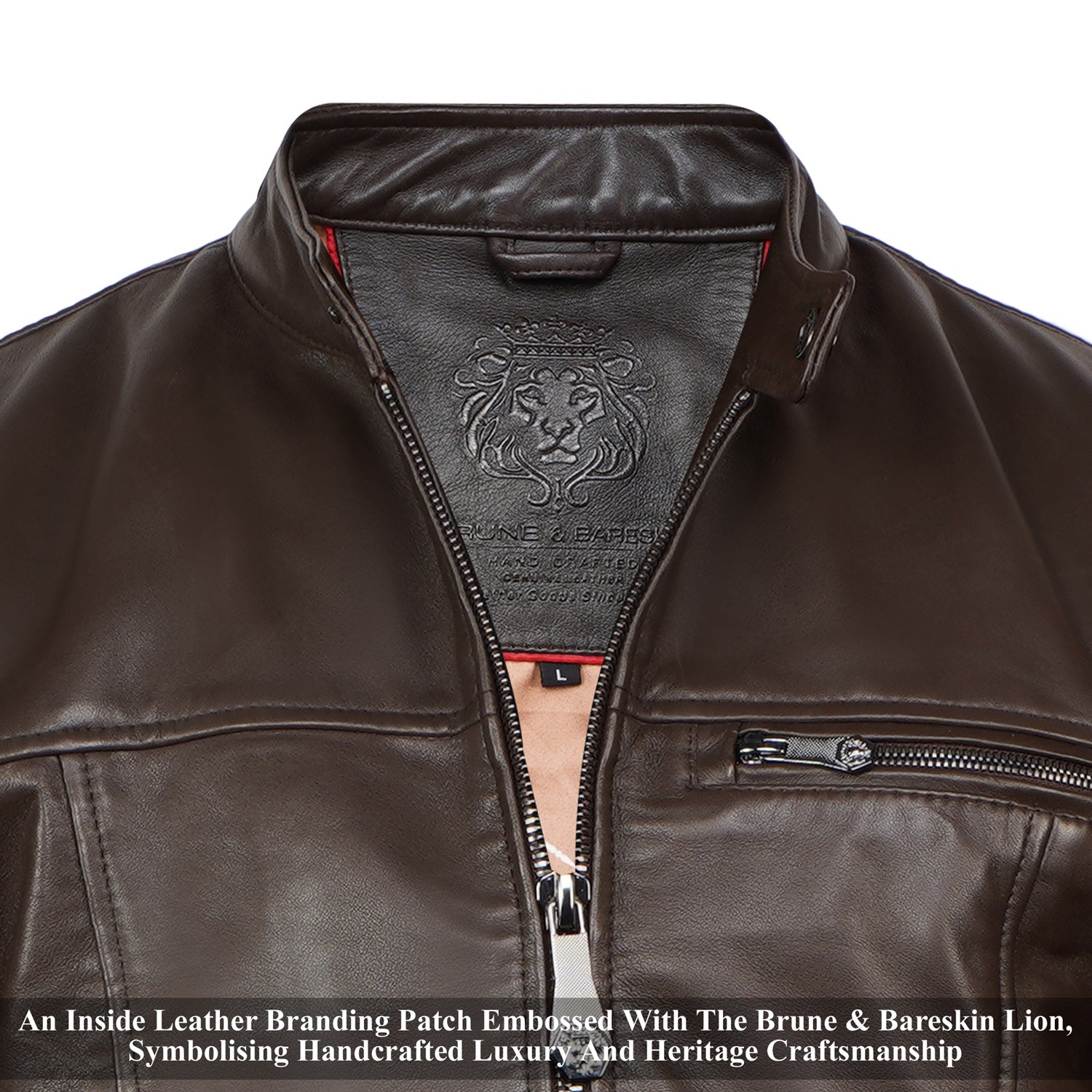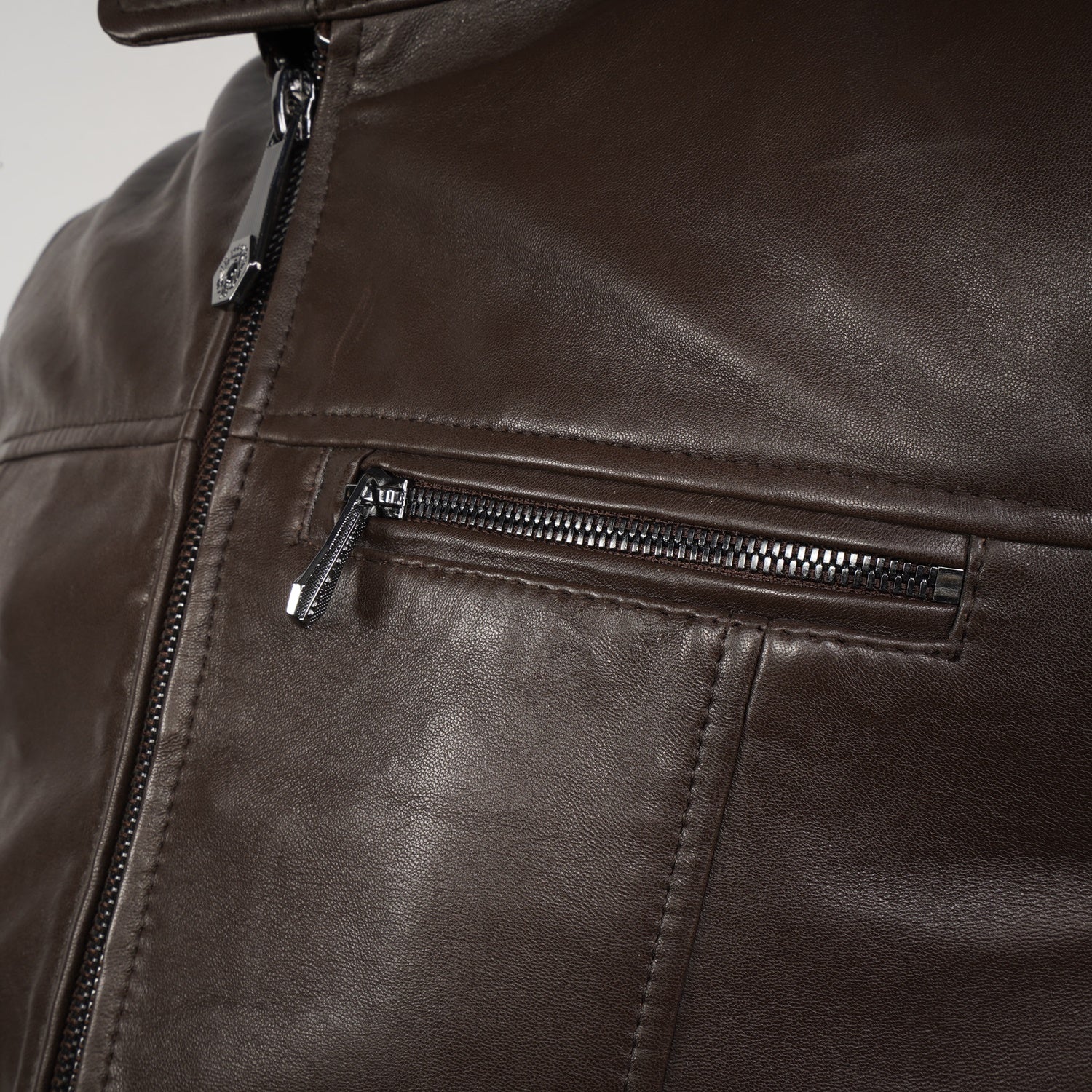 Band Collar Brown Leather Jacket with Front Zipper Pockets By Brune & Bareskin