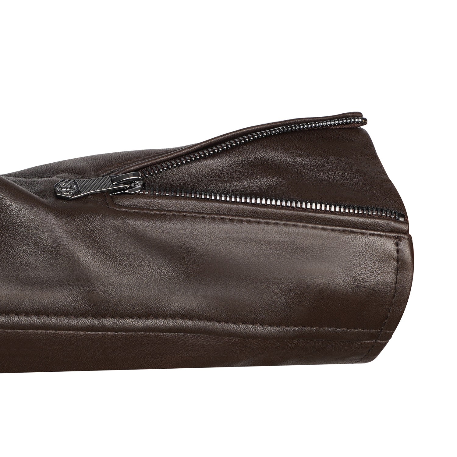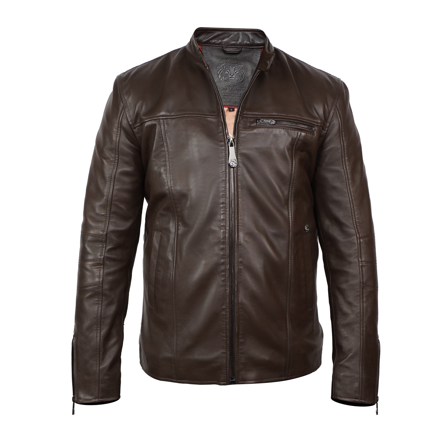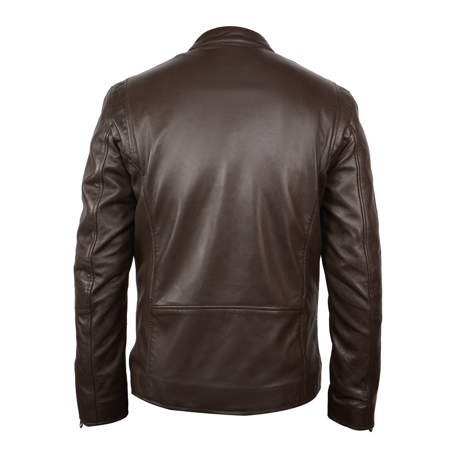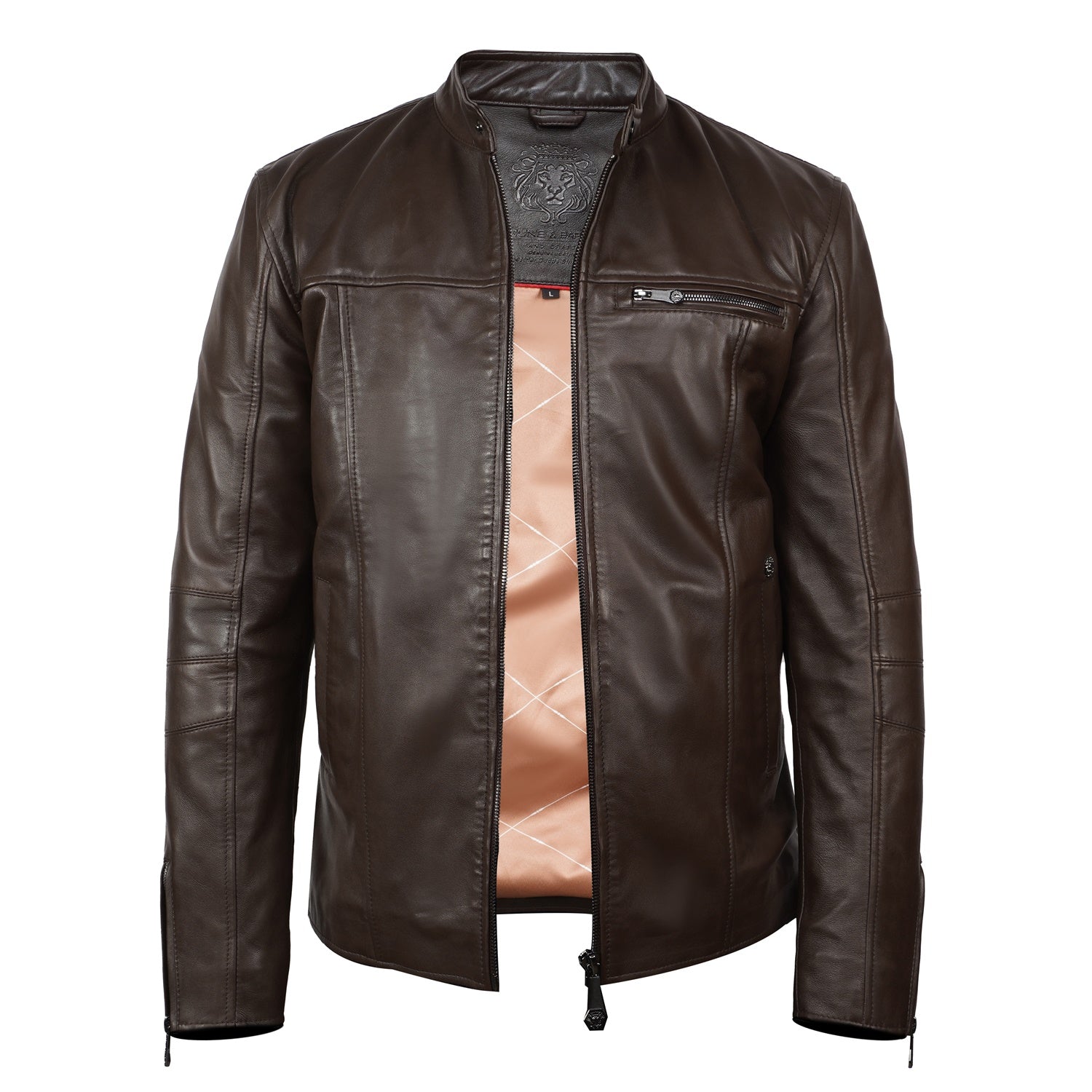 Band Collar Brown Leather Jacket with Front Zipper Pockets By Brune & Bareskin