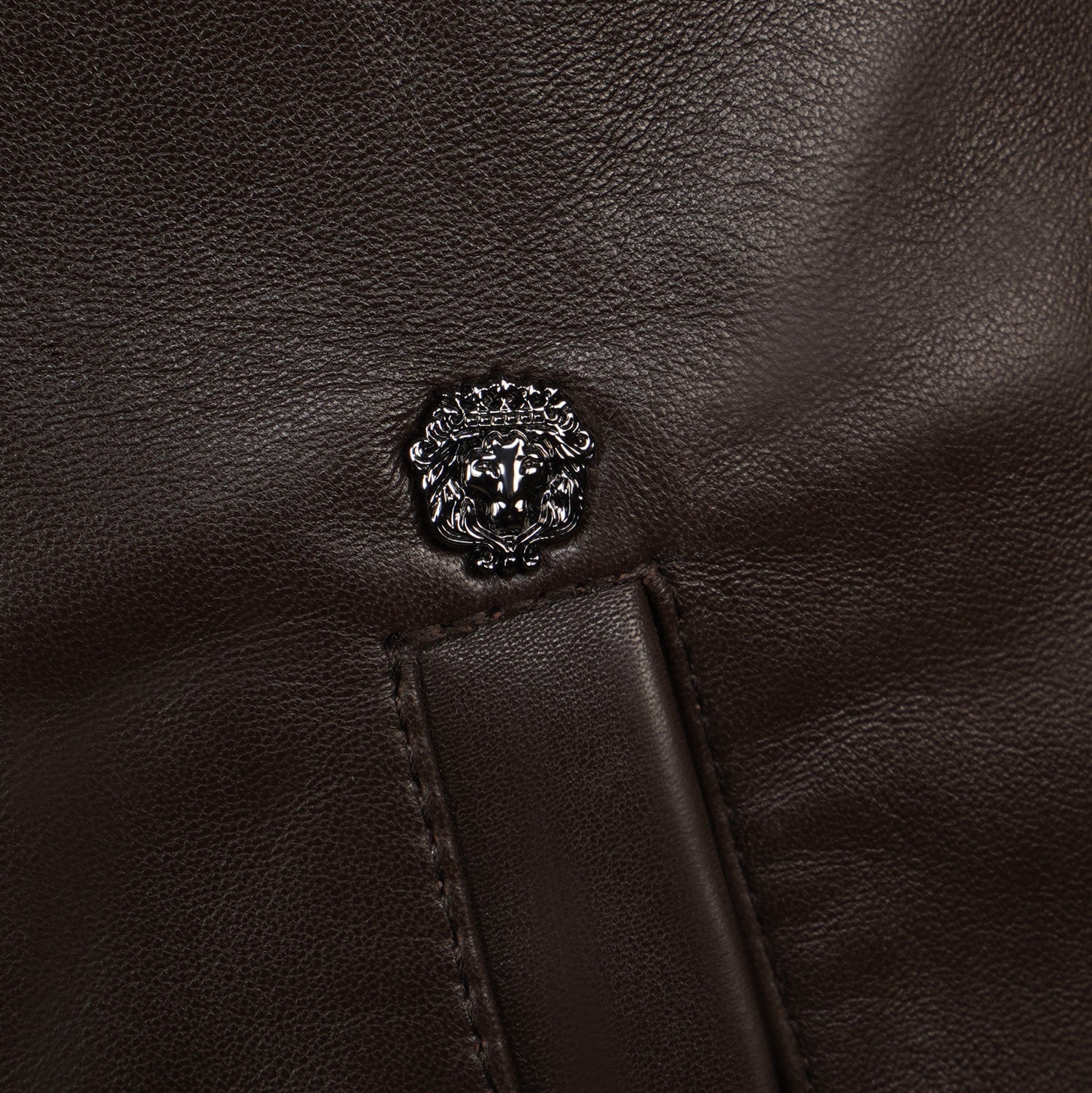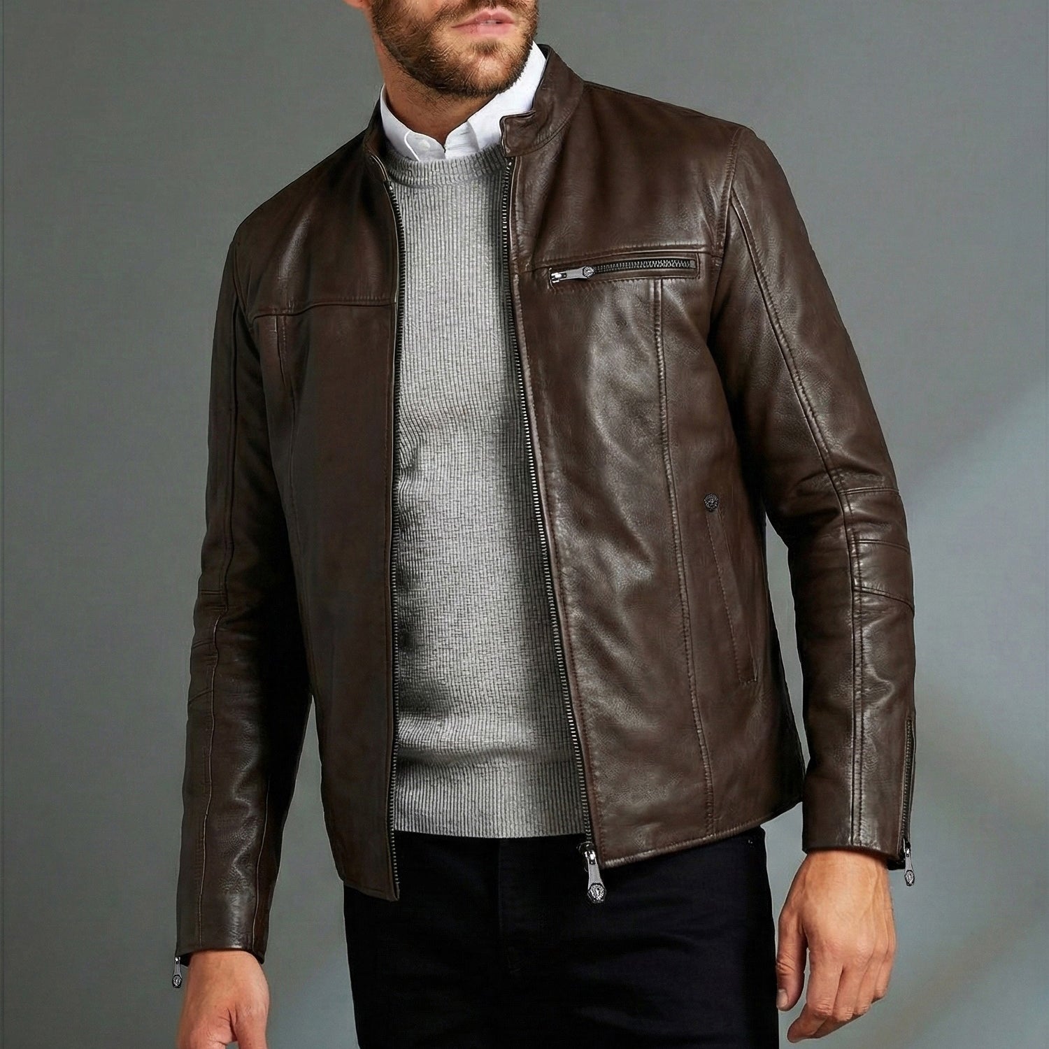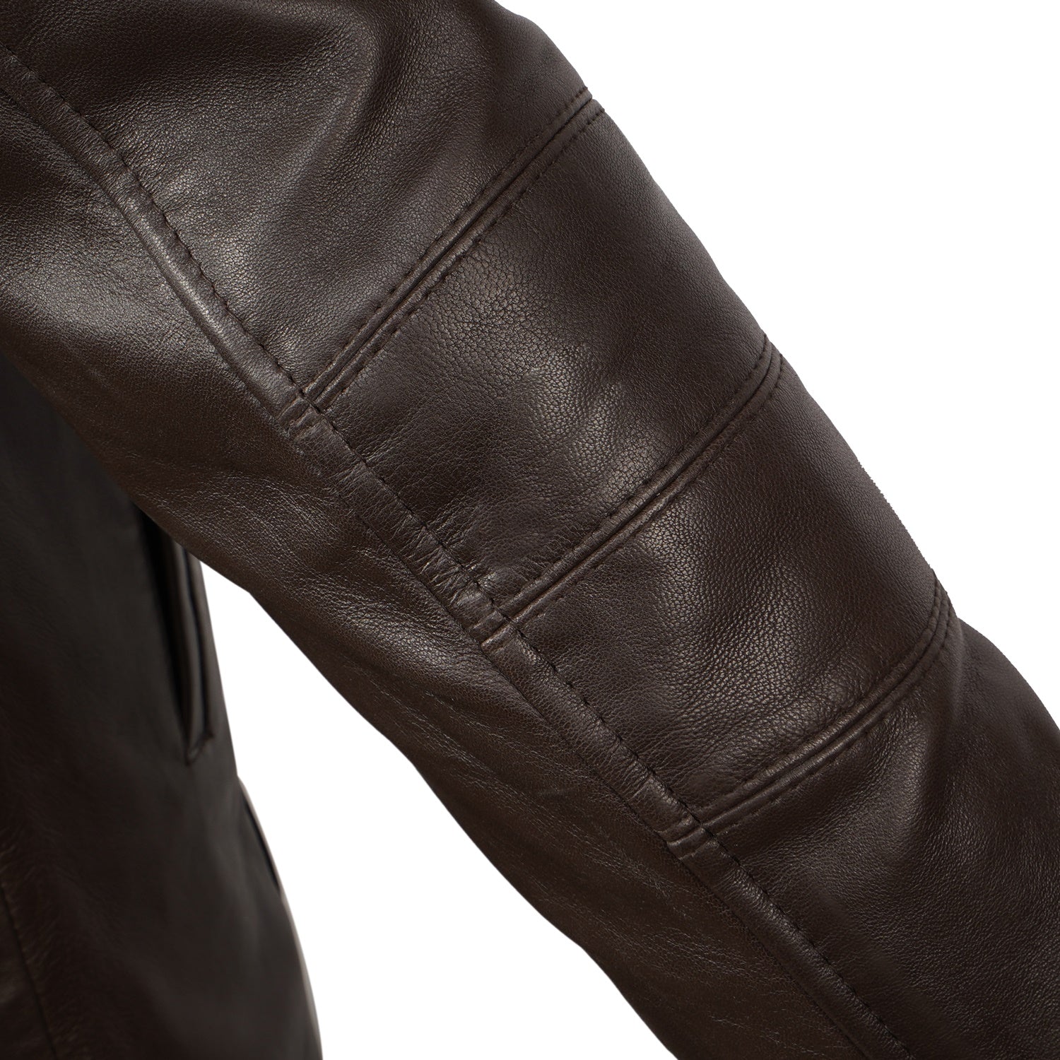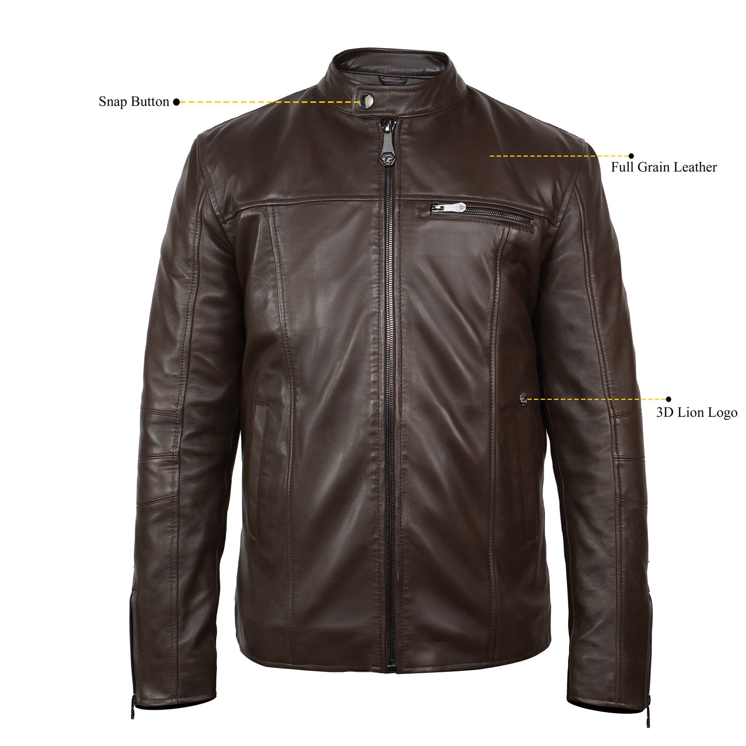 Band Collar Brown Leather Jacket with Front Zipper Pockets By Brune & Bareskin