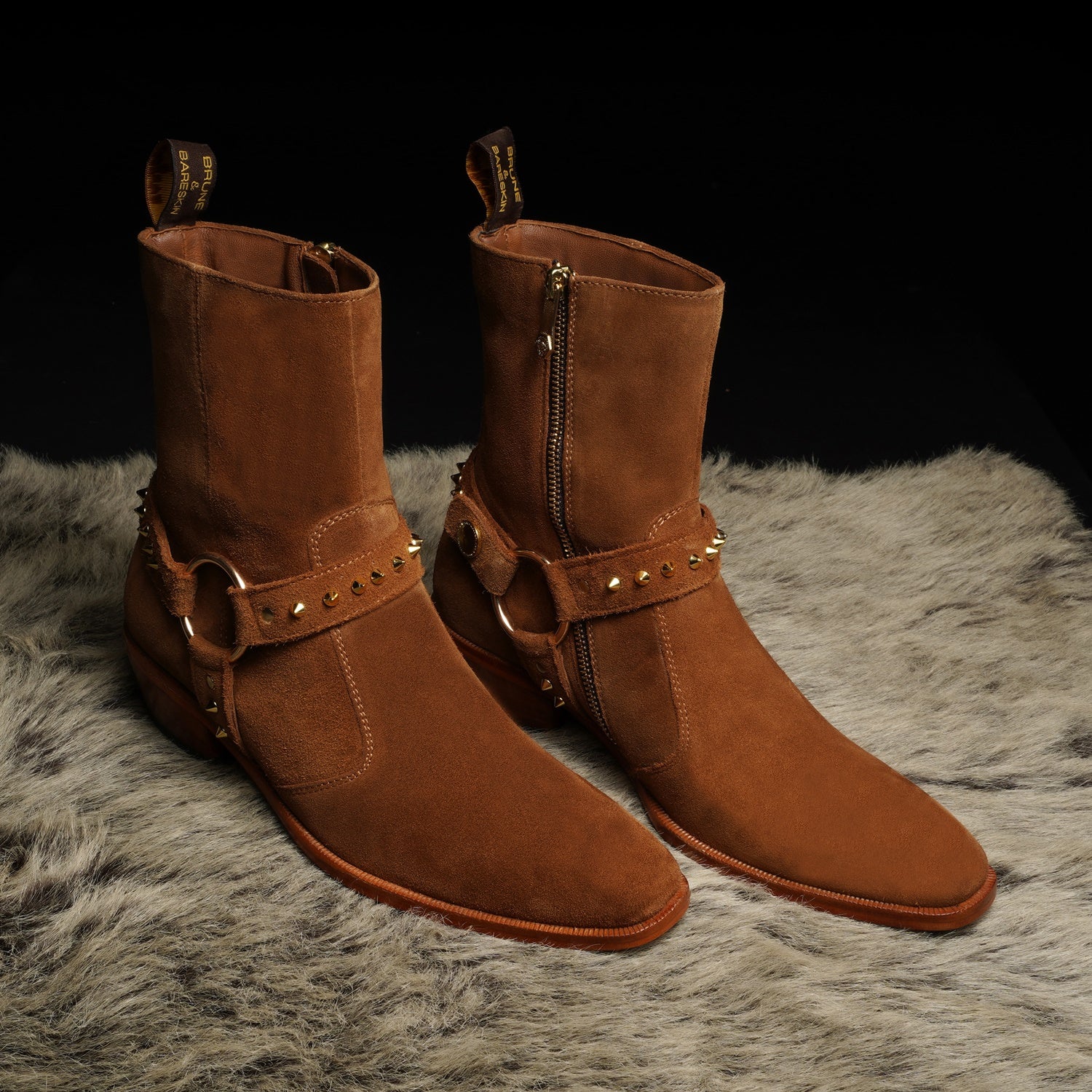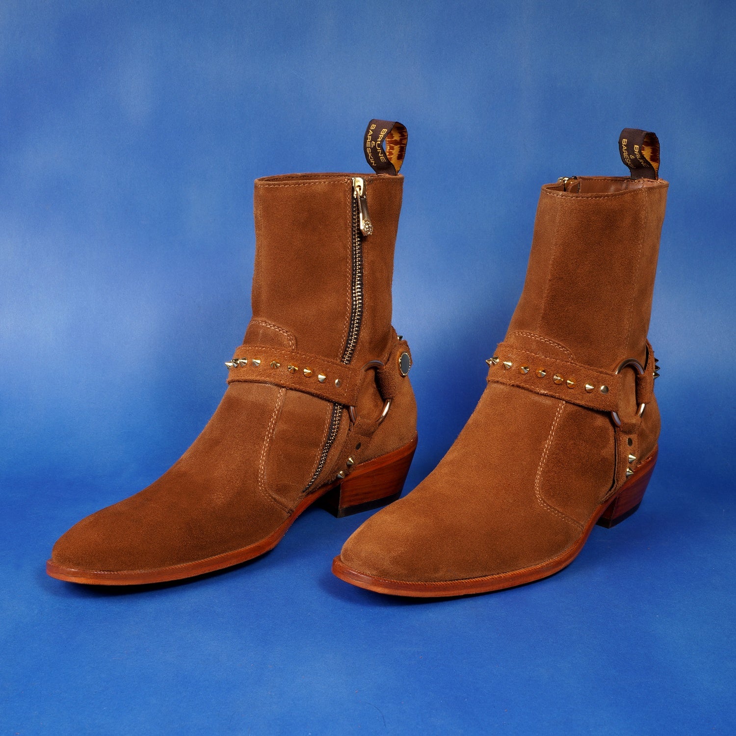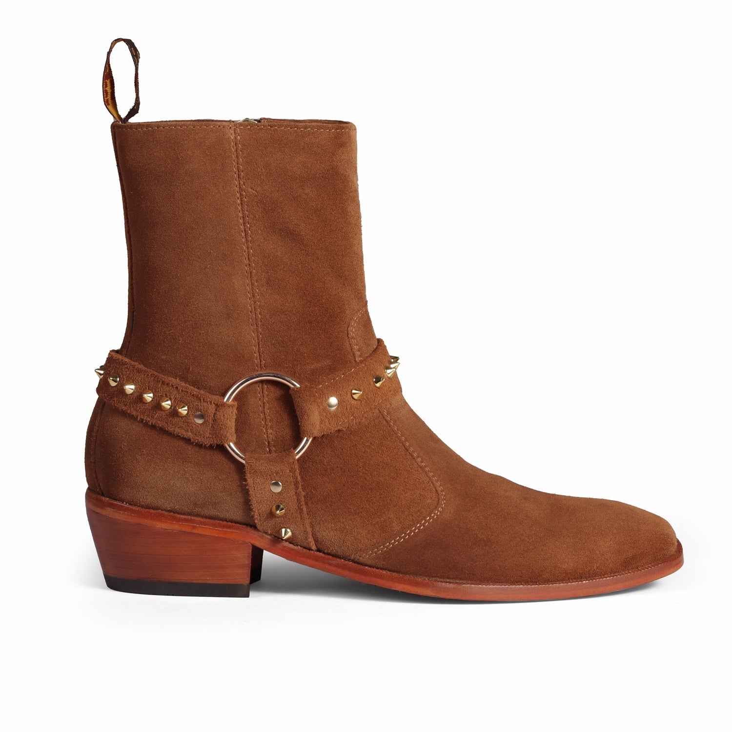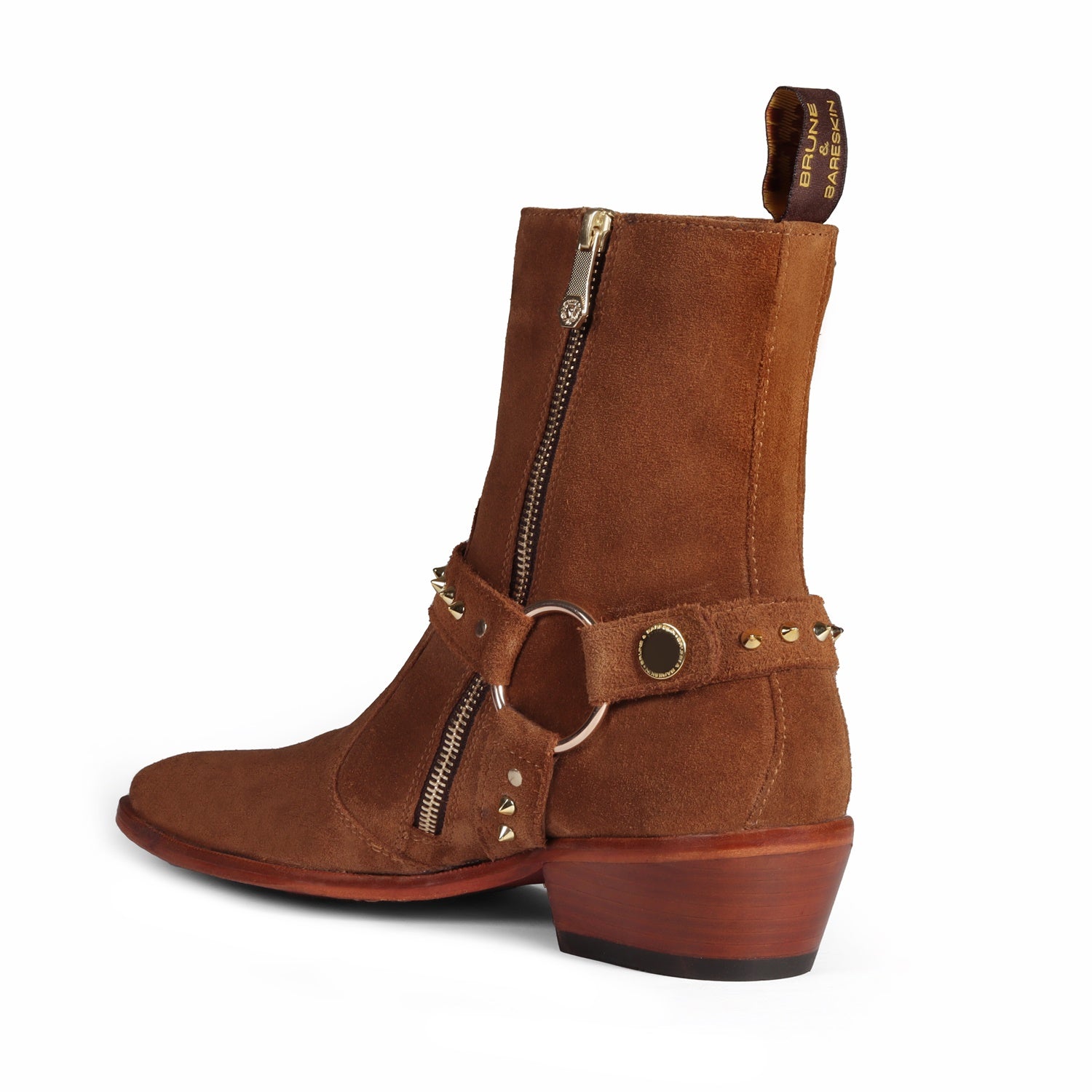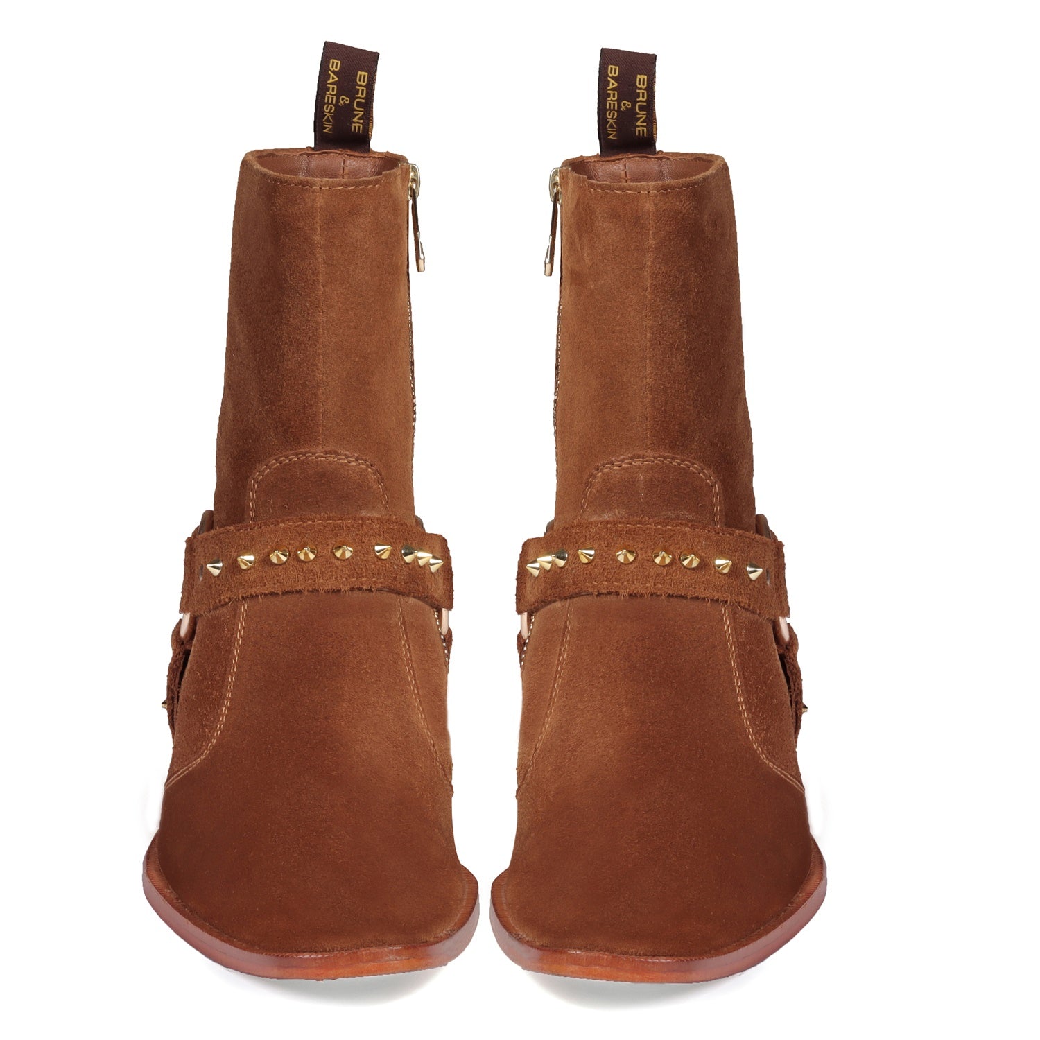 Brown Studded Boots in Suede Leather perfect Cuban heel Side Zipper by Brune & Bareskin