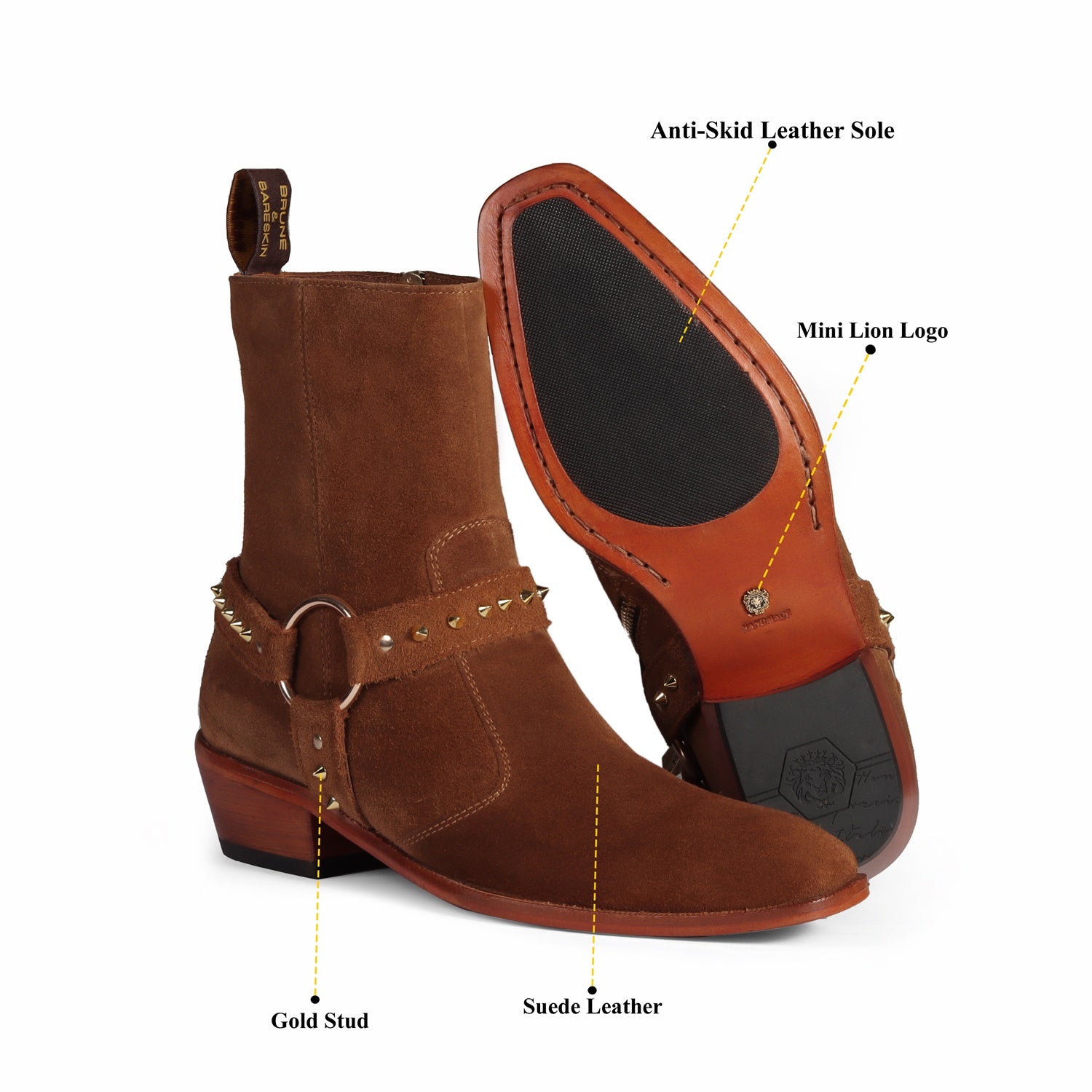 This shoe can be customized according to your liking. Brown Suede leather boot with Golden studs detailing makes this boot the first choice of every Fashionista. Golden studs on Suede leather upper provide a unique swanky look. This Shoe is entirely handcrafted by our expertise. The greater detailing of the Strap and the side zipper closure at the ankles lend a classy look to these Suede formal shoes. The pure leather sole & Cuban heel offers great comfort. Cuban Heel Essentially, it is a straight, medium-high heel with a slightly curved back. This is one of a kind boot with a perfect Cuban heel. They are easy to team with formal trousers as they blend well with the classic fabrics as well as the modern blended synthetic fabric pants, slacks and trousers. You can get it customized in your favorite color shade with Name Initials with our bespoke services.
