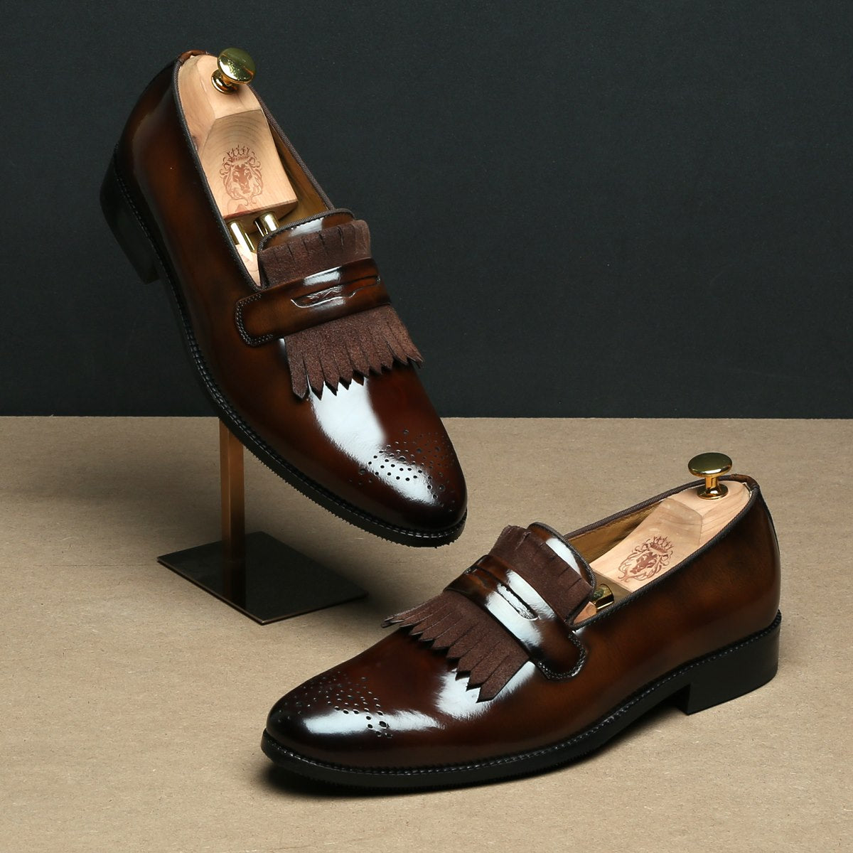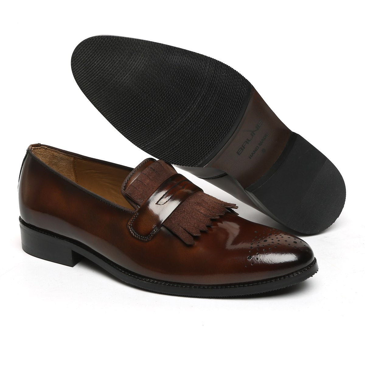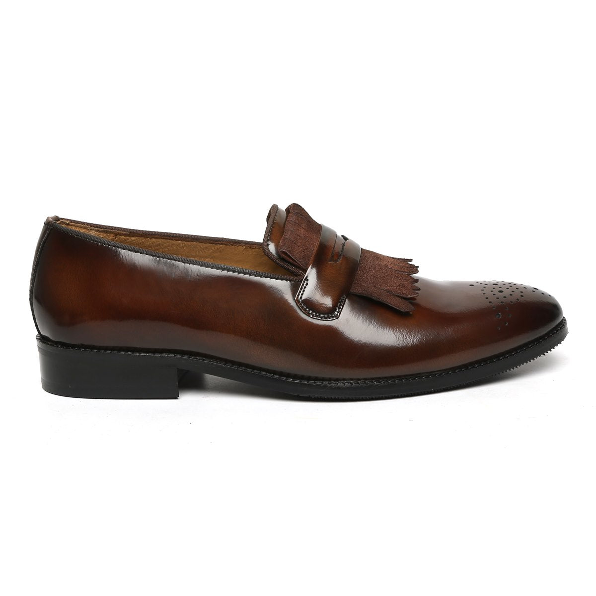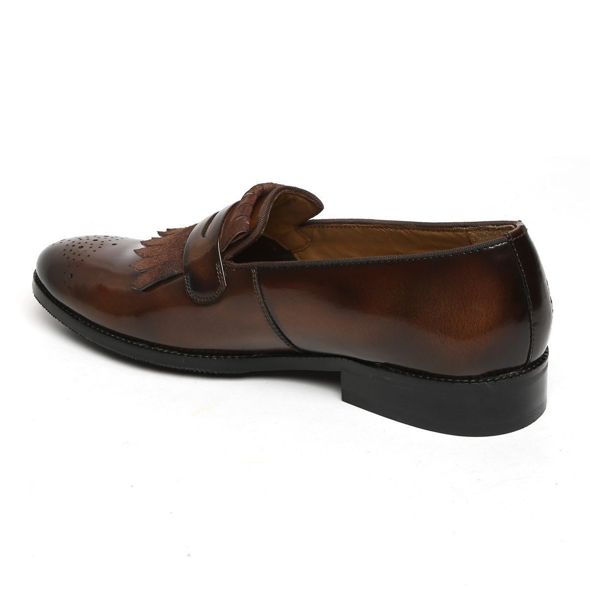 This Dark Brown Patent and suede leather slip-on is designed to keep your fashion foot forward always. The matte look suede leather and shiny patent leather compliments each other perfectly. This is a perfect shoe to wear with tuxedos and suits. It also looks amazing with the wide range of Formals to semi formals to Casuals. Wear it at parties and leaves an unforgettable style impression.