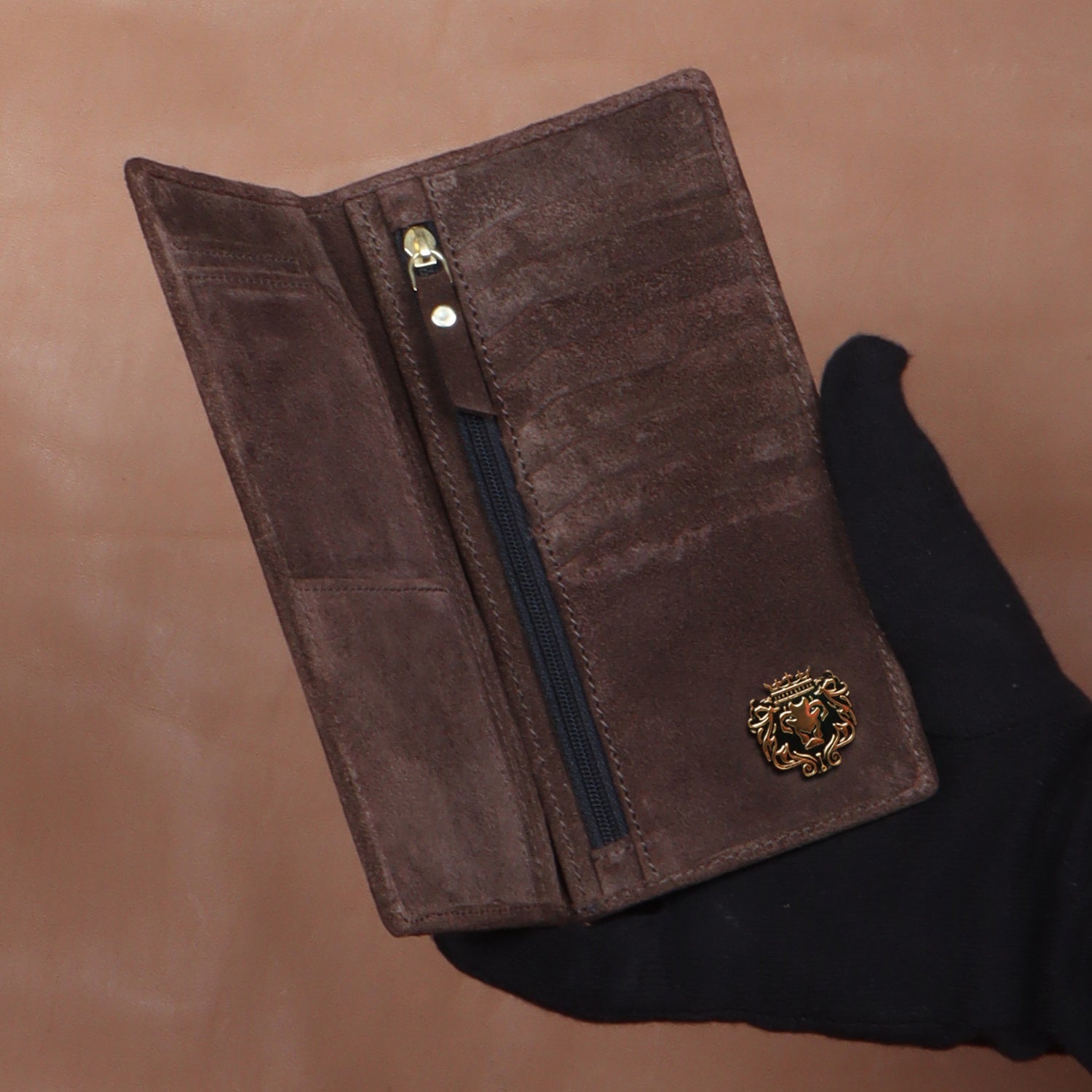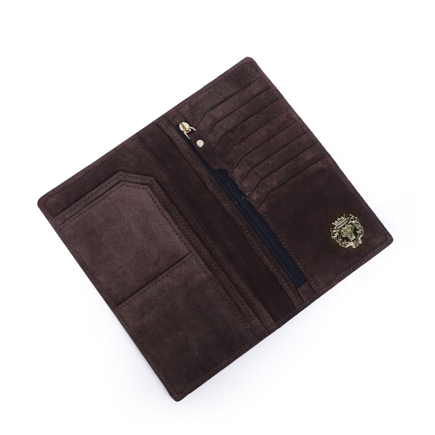 Brown Suede Leather Long Wallet with Inside Zipper Multi-Pockets