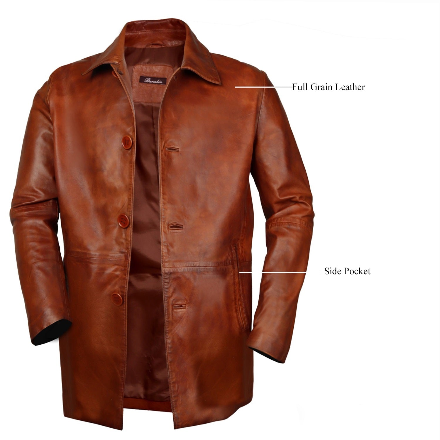 Long Shirt Style Collar Cognac Leather Jacket Coat With Button Closure By Brune & Bareskin