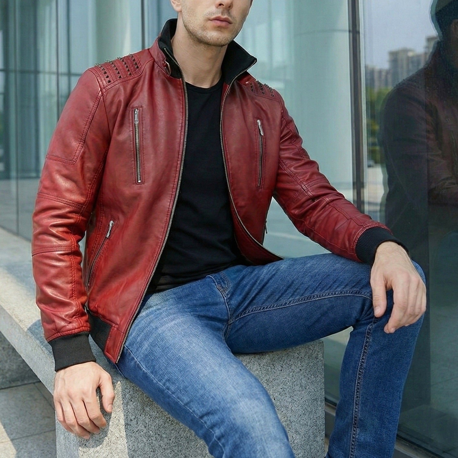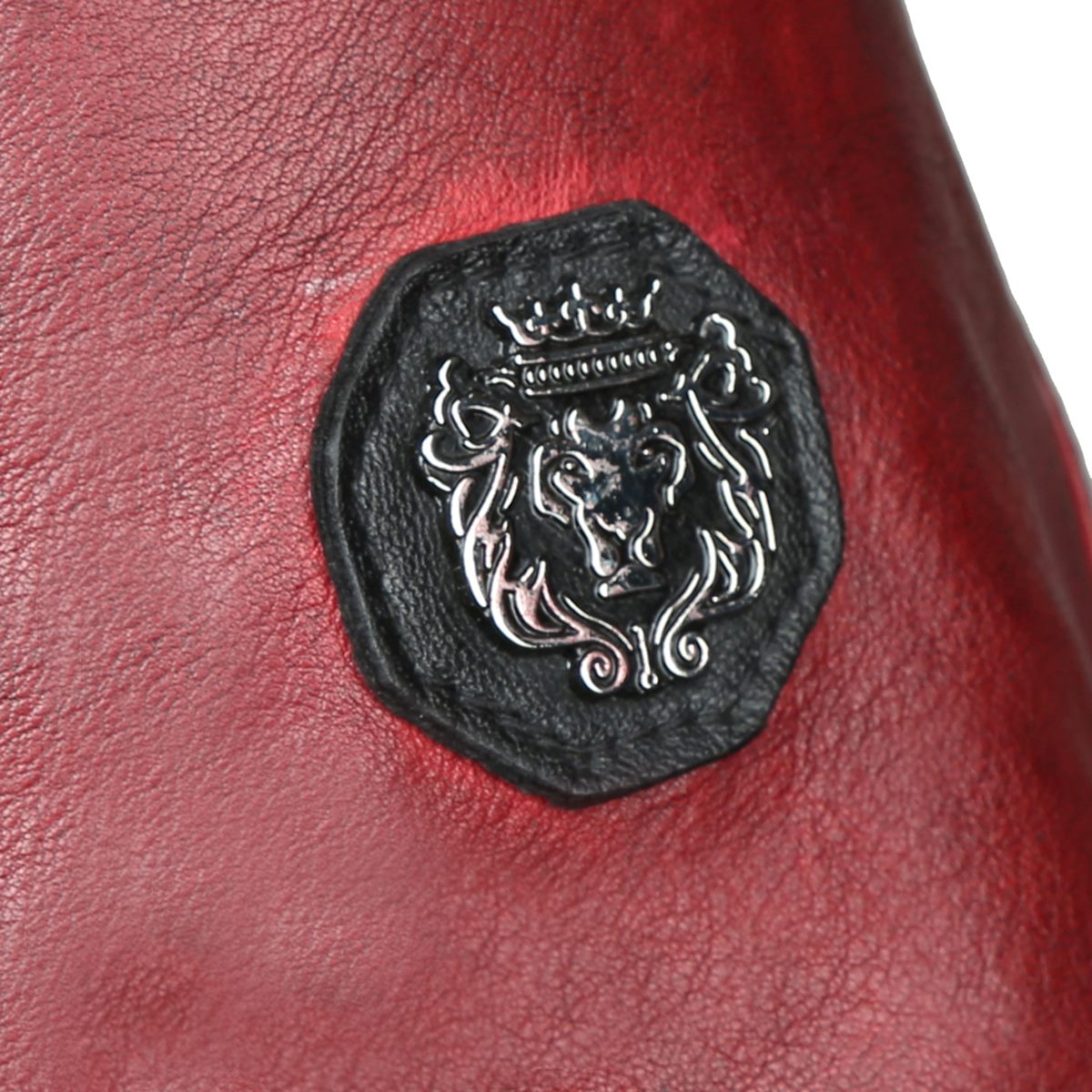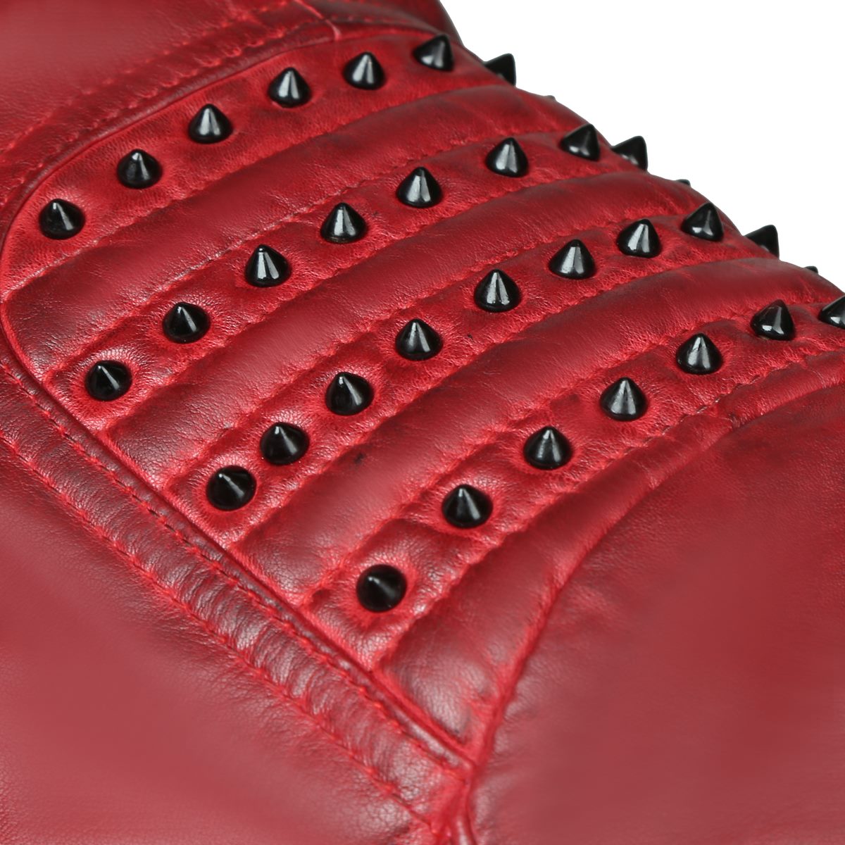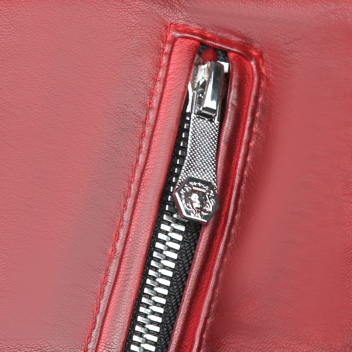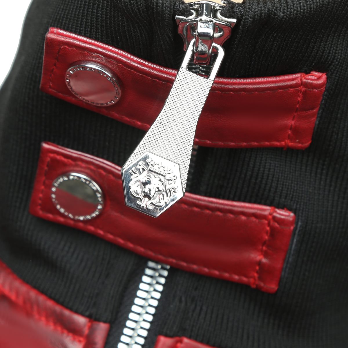 Black Studded Turtle Ribbed Collar Red Genuine Leather Jacket With Metal Lion Logo By Brune & Bareskin