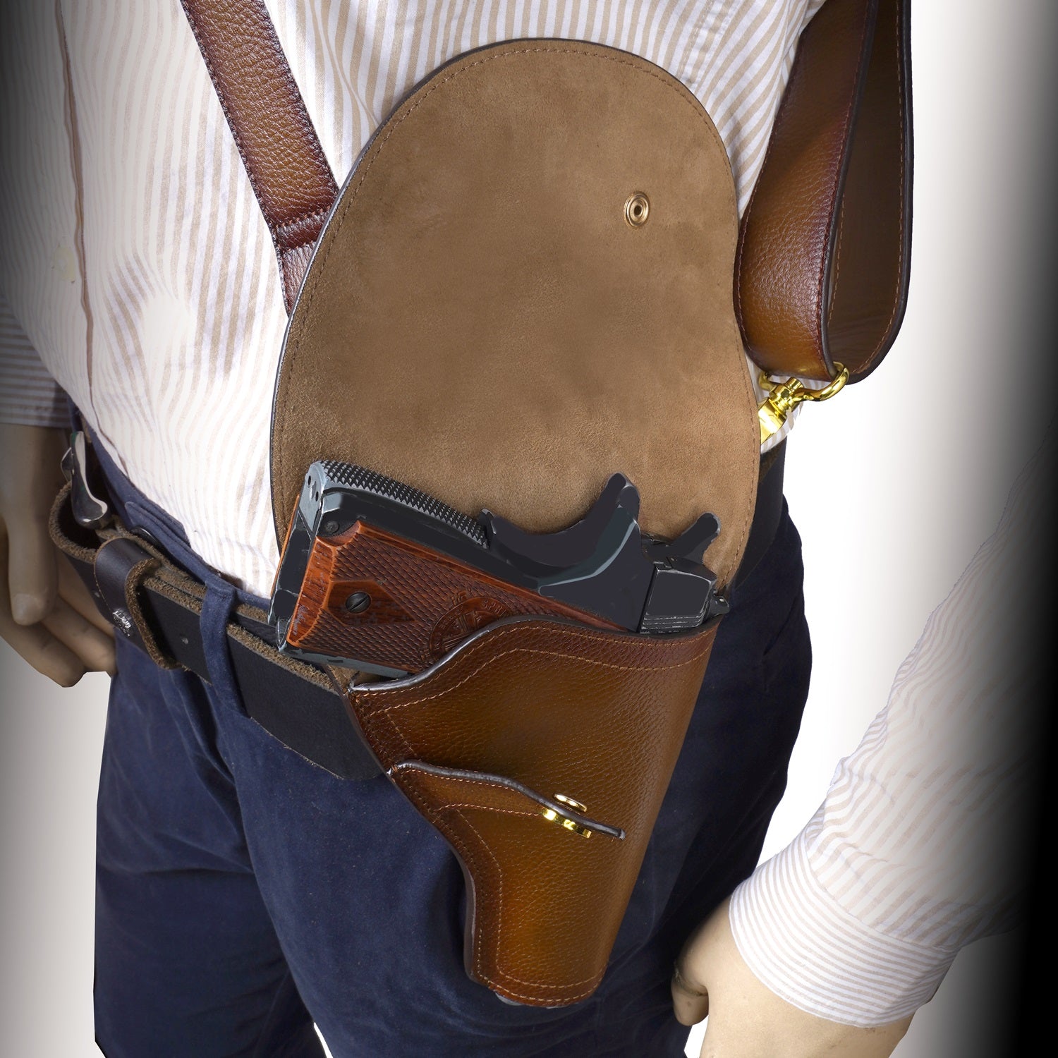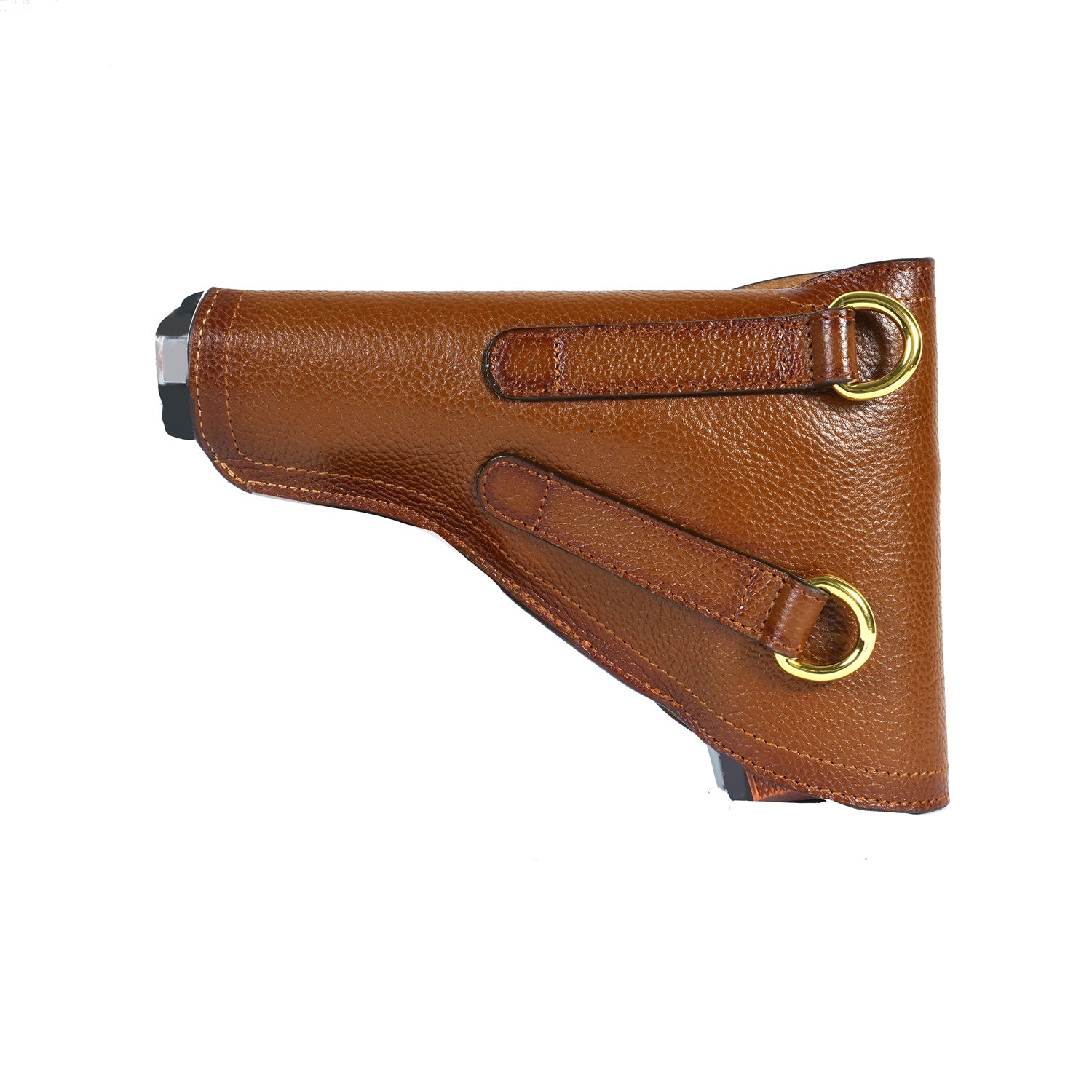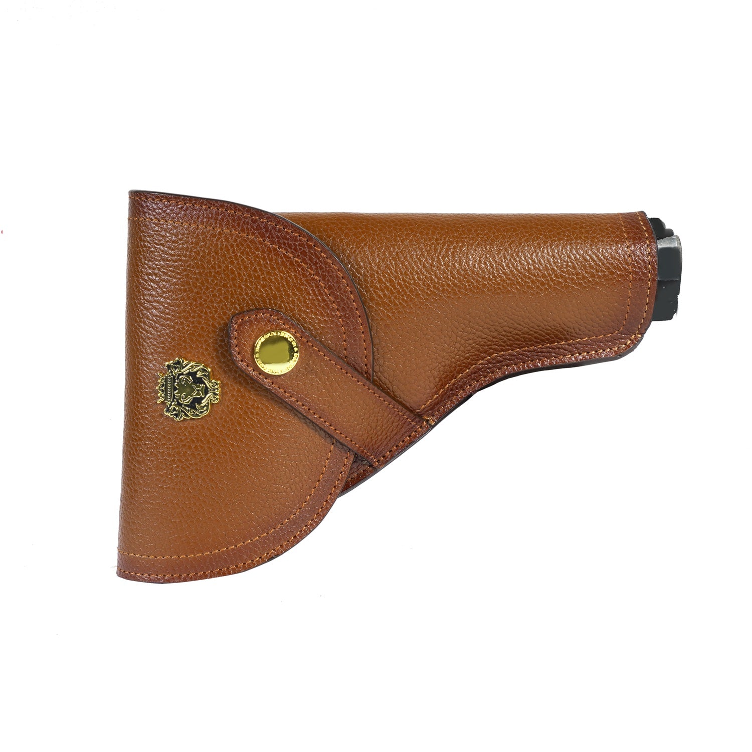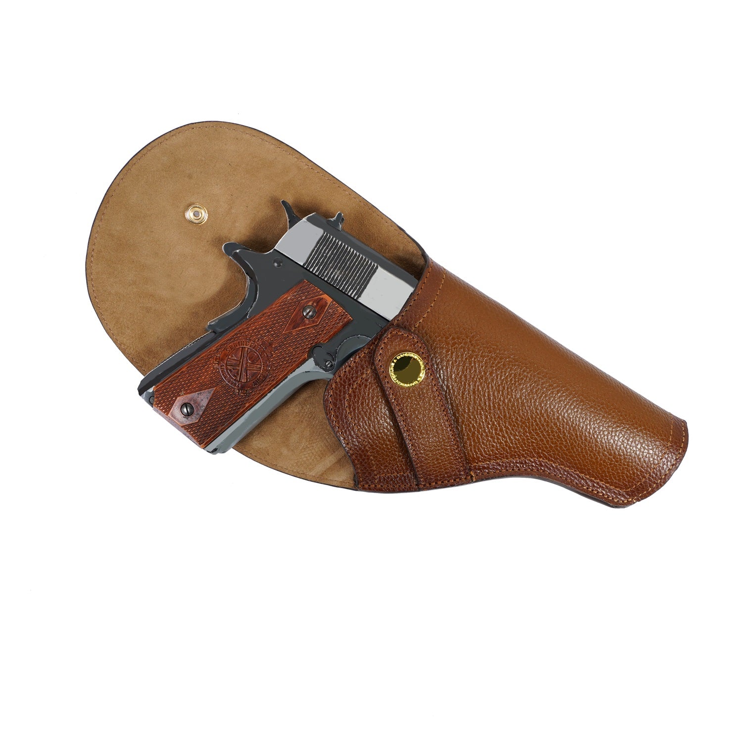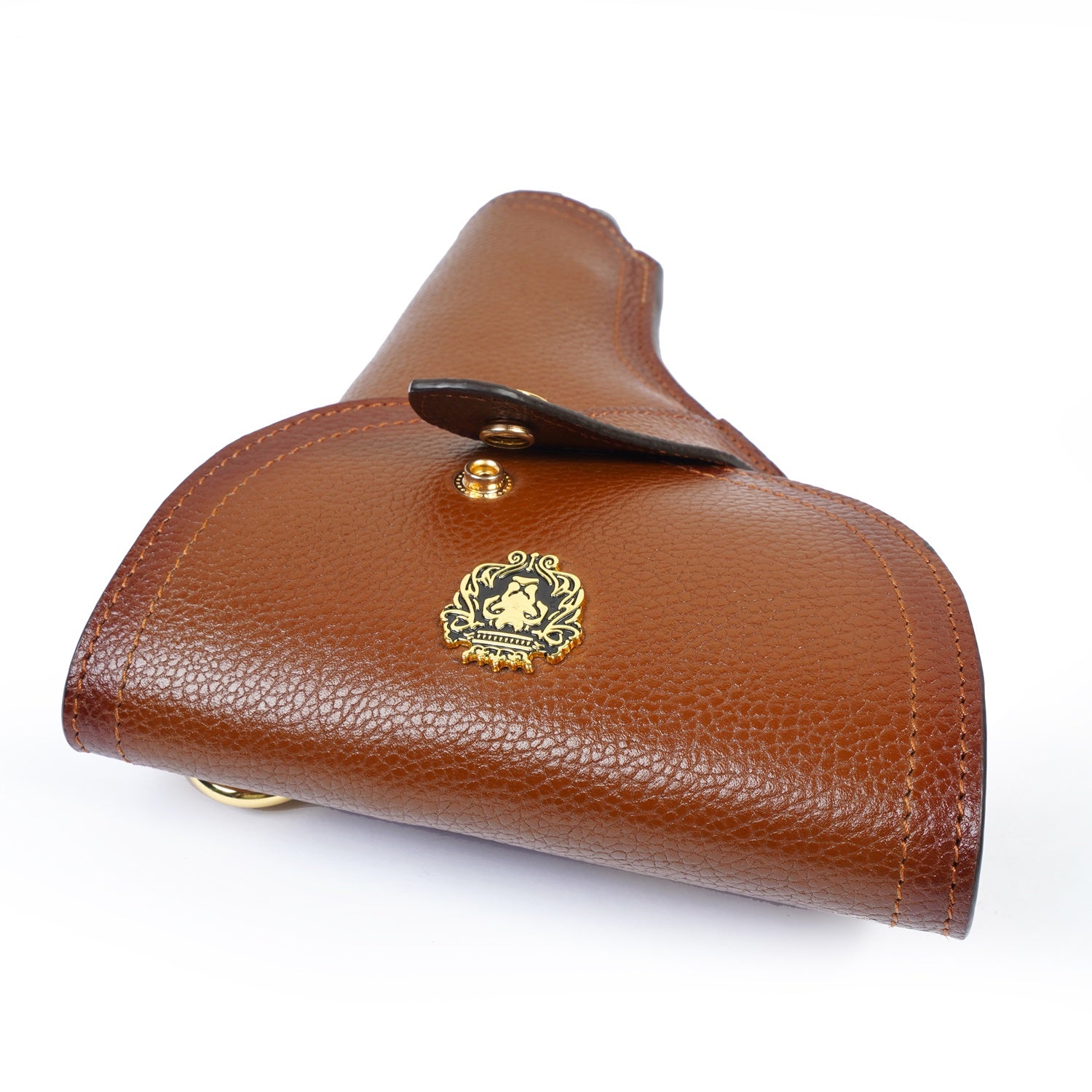 This Tan .45 revolver cover is crafted with full grain leather. The flap-over design provides the extra safety layer to it. The bullets holder on the holster & strap enhances the design and access to the bullets.
