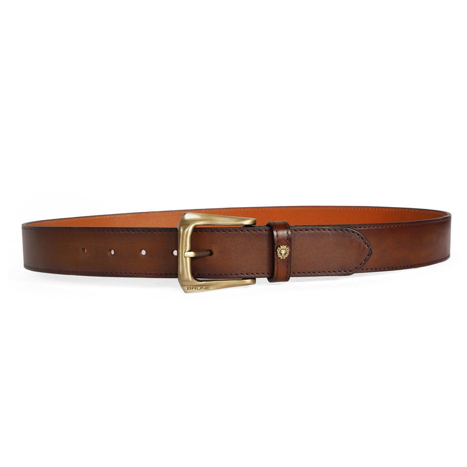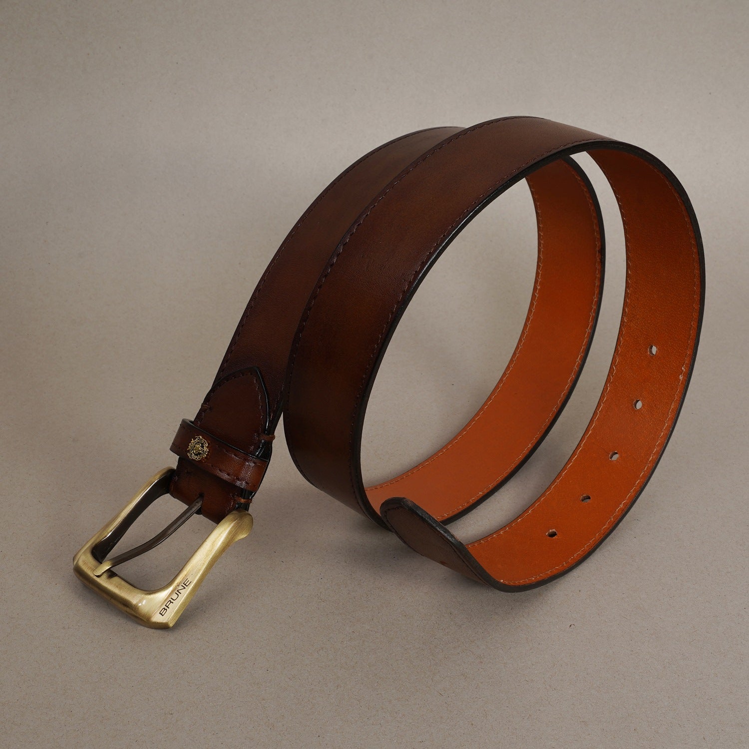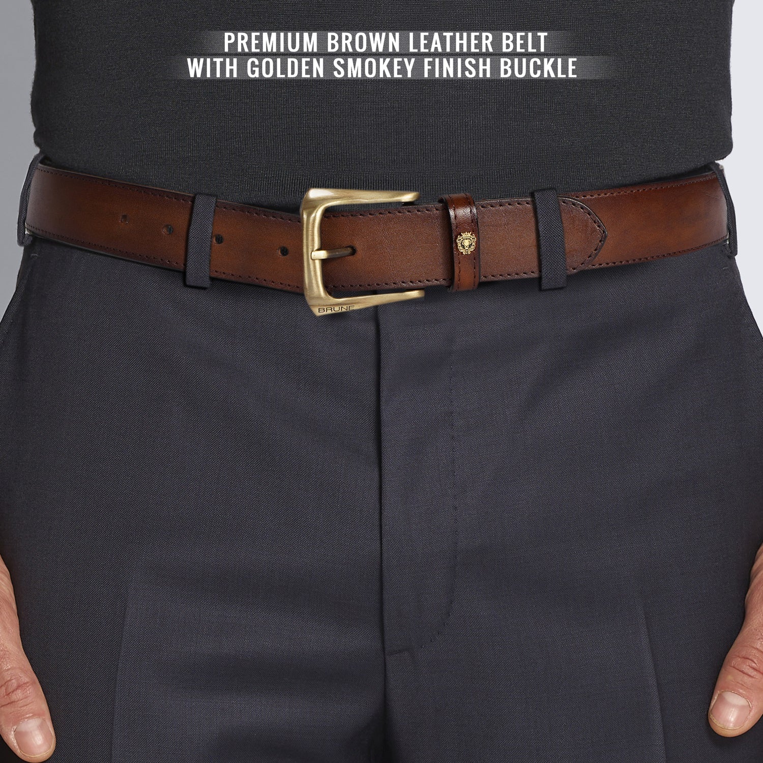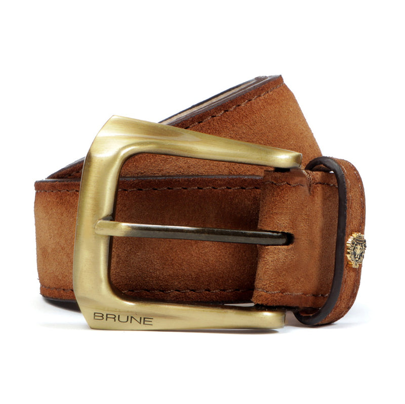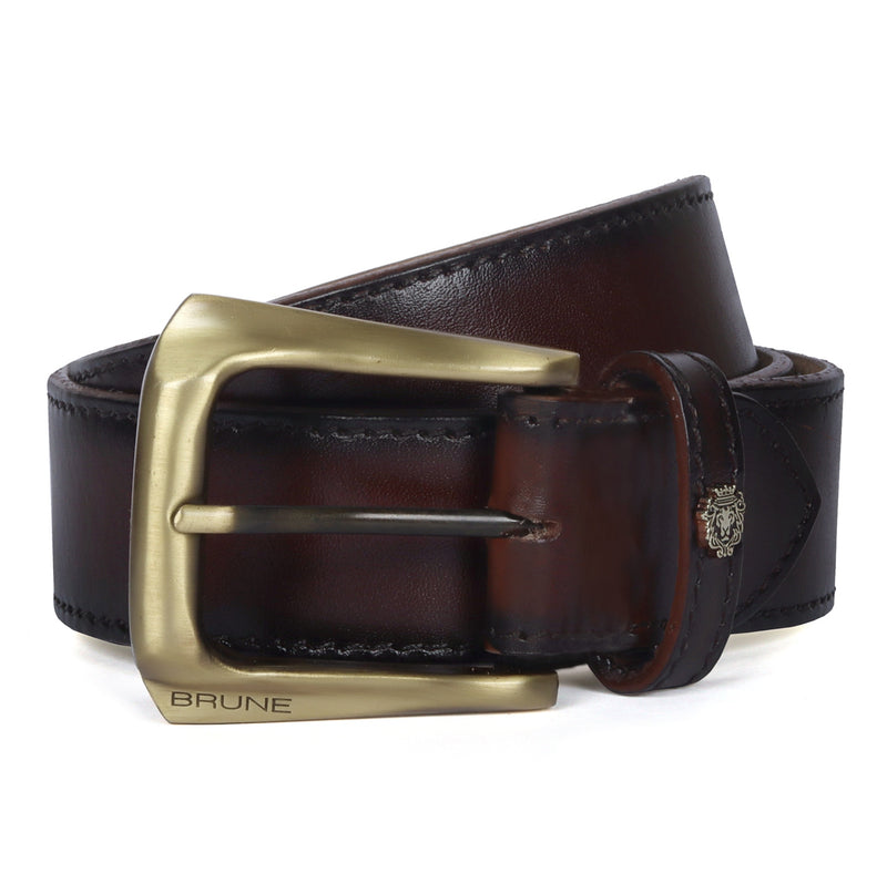 Brune & Bareskin's introducing special Design the Micro Size Lion Logo to add an extra elegance For different products. The Stylish Mini lion logo and Golden Slant Shape finished buckle enhances its appearance further. This Smokey finish Brown Hand Crafted Leather Formal belt for men ensures to keep you in comfort all day long. The artistic Smokey finish is achieved by our artisans with hand painting using the patina regime. This attractive belt ranks high on the latest Formal style to offer you well-deserved popularity. The Gold finished buckle enhances its appearance further. It can easily be teamed up with our suede leather shoes, wallet, card holders and other accessories.
