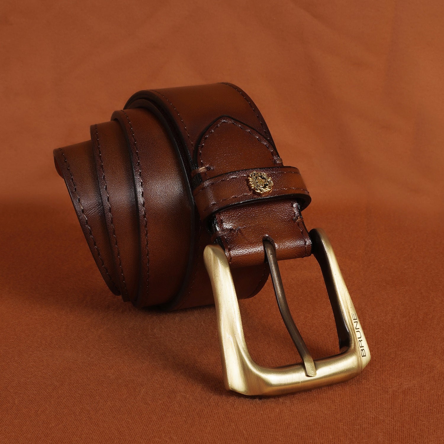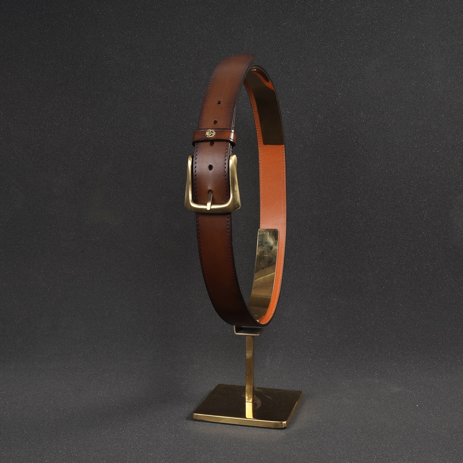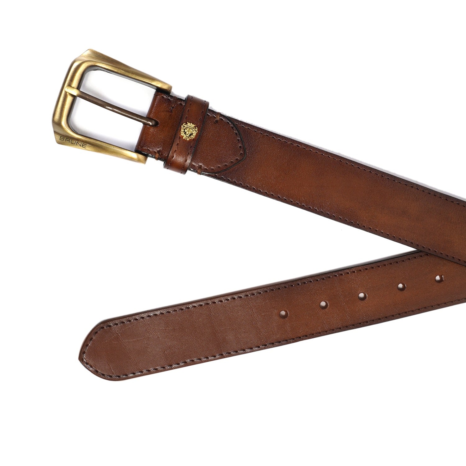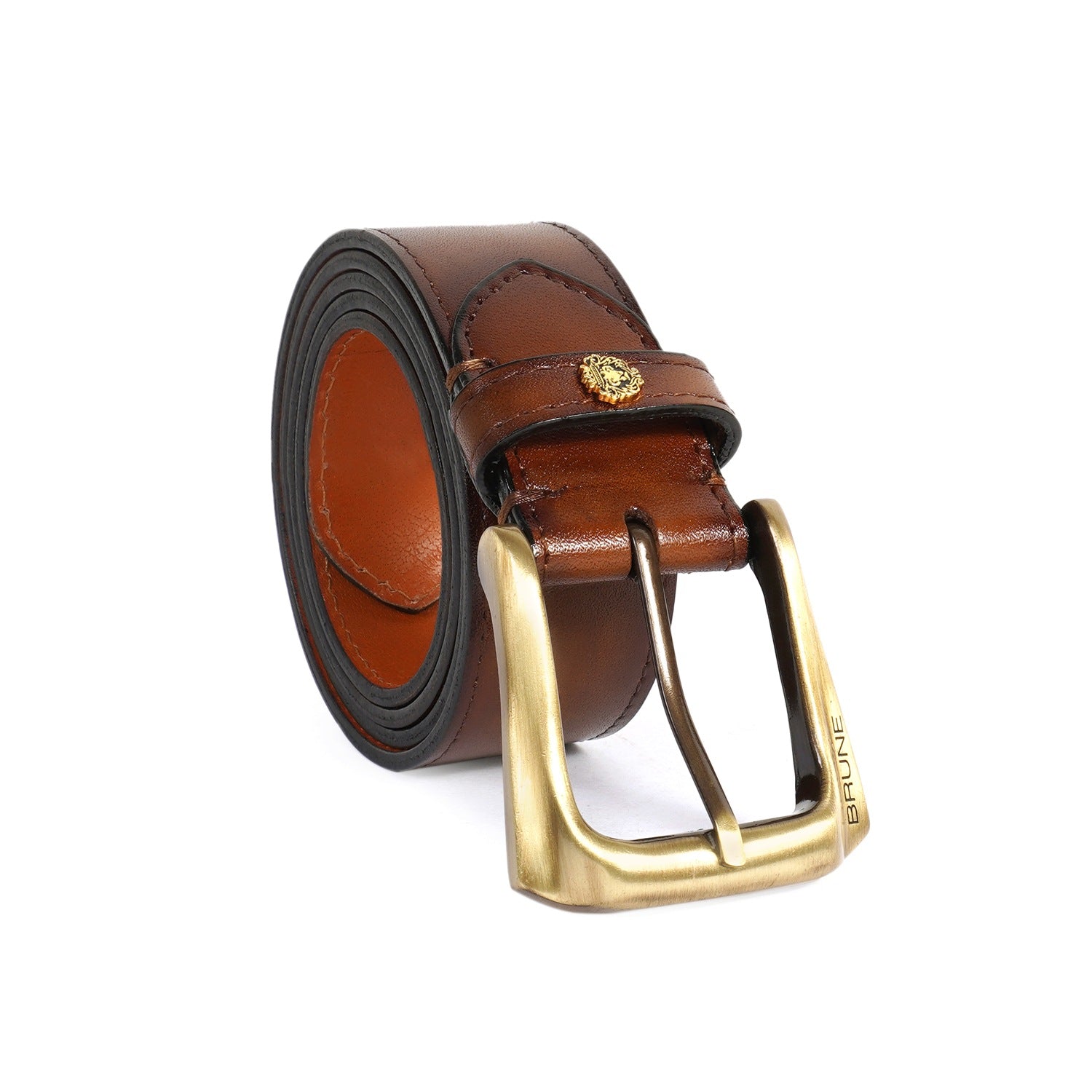Brune & Bareskin's introducing special Design the Micro Size Lion Logo to add an extra elegance For different products. The Stylish Mini lion logo and Golden Slant Shape finished buckle enhances its appearance further. This Smokey finish Brown Hand Crafted Leather Formal belt for men ensures to keep you in comfort all day long. The artistic Smokey finish is achieved by our artisans with hand painting using the patina regime. This attractive belt ranks high on the latest Formal style to offer you well-deserved popularity. The Gold finished buckle enhances its appearance further. It can easily be teamed up with our suede leather shoes, wallet, card holders and other accessories.