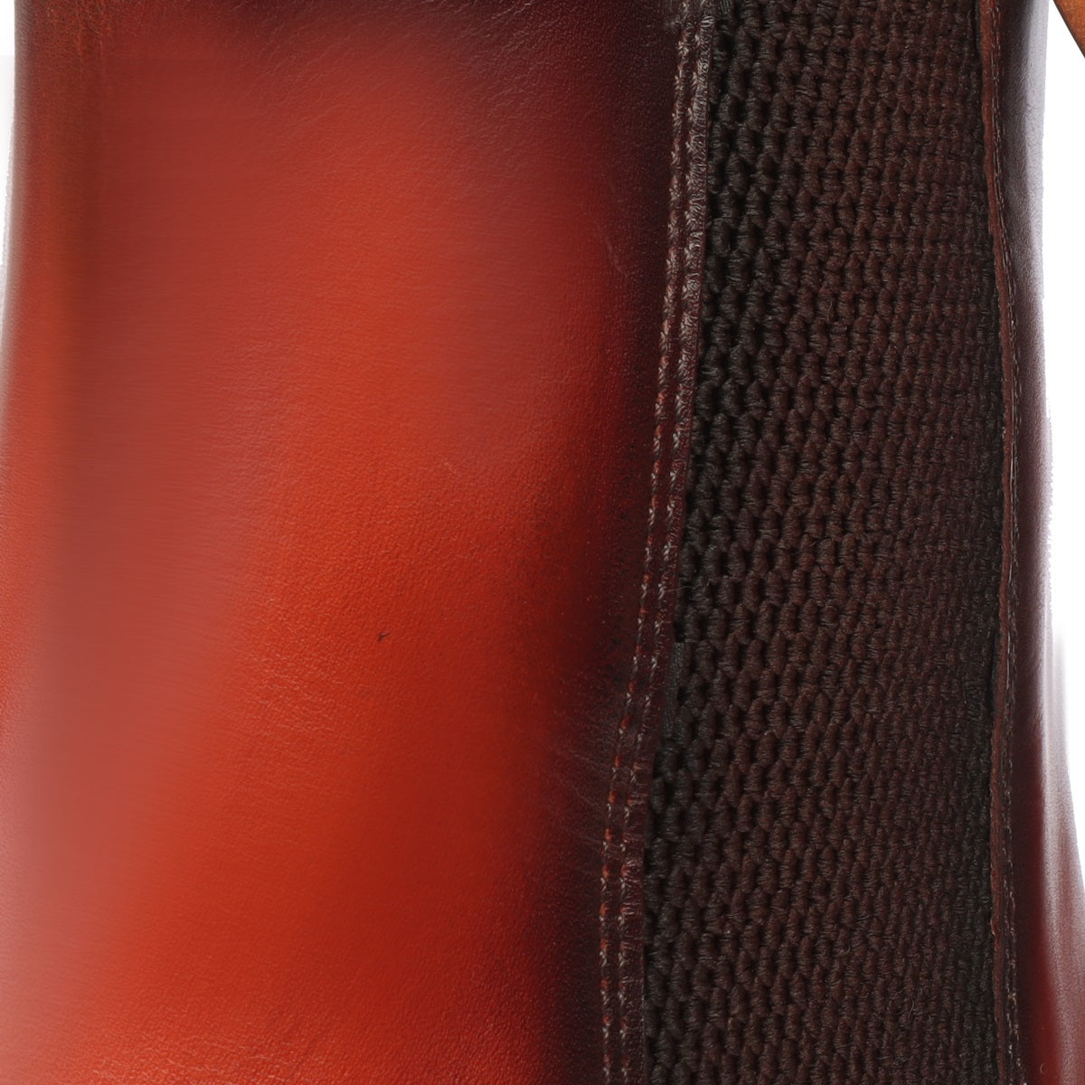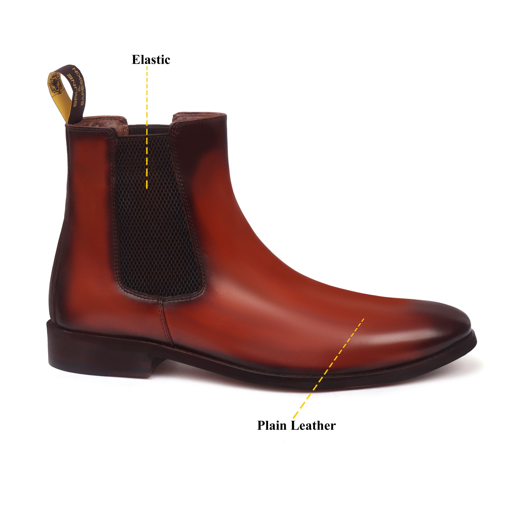 This high-ankle burnished Tan leather Chelsea Boots is a must need in your wardrobe. From the English times till today these just slow down in the fashion world. These leather boots are a perfect piece of style and trend. The tan genuine leather with leather sole looks very elegant. These ankle-length shoes are fitted shoes that emphasize the size and shape of your feet to perfection. This high-ankle length leather boots can be customized to your liking. The deep detailing with leather sole and the side elastic closure lend a classy look to these leather formal shoes. Wear it and make a remember-able mark of fashion. They are easy to team with formal trousers as they blend well with the classic fabrics as well as the modern blended synthetic fabric pants, slacks, trousers and boot cuts.
