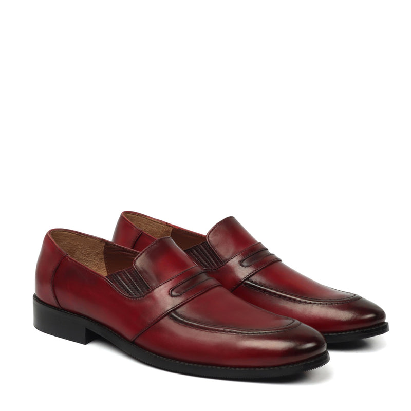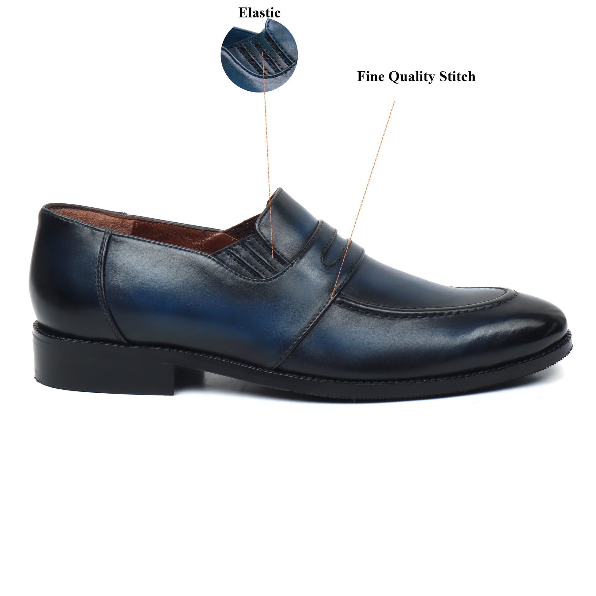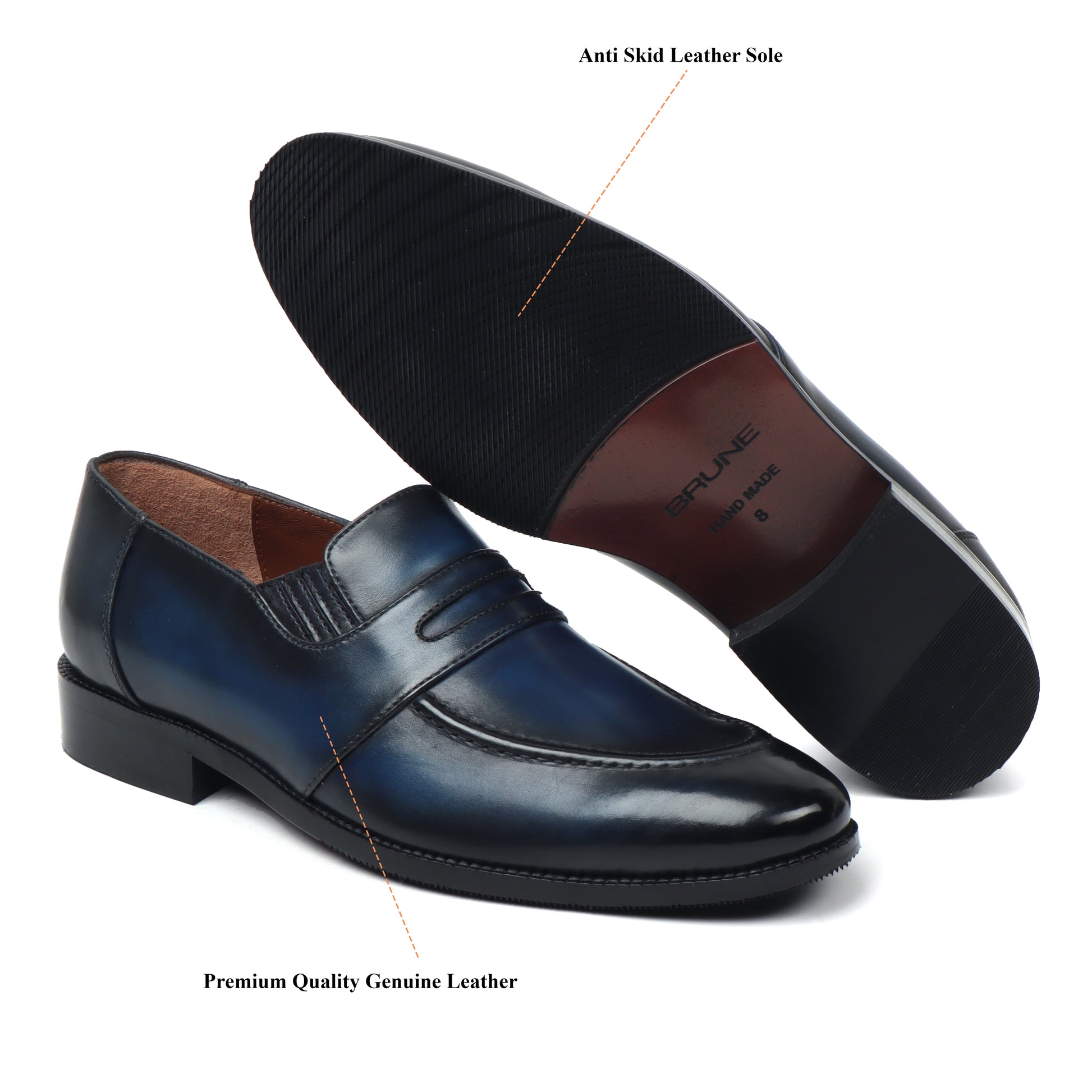 The round apron toe adds an element of perfect style while the rounded and narrow heel ensures a snug fit as well as foot balance. A modern twist on the classic penny loafers shoe that combines soft and supple leather, choose to wear this pair of handcrafted leather shoes by BRUNE & BARESKIN. The pointed toe is burnished darker tone of blue to give it a superior look. The lazy man shoe style is crafted especially for easy and fast wearability. The elastic covered with leather pieces provides a seamless look to it. This Shoe is entirely handcrafted by our expertise. Features Penny Loafer closure which helps to wear this vogue beauty effortlessly. The extra padded insole gives that extra cushiony comfort which helps to wear this for long. You can team up this Brune & Bareskin exclusive pair with formals & casual attires.