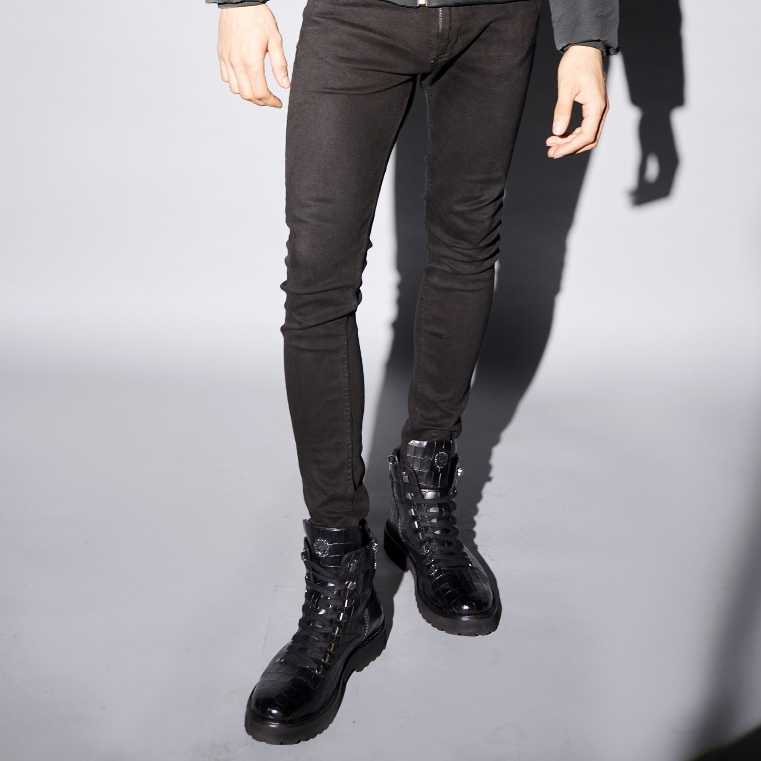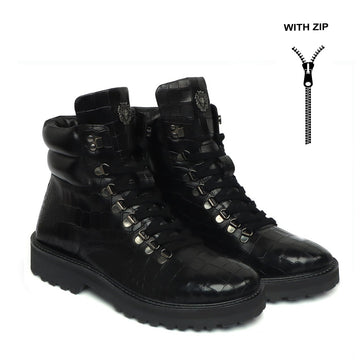 Light Weight Biker Boots in Black Deep Cut Croco Textured Leather with zipper Closure