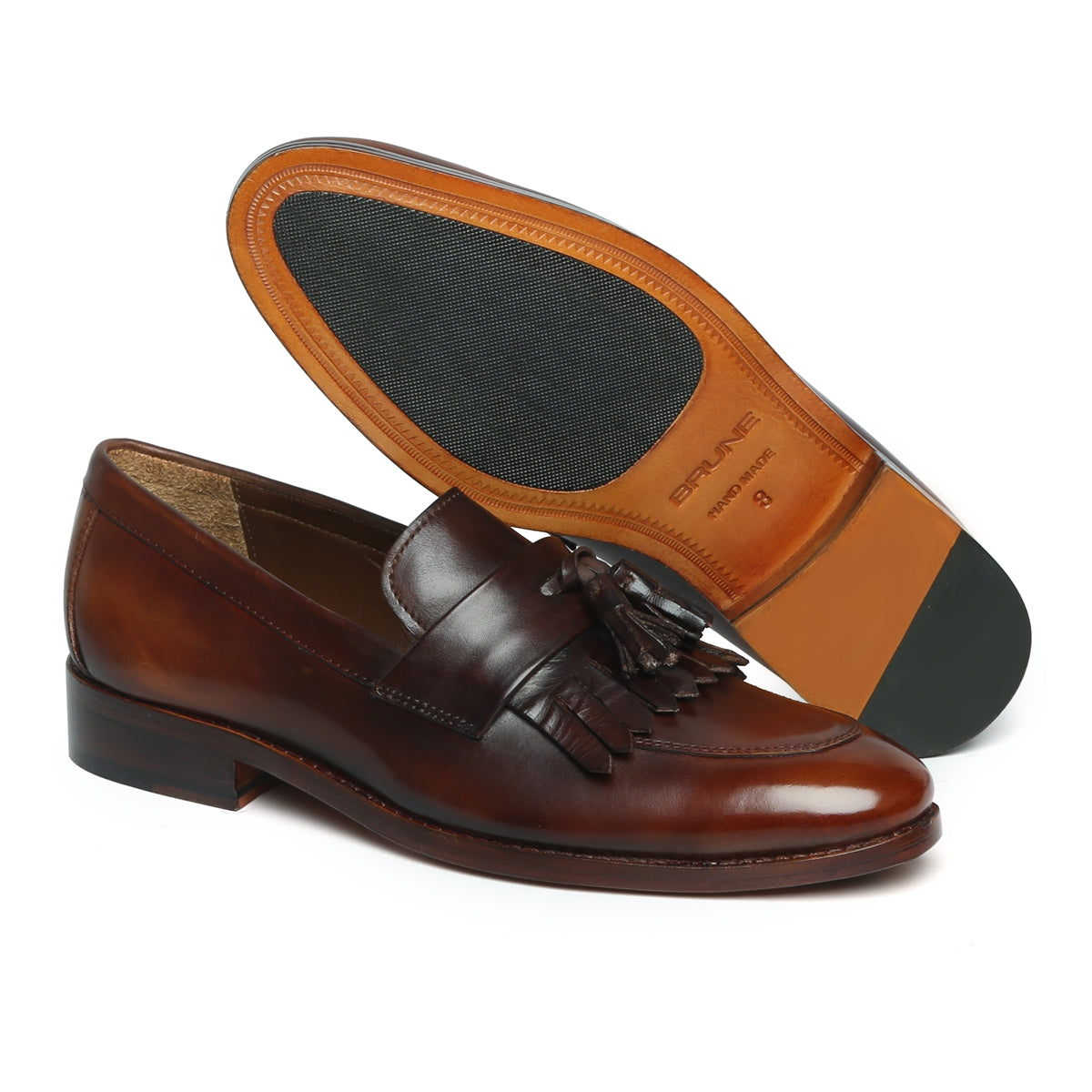 Brune & Bareskin knows to bring something stylish and convenient to the customers. The same with these pair of shoes. These shoes are made up of pure leather with the idea of comfortability and vogue in mind. Two toned brown color and fringes with tassel segregate it from cluster. Apron toe maintains its classic dapper look. You can easily match these pairs with most of the attires. Slip on closure and cushioned foot-bed makes it convenient to wear all day long