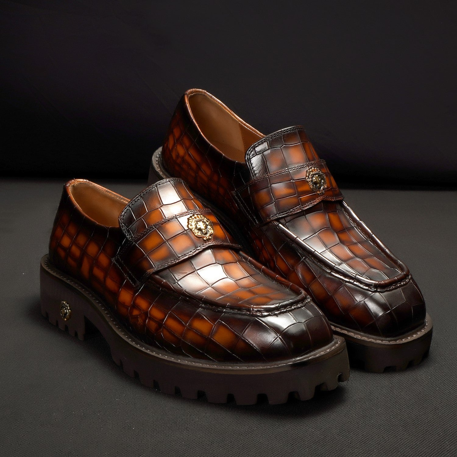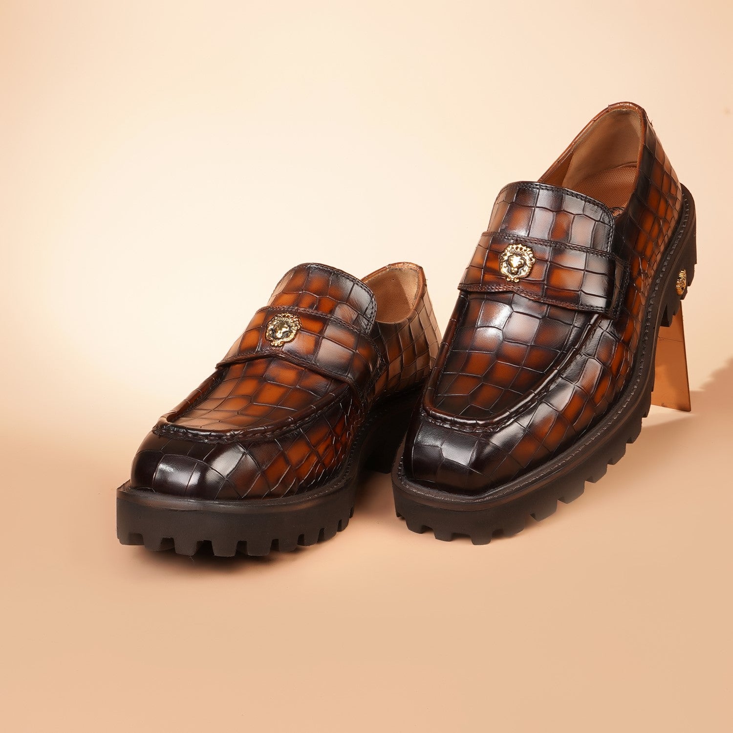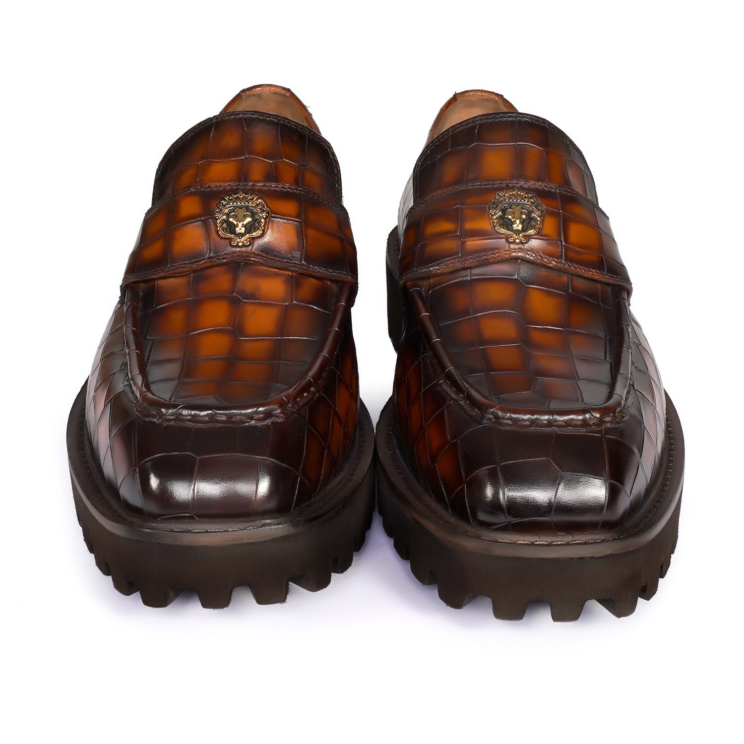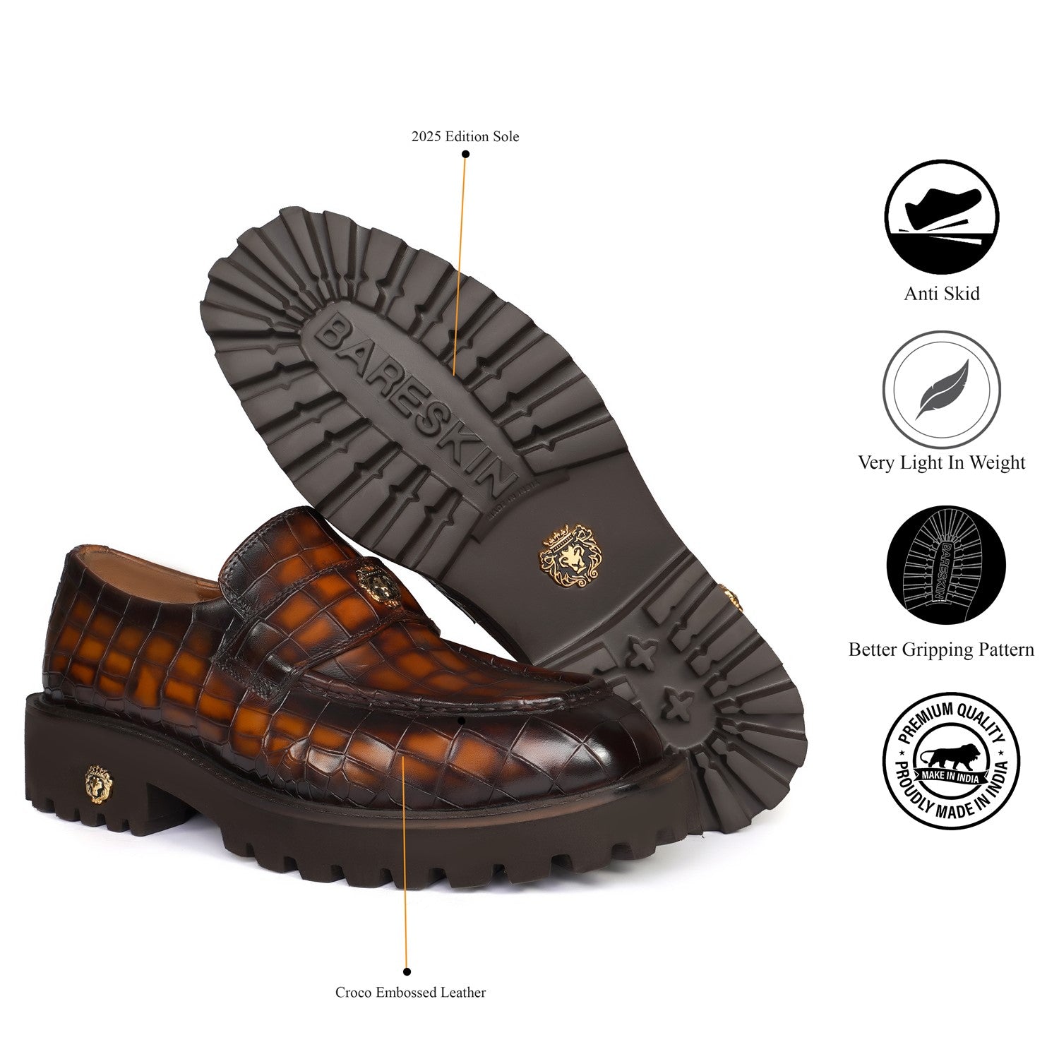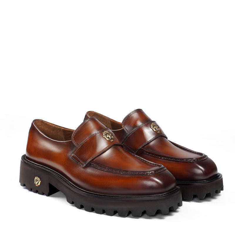 Brune & Bareskin 2025 Edition loafers redefine casual luxury with burnished tan embossed full-grain leather. The light weight chunky platform sole delivers elevated stance and all-day comfort, featuring an anti-skid grip pattern for superior traction on urban streets or slick surfaces.