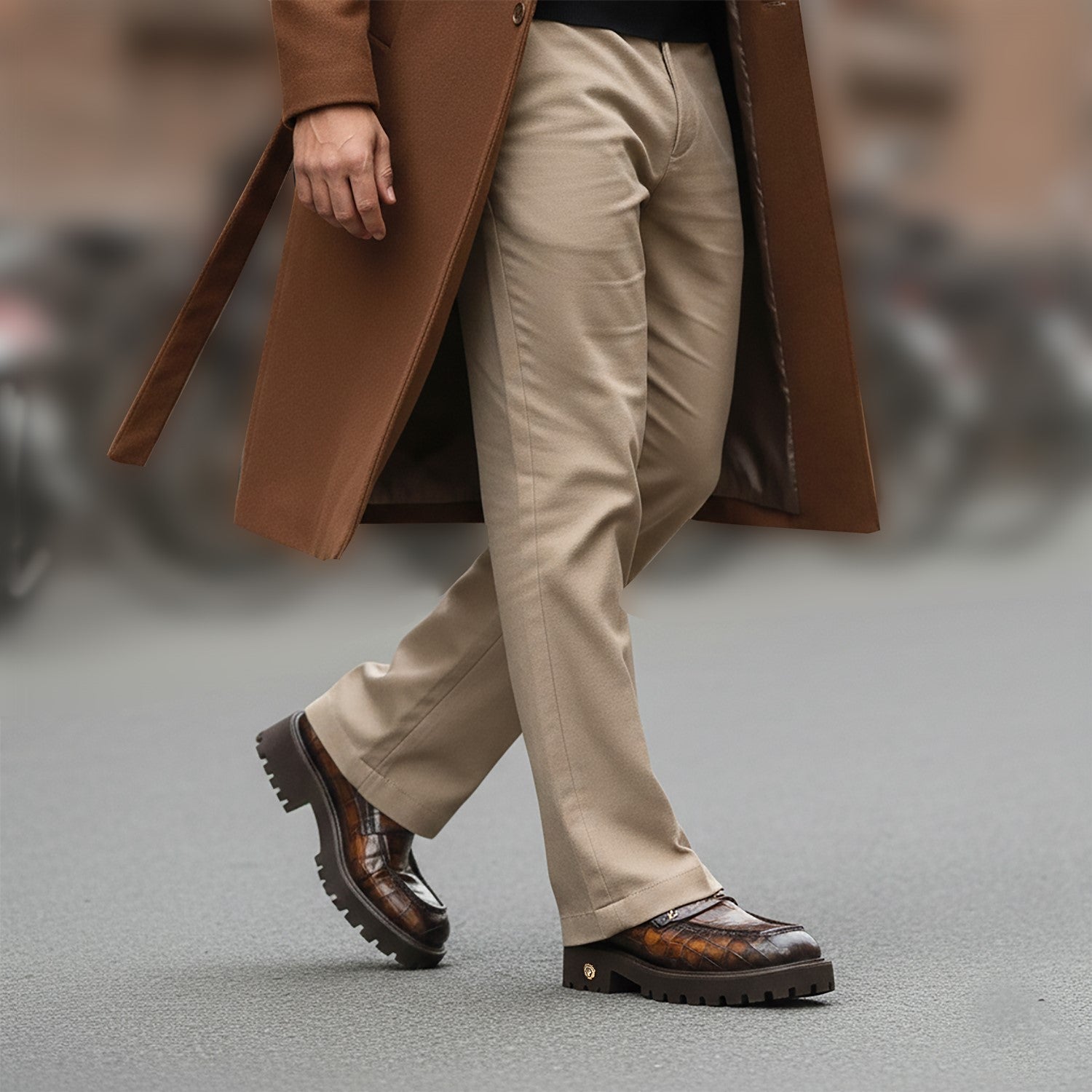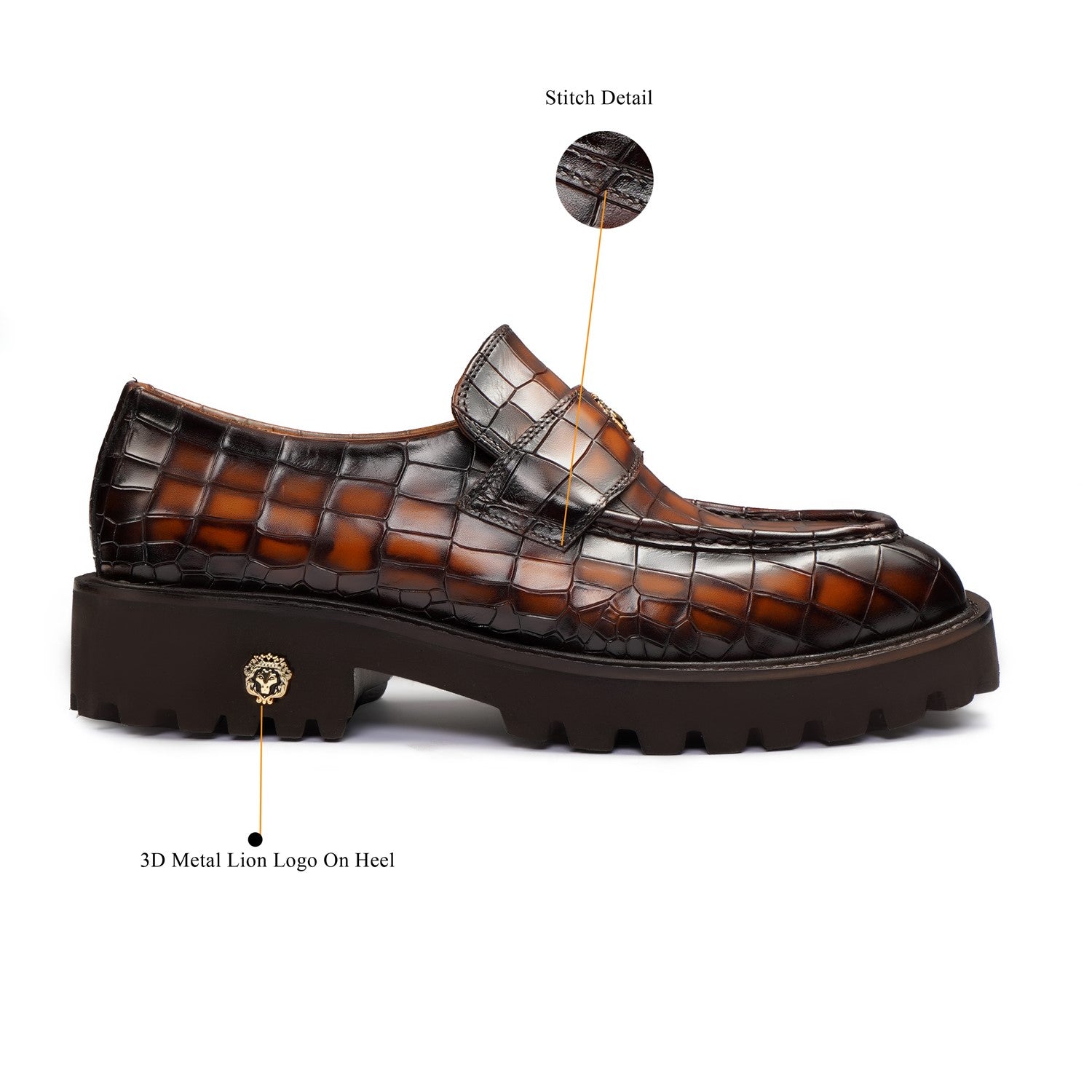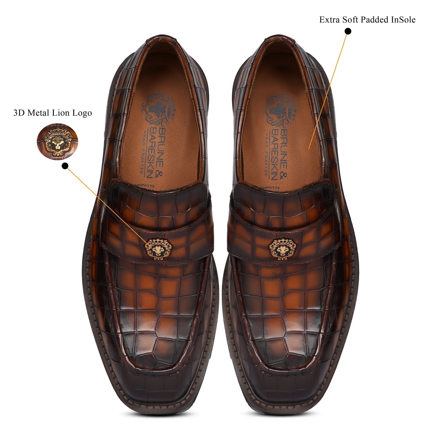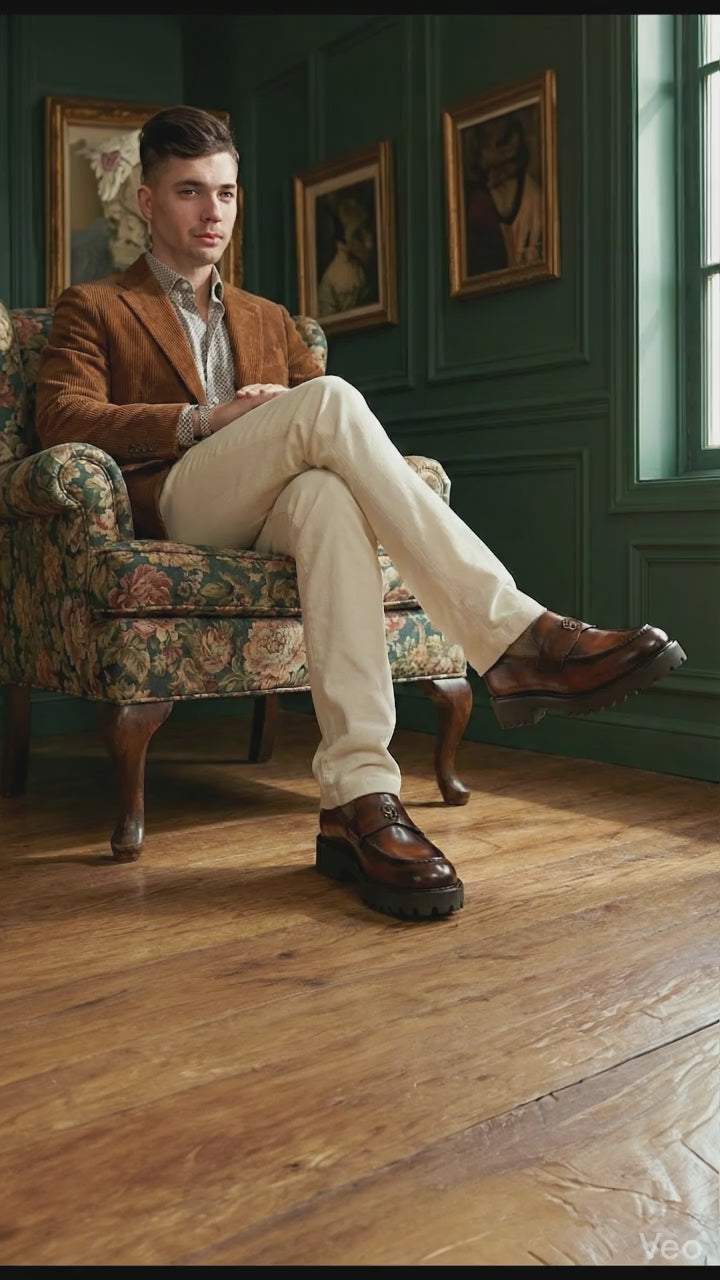 Brune & Bareskin 2025 Edition loafers redefine casual luxury with burnished tan embossed full-grain leather. The light weight chunky platform sole delivers elevated stance and all-day comfort, featuring an anti-skid grip pattern for superior traction on urban streets or slick surfaces.