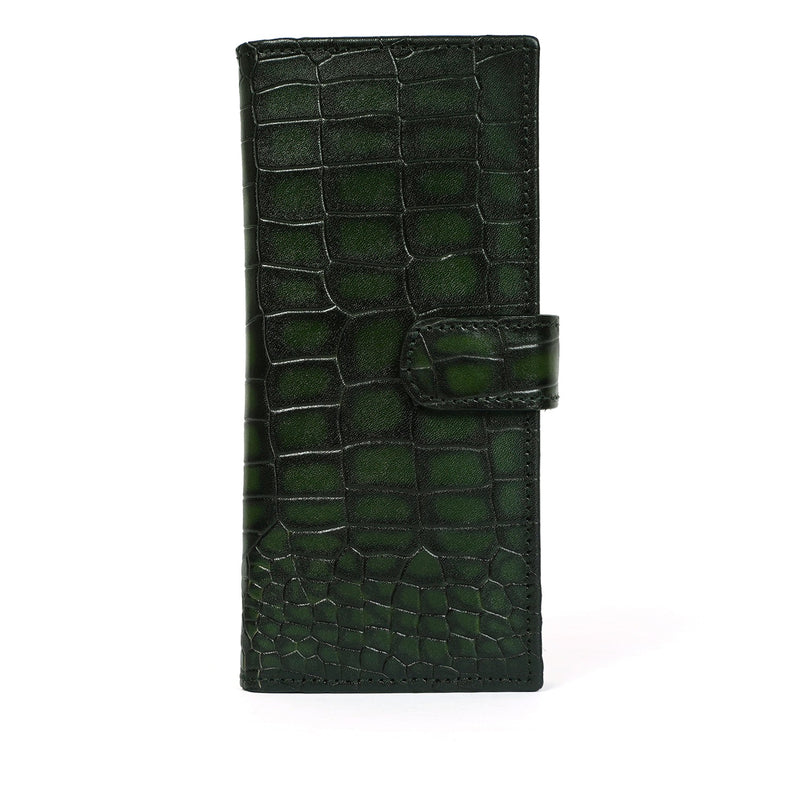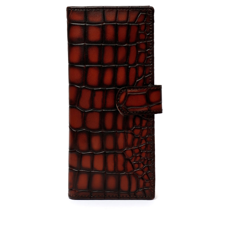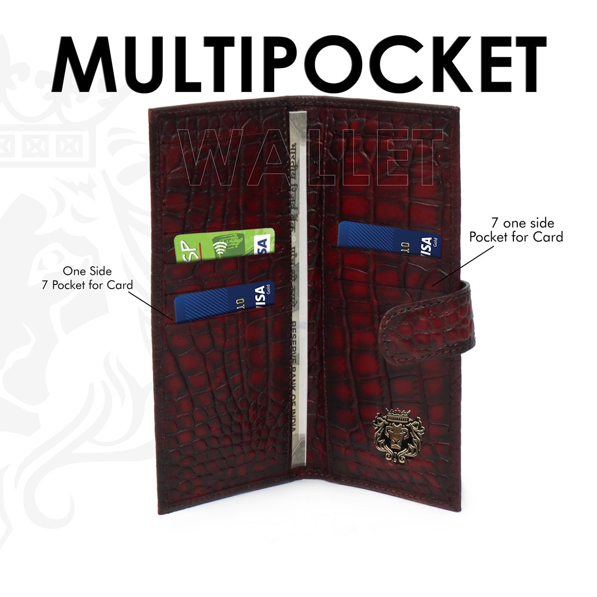 This bi-fold wine Croco print leather long wallet with contrasting smudged edges looks very elegant. The BRUNE & BARESKIN signature metal Lion logo appears on the opening of the wallet. The bi-fold opening wallet features two main pockets along with a small security pocket on both sides. It has a total of 16 pockets, which makes it a perfect buy for today's generation. It has a smooth magnetic strap to keep it close and secure enough. It provides the style and storage with Patina regime leather shades.