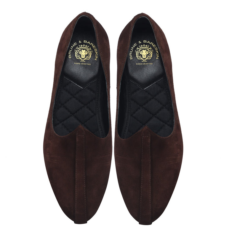 Elevate your look with the camel jalsa jutti in Suede Leather from Brune & Bareskin. This handmade design offers an anti-skid sole and a super soft inner sole for superior comfort. The real suede leather and lightweight construction add to the stylish look and luxurious feel. Add a touch of sophistication to any outfit with these exquisite juttis. You just don't wear to Brune & Bareskin Jalsa to Look Good, you wear them, Because it emphasis your dapper side out. Pair these Ethnic Jutty's with Kurta, Sherwani and be the show-stopper at any party. You can get it customized with your name initials with our Bespoke services.