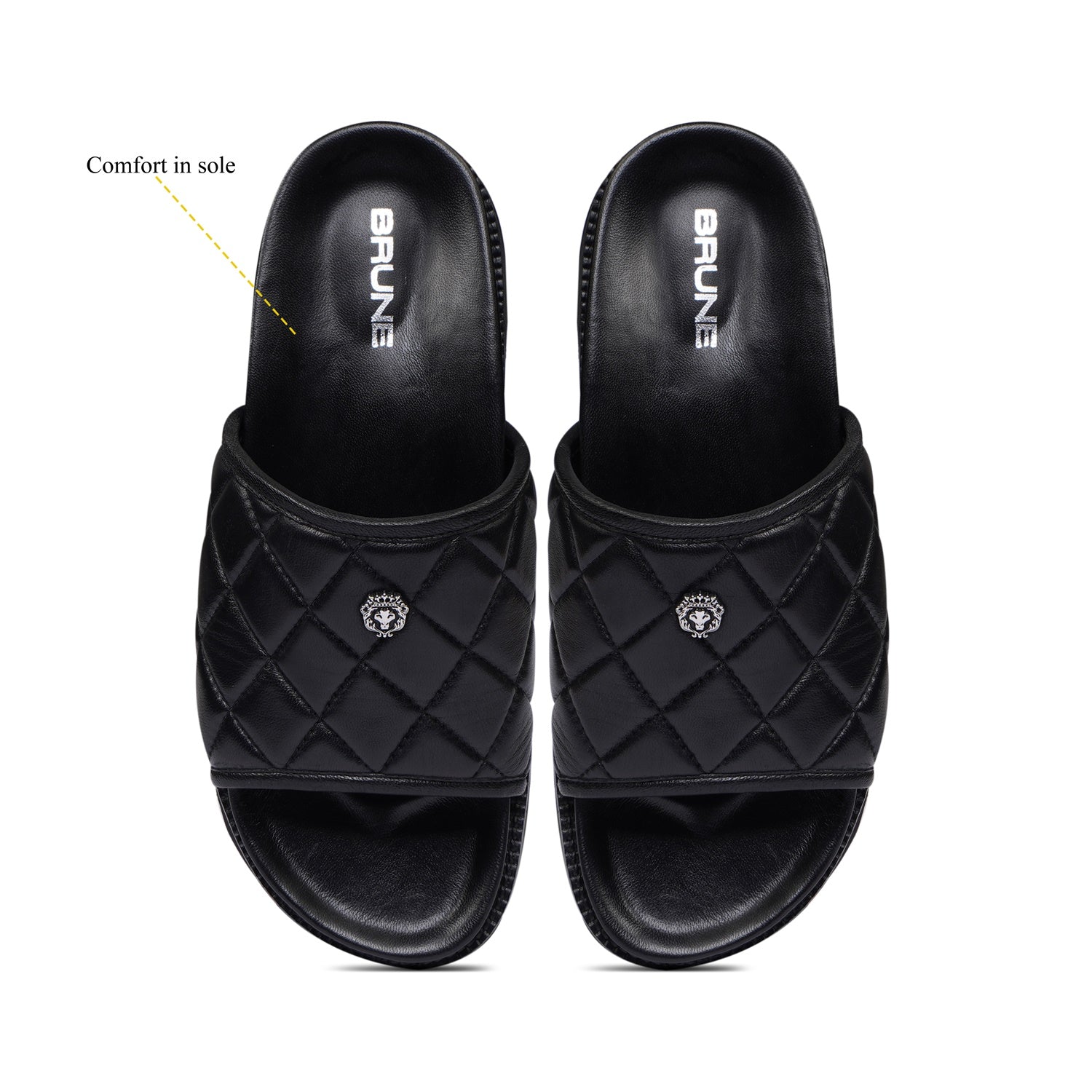 Brune & Bareskin's New Super Chunky Collection is here. It is the best blend of our most popular Chunky Sole and Deep Cup Footbed. The extra comfy and super soft Leather Slides are perfect for the season. The whole diamond stitched leather base is designed to provide you cushion effect while walking. It has the memory foam in the base which helps to retain it's quilted design. This pair will complement your entire collection of casual attire. These slippers are must buy to be on-board with vogue and ease. Anti-Skid outer sole ensures the perfect walking grip.