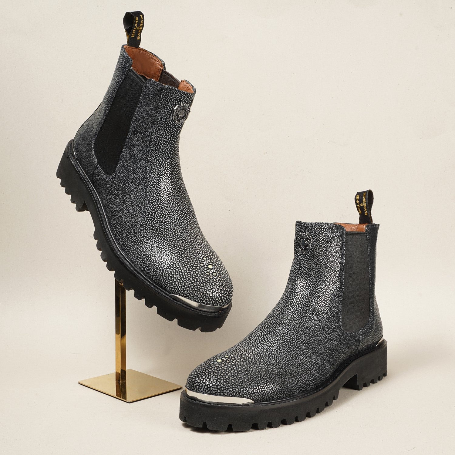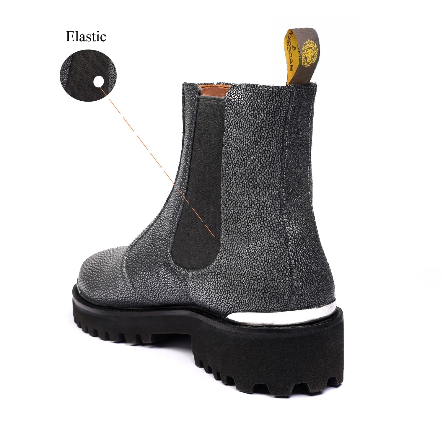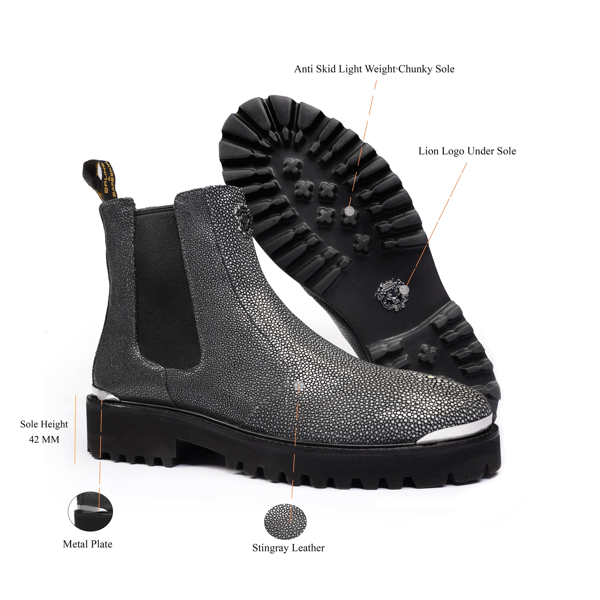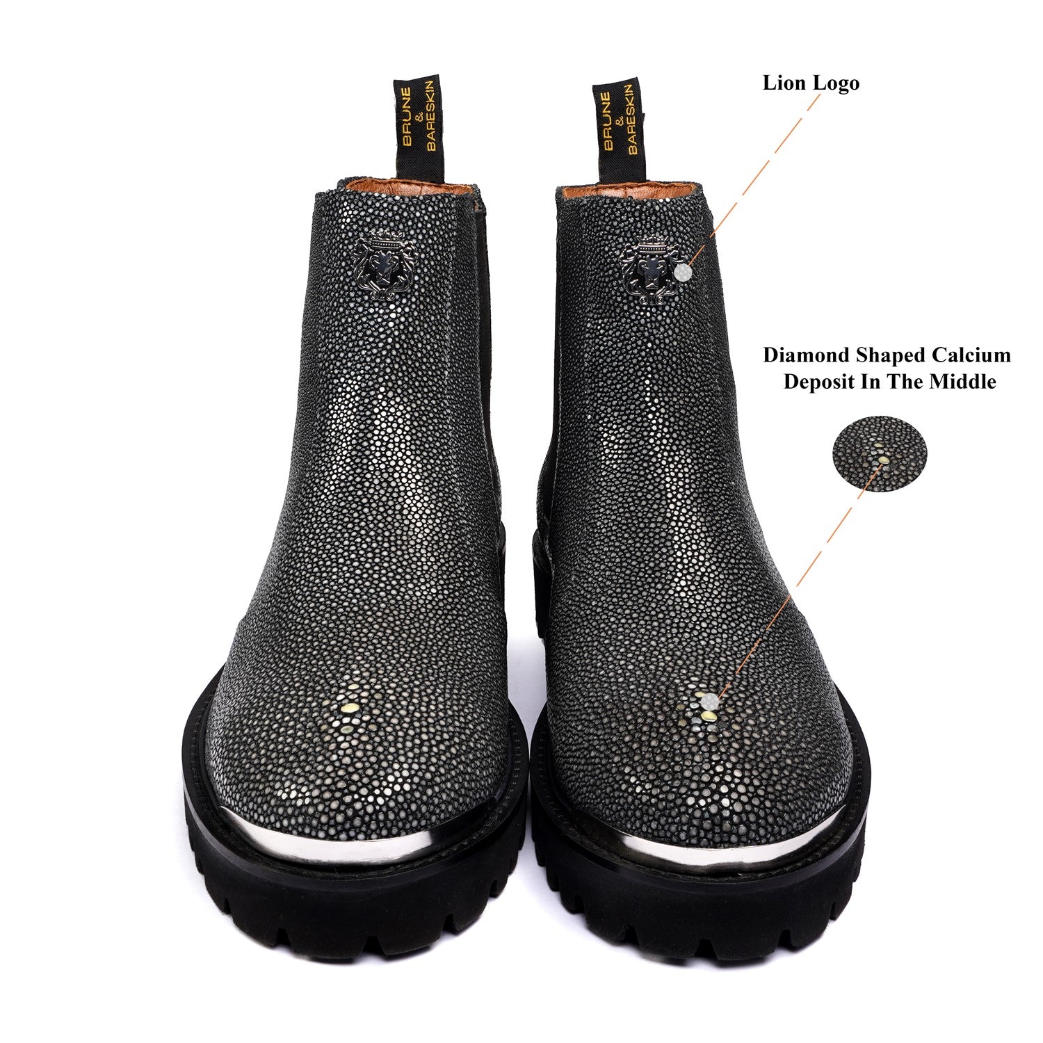 Fastening and Sole: The side silver zip fastening ensures easy wear and removal, allowing you to slip into these boots effortlessly. Additionally, the anti-skid sole provides excellent traction, ensuring stability on various surfaces. The sole boasts a distinct lion logo design, representing the "Brune & Bareskin" brand's identity, while a mini silver lion logo adds a touch of elegance.