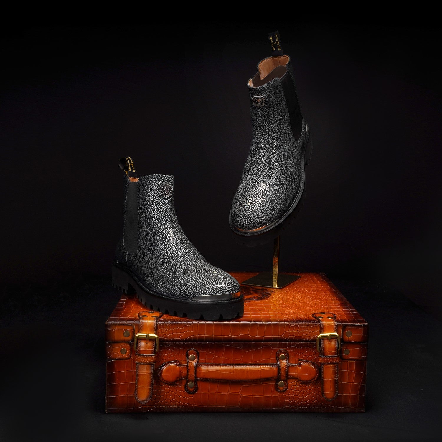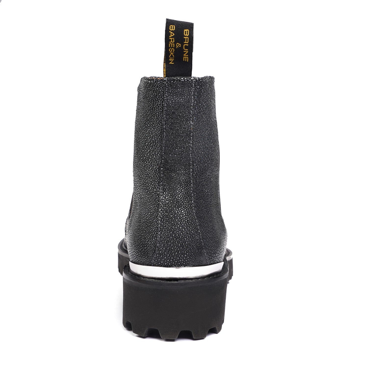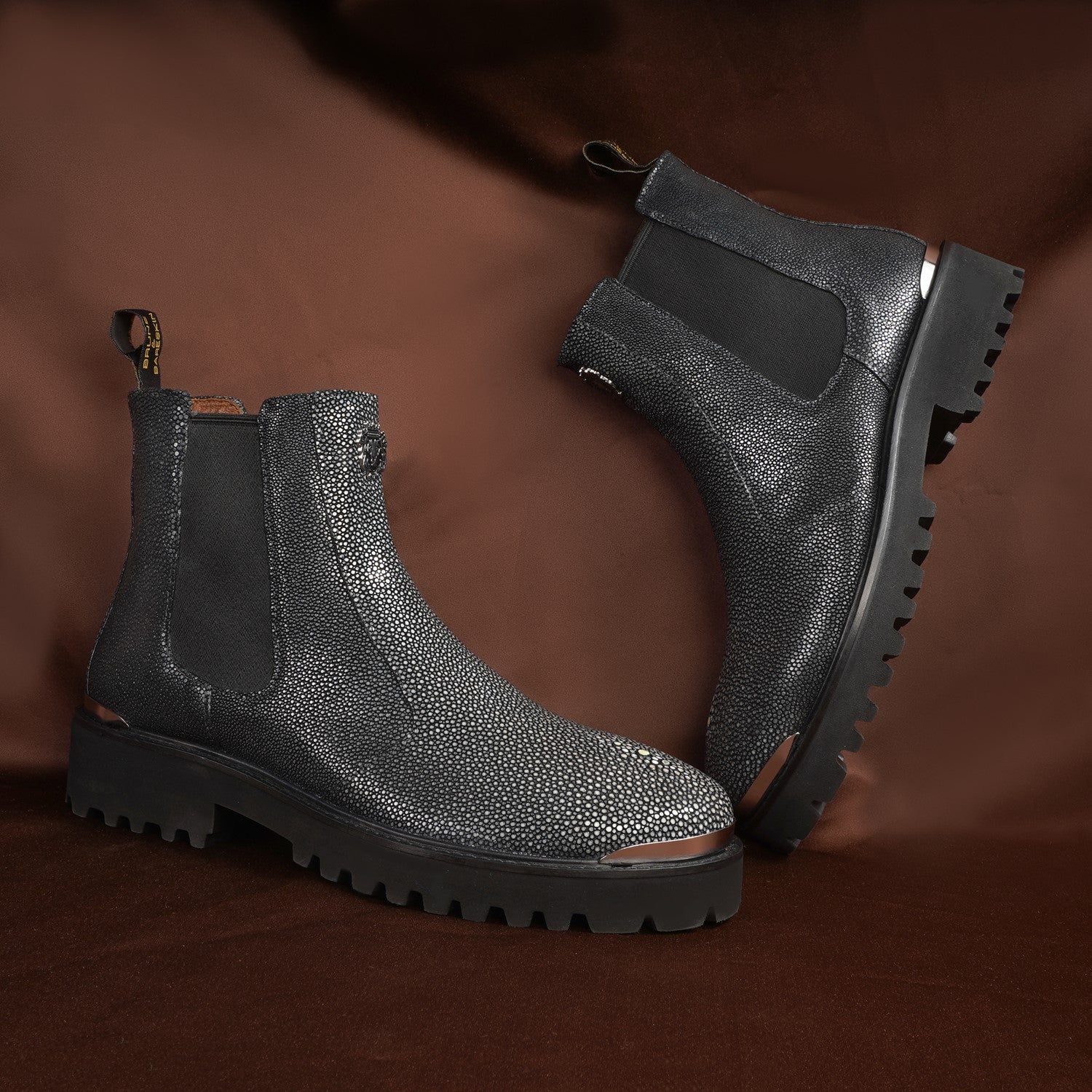 Indulge in the elegance and comfort of the "Brune & Bareskin" exotic stingray fish leather boots and make a statement with each stride you take. Elevate your style and experience the art of luxury footwear with these exceptional handcrafted boots.