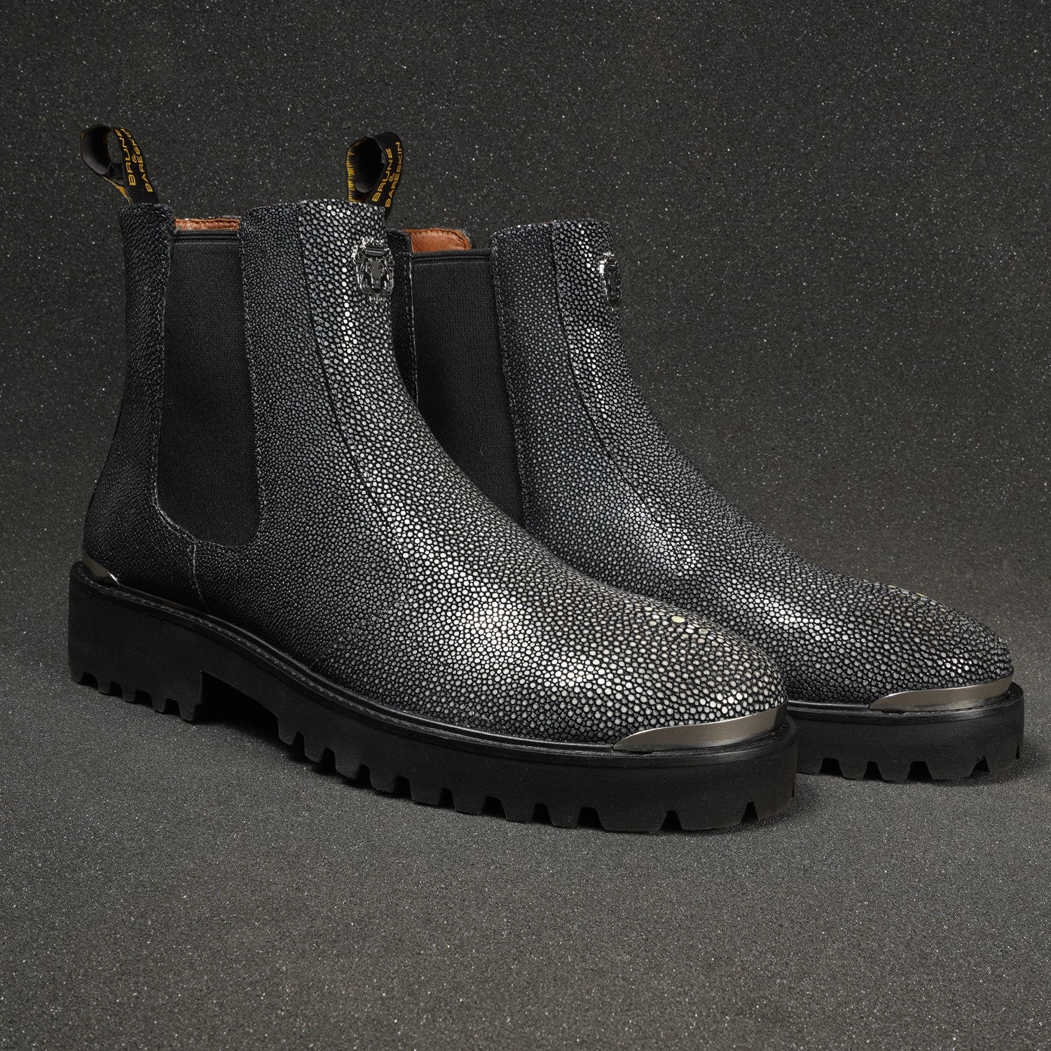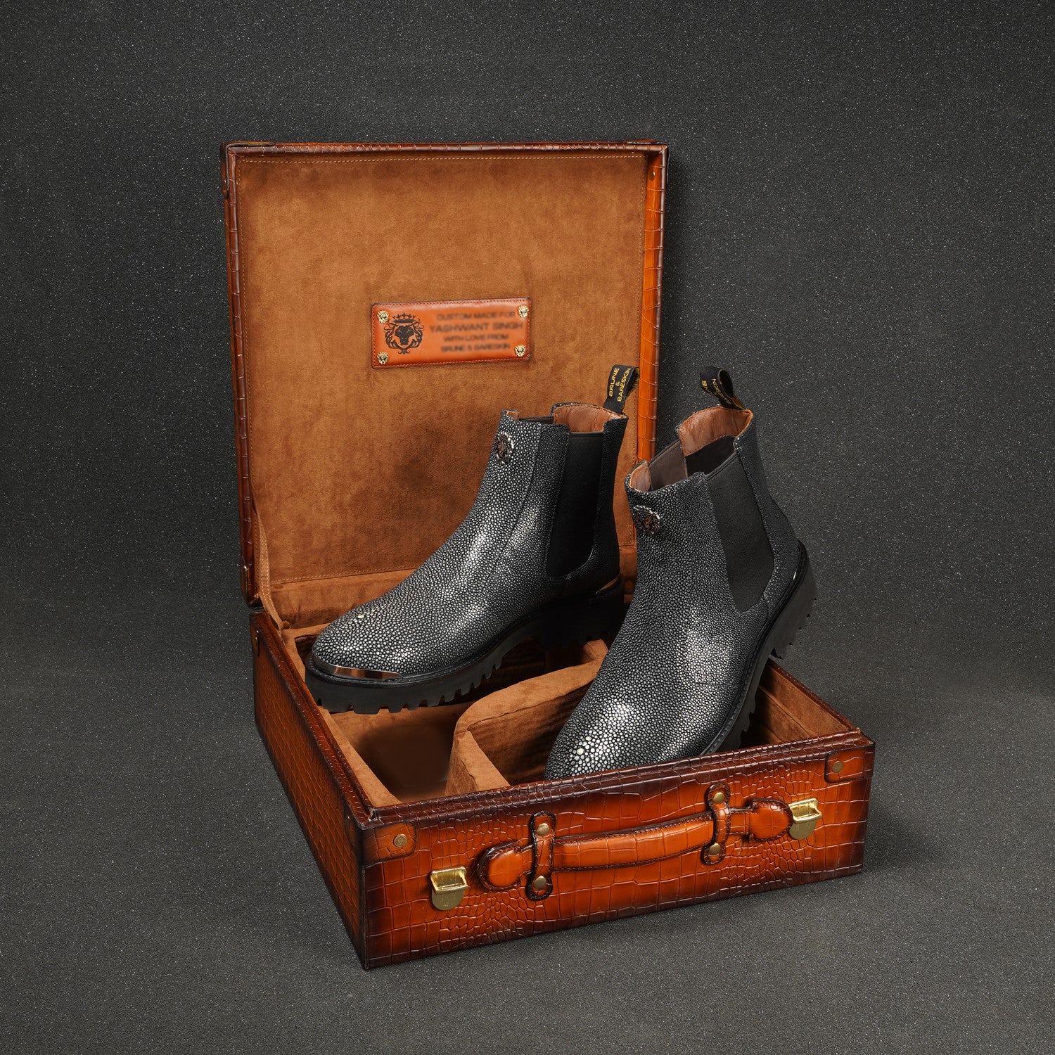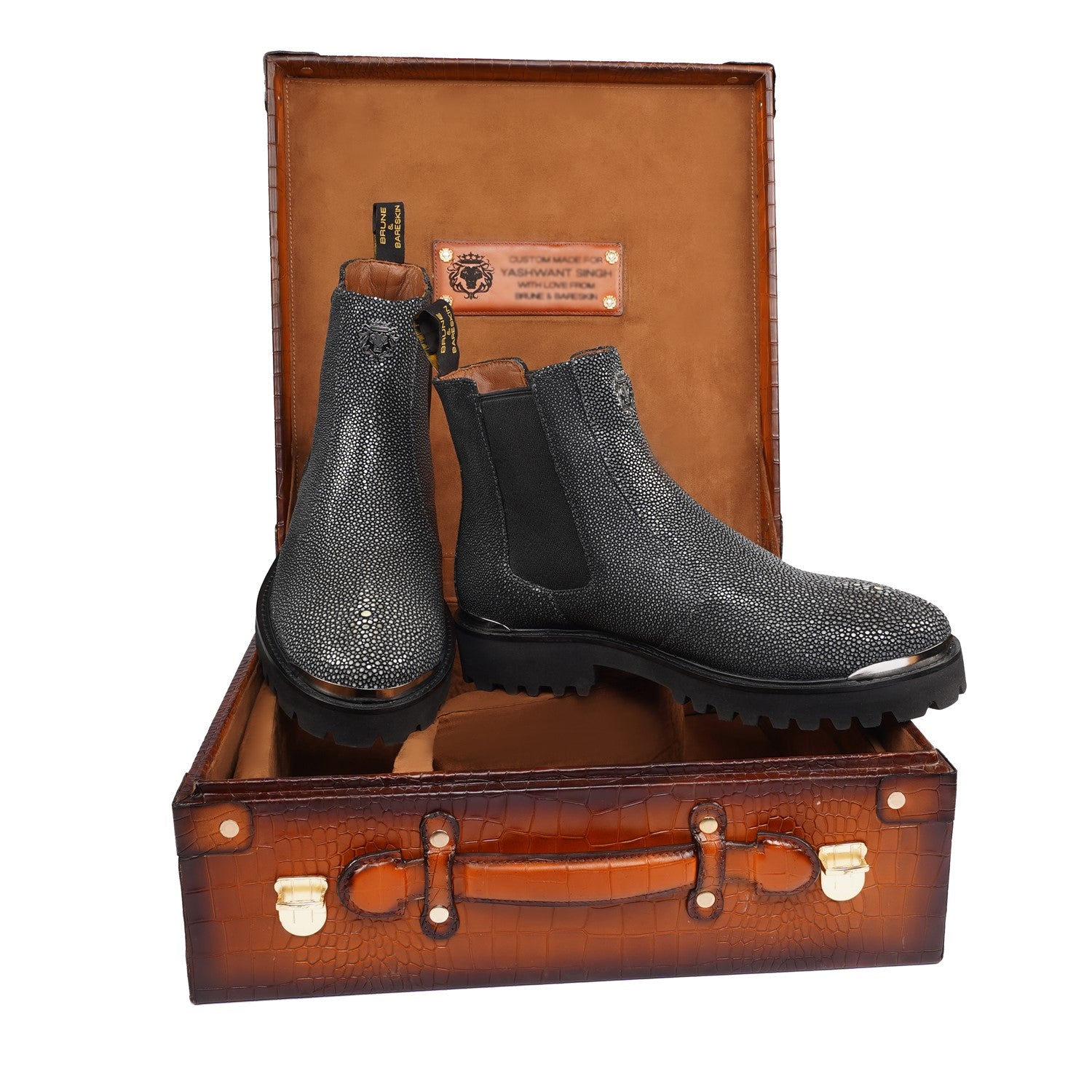 Indulge in the elegance and comfort of the "Brune & Bareskin" exotic stingray fish leather boots and make a statement with each stride you take. Elevate your style and experience the art of luxury footwear with these exceptional handcrafted boots.