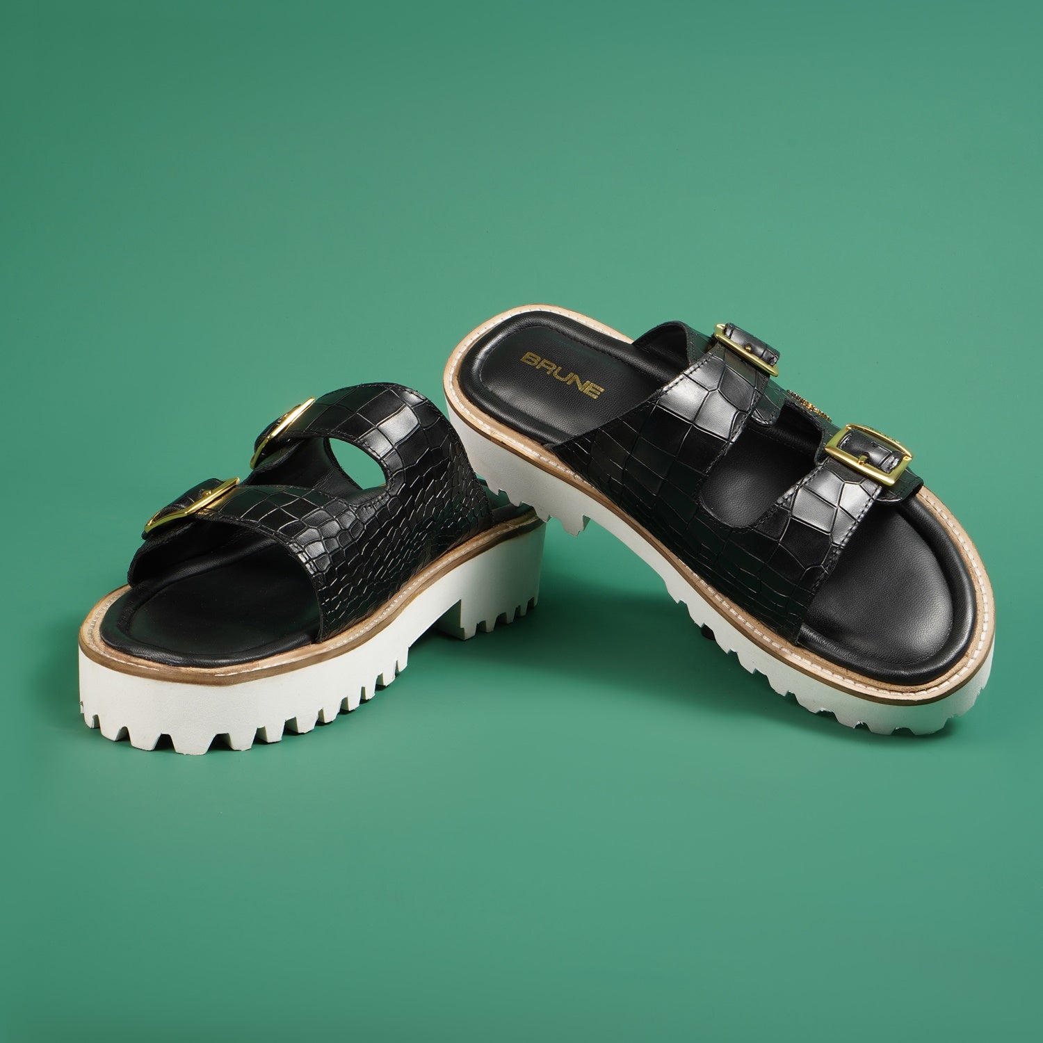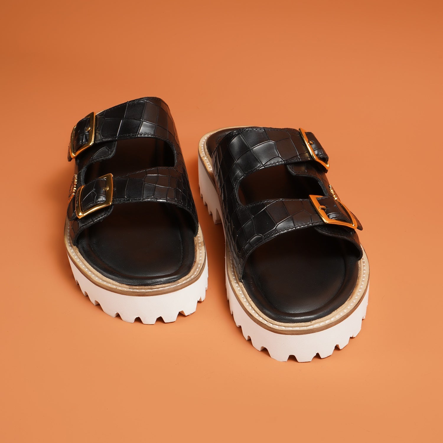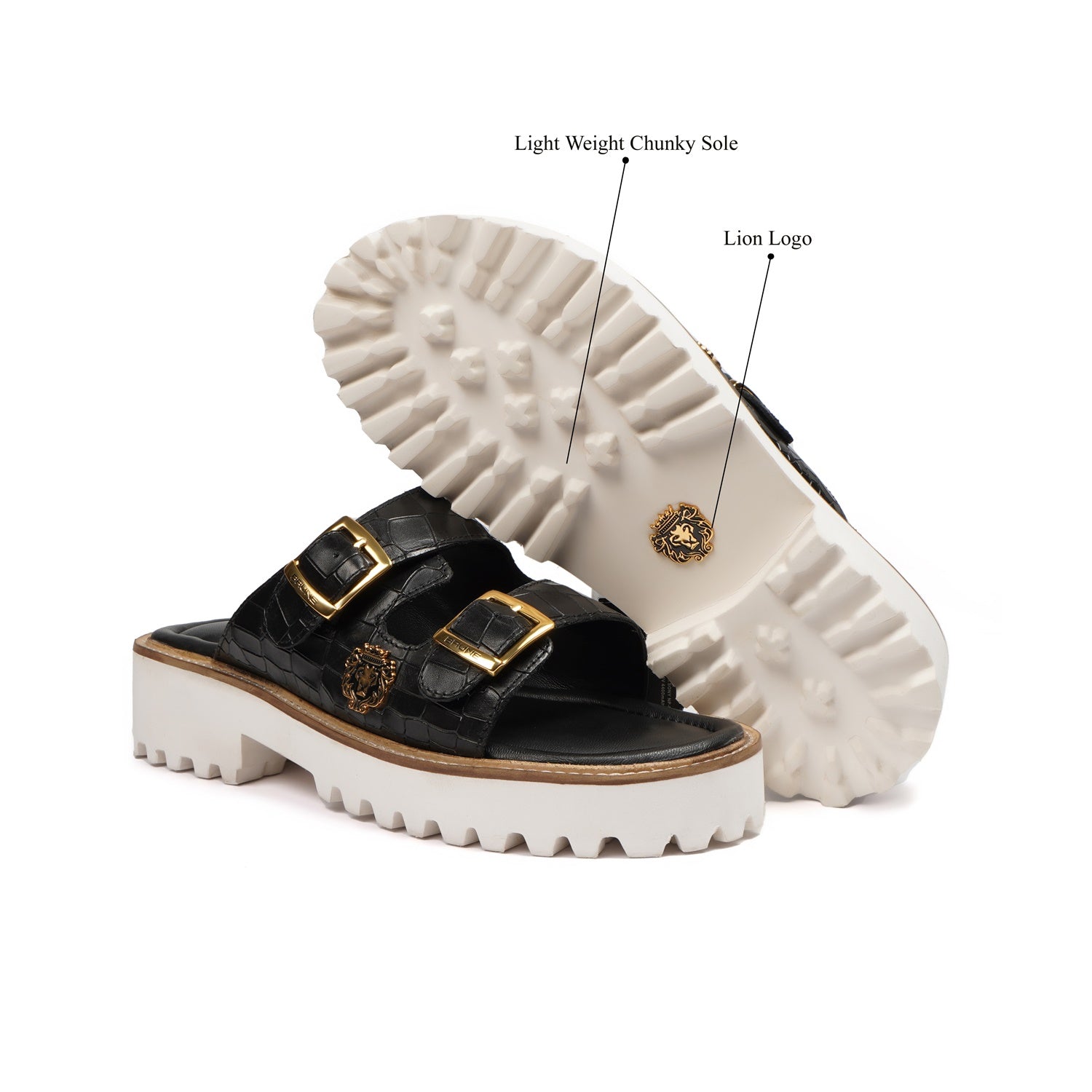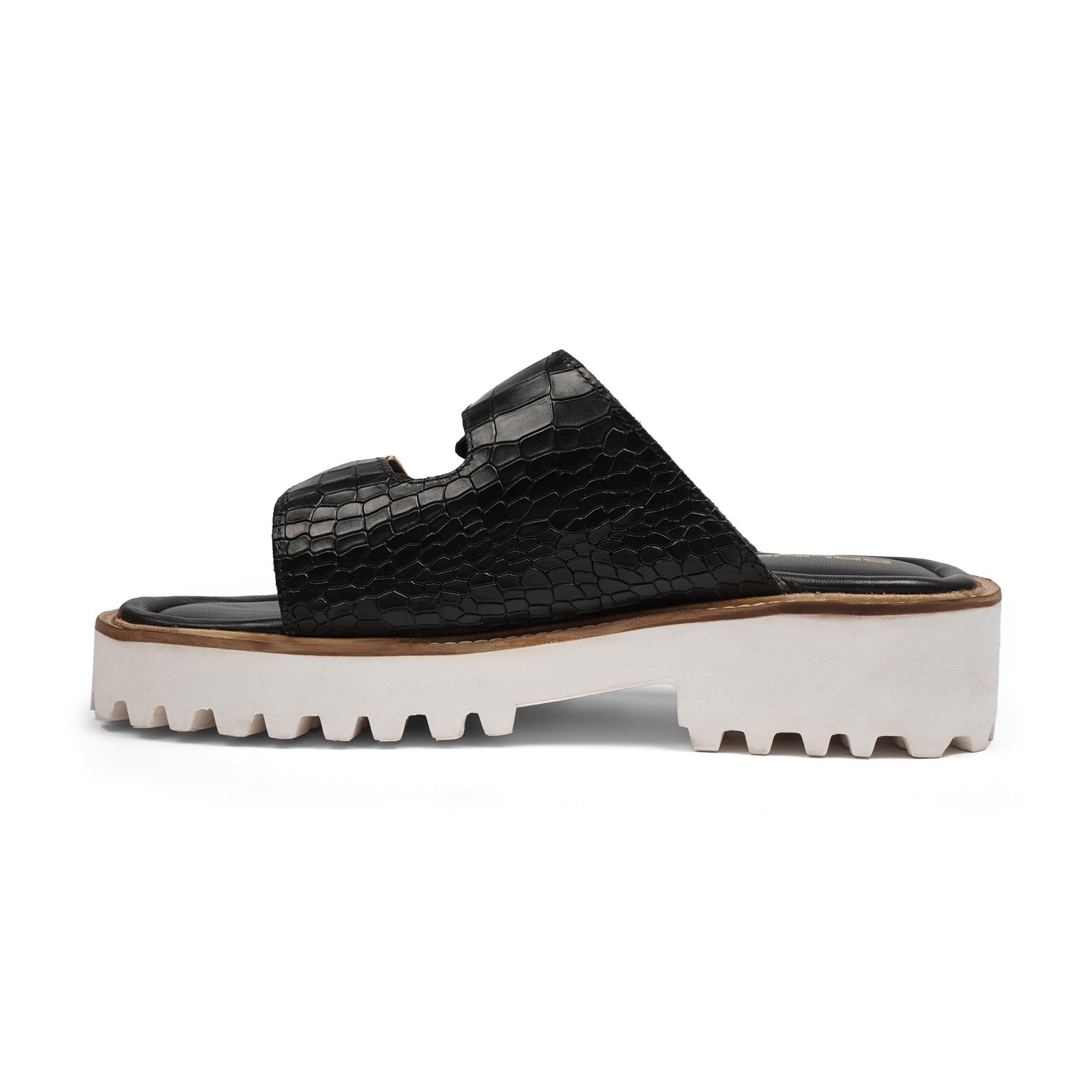 Premium Chunky White Sole Black Croco Leather Slide in Slippers