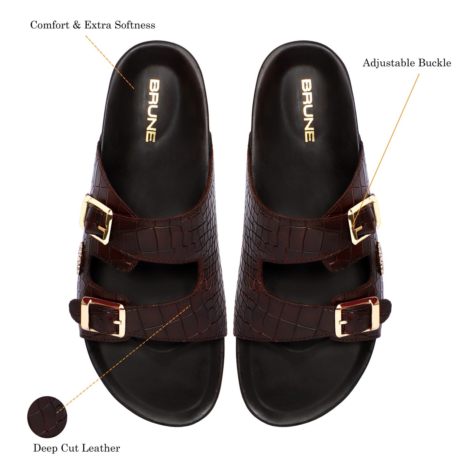 When it comes to Slippers, comfortably is the highest priority. These Cut Croco leather Slippers/Sandals are the luxurious piece of beauty from Brune & Bareskin. These Double Monk Leather slippers are a must-have of the season. Deep cut Croco Adjustable buckle strap spells freedom and the casual lifestyle. The gel injected memory foam base is designed to provide you comfort while walking. We use special layering techniques to keep the base cozy and retain its shape. Cut Croco Adjustable buckled strap endows the extra room for every foot. The wider straps Design with BRUNE & BARESKIN Lion Logo enhance the elegance further. Anti-Skid outer leather sole ensures the perfect walking grip. Carry these with Jeans, Shorts, Capri's, and other casual wear to be a style leader. You can customize this Slippers in any of your favorite color with our bespoke services.