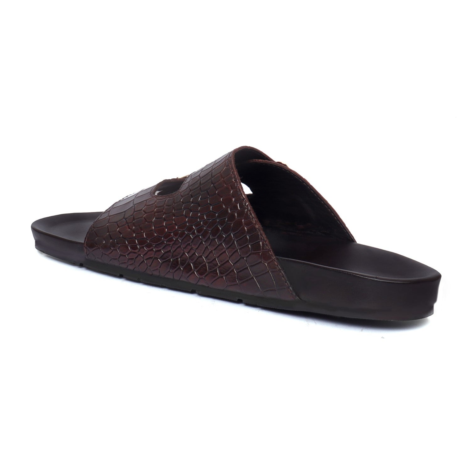 Footbed Slippers in Dark Brown Croco Textured Leather