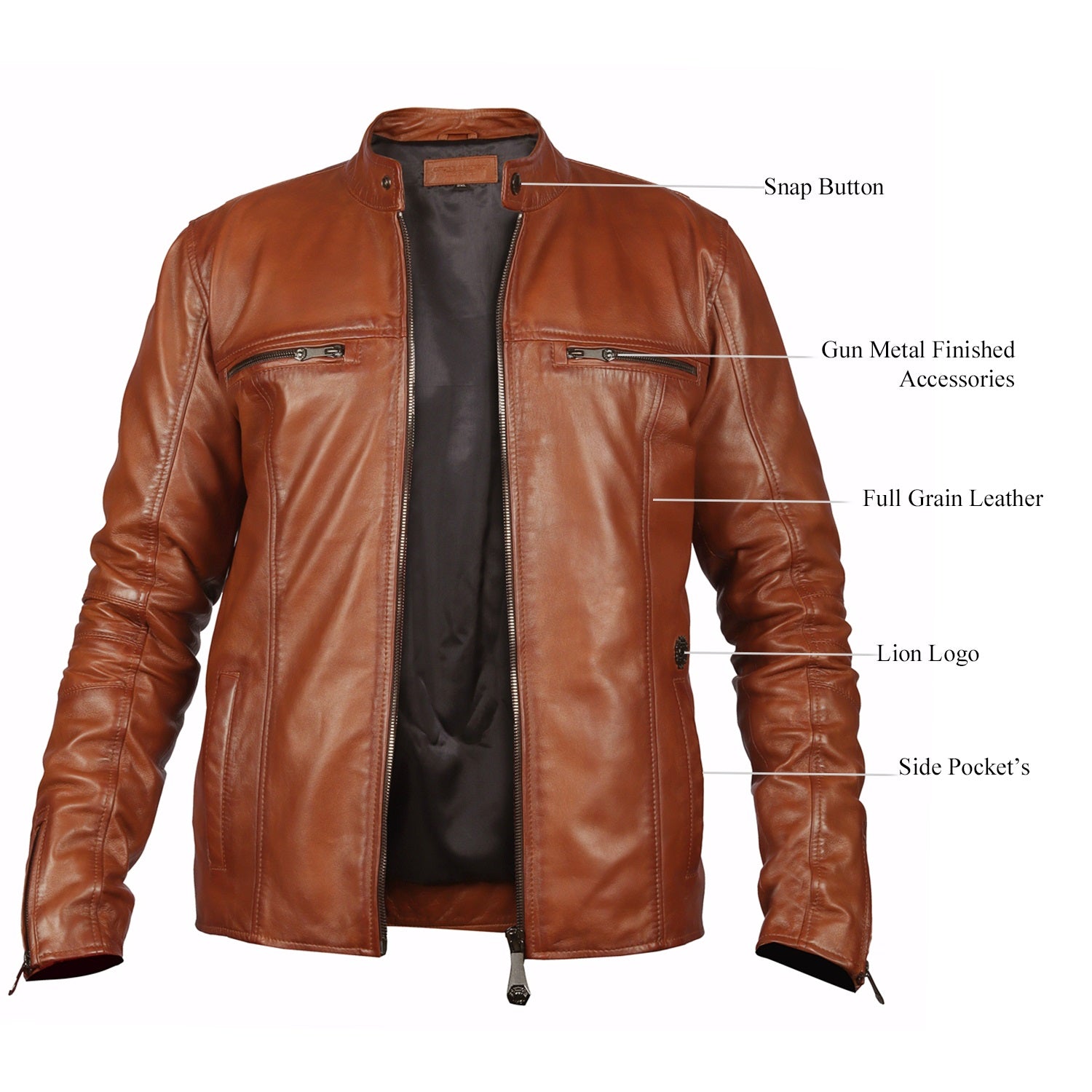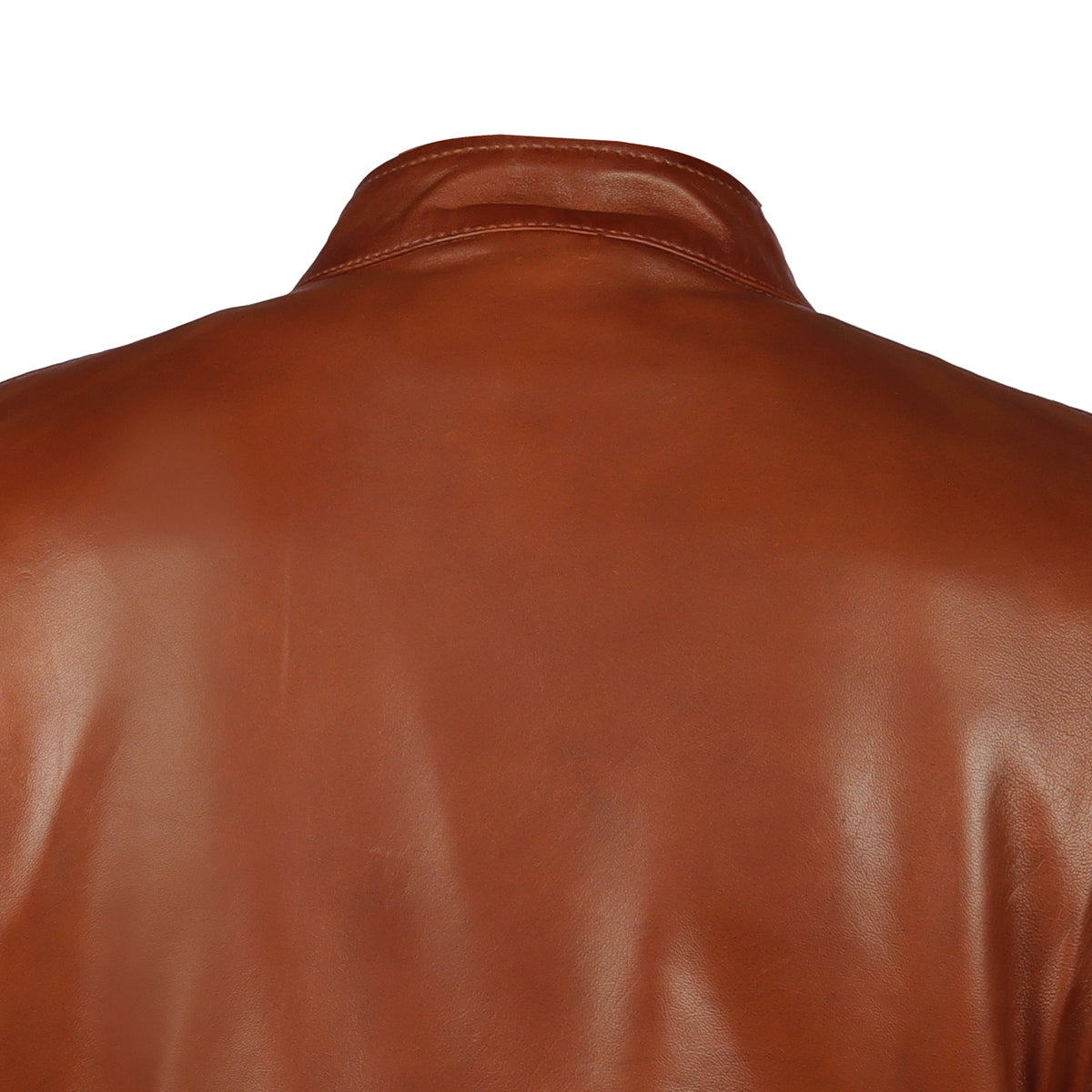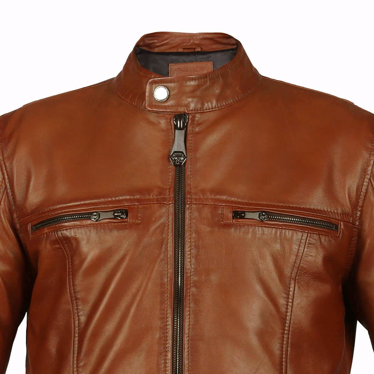 Classic Ban Neck Collar Front Zipper Pockets Tan Men Leather Jacket