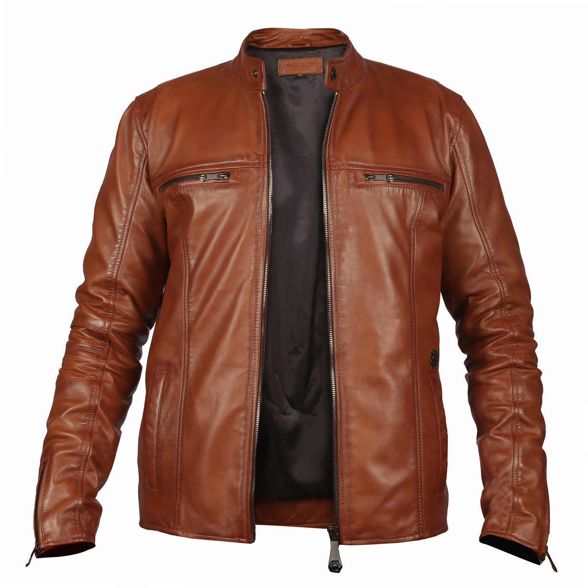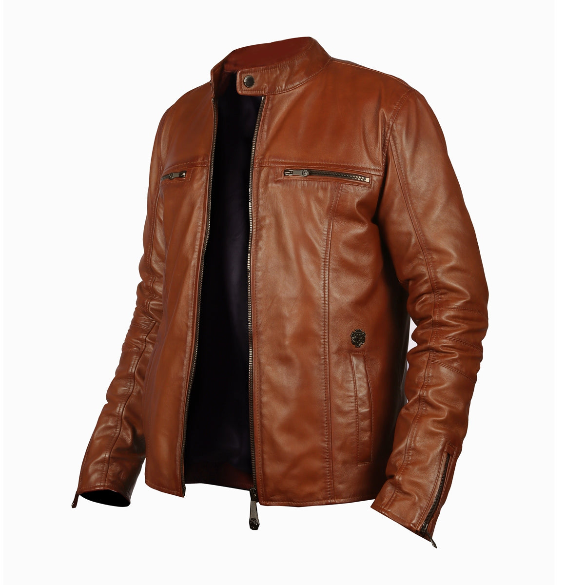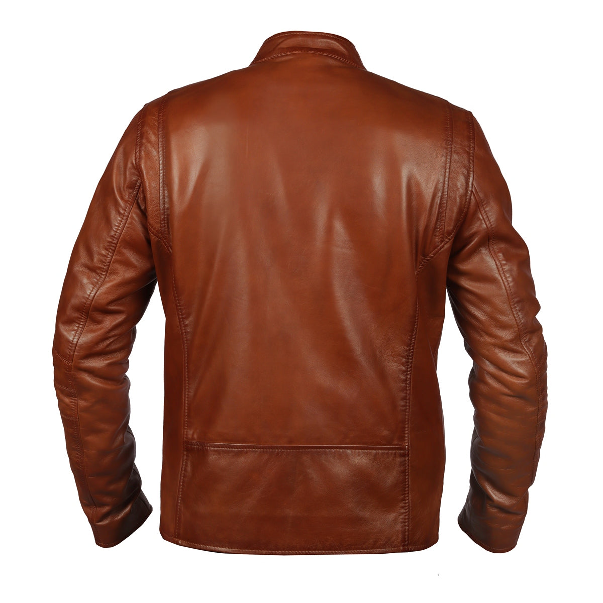 Classic Ban Neck Collar Front Zipper Pockets Tan Men Leather Jacket