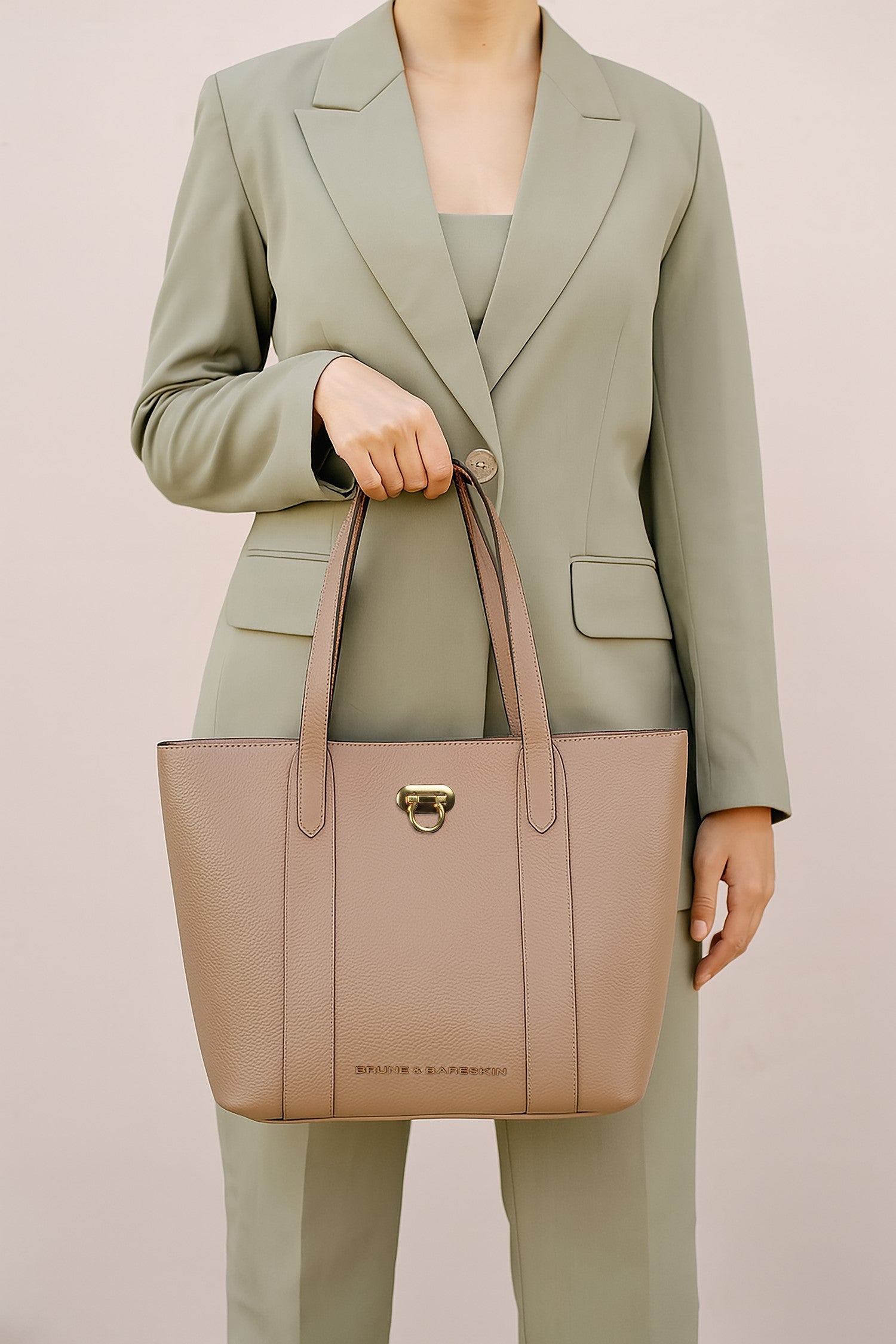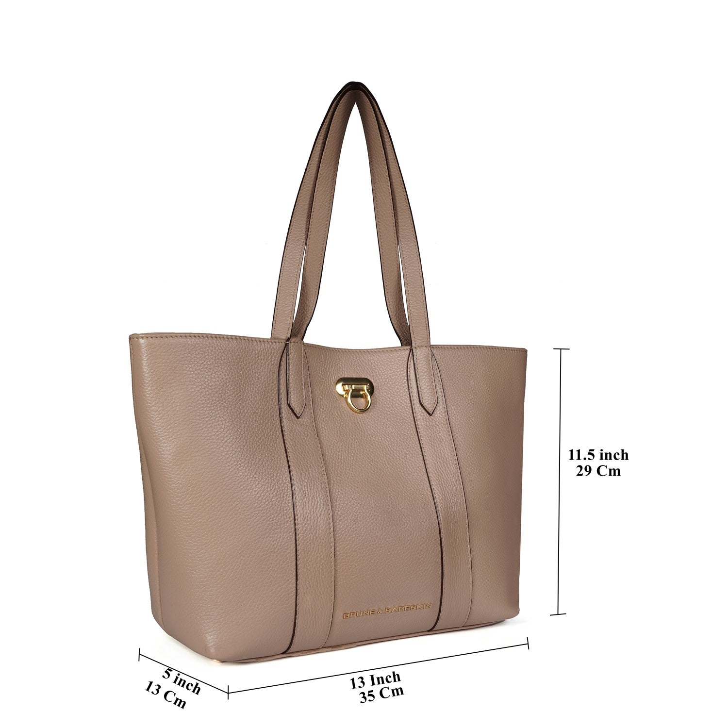 Made from premium textured beige leather, this handbag boasts a soft, smooth finish with subtle grain patterns that reflect fine craftsmanship. At the center of its charm lies a golden metal clasp with a classic turn-lock closure, adding a luxurious accent while ensuring your belongings are secure. The structured silhouette provides a polished look without compromising on convenience, making it an ideal companion for work, brunch, or evening events.
