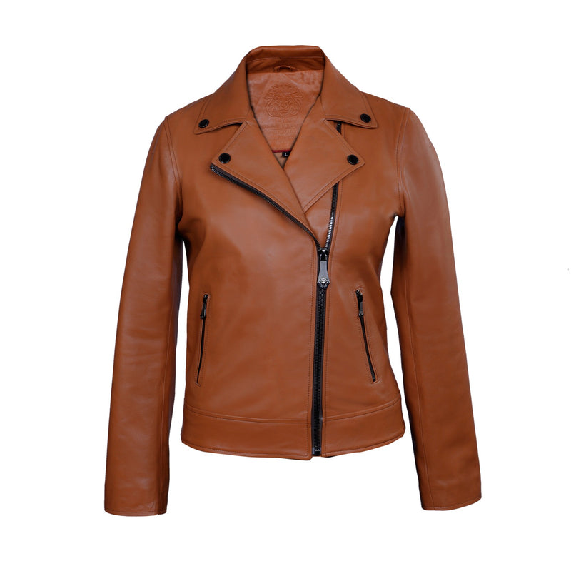 This stunning ladies jacket from Brune & Bareskin is a timeless classic. Hand-crafted from luxuriously soft genuine leather, the dark brown color provides an elegant and sophisticated look. With its gunmetal detail on the collar and full-length sleeve design, this jacket is a perfect gift for your special someone. A timeless biker style look with an exquisite touch of glamour.