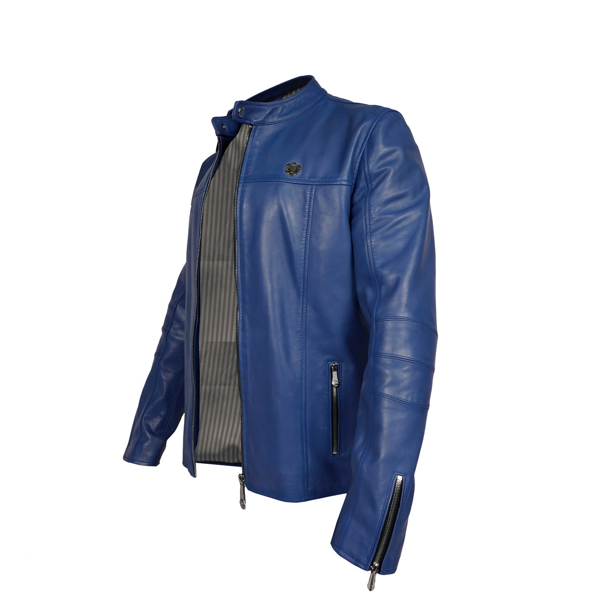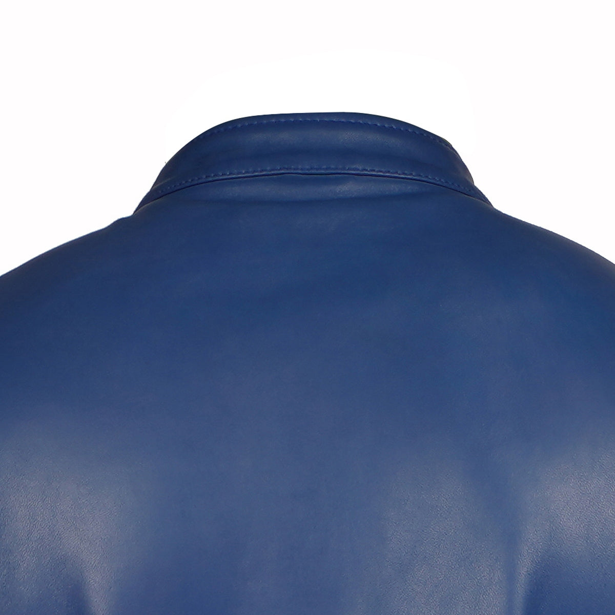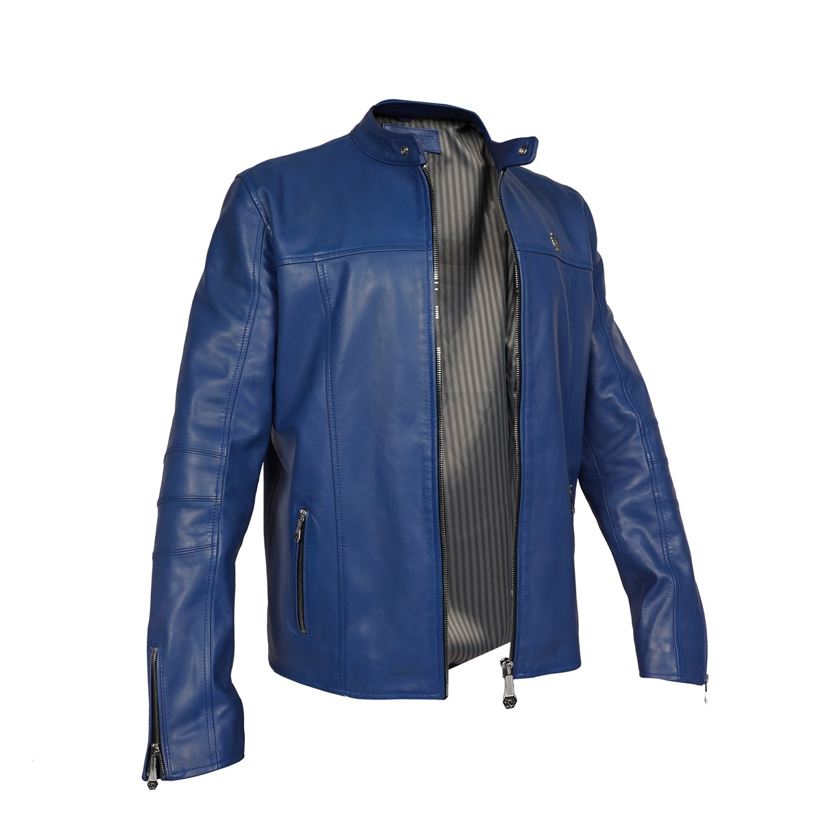 Classic Stylish Slim Fit Sky Blue Ban Neck Collar Front Zipper Pockets Men's Leather Jacket By Brune & Bareskin