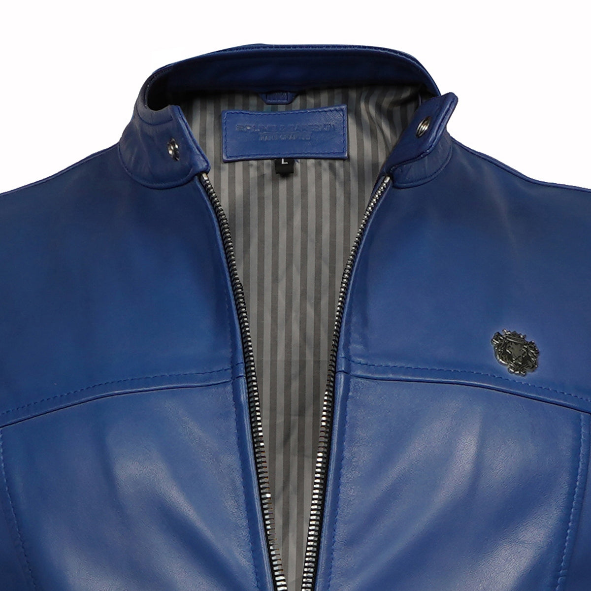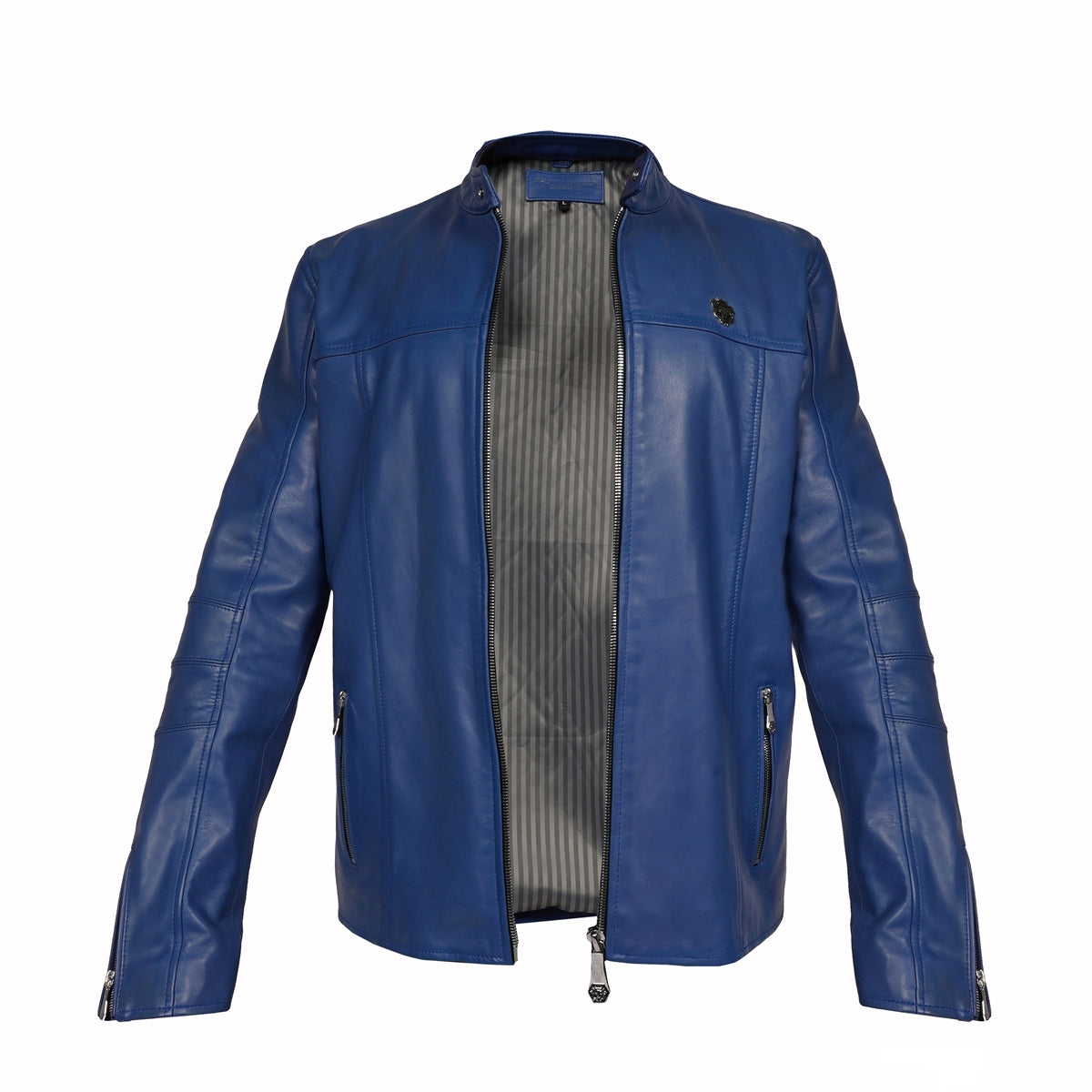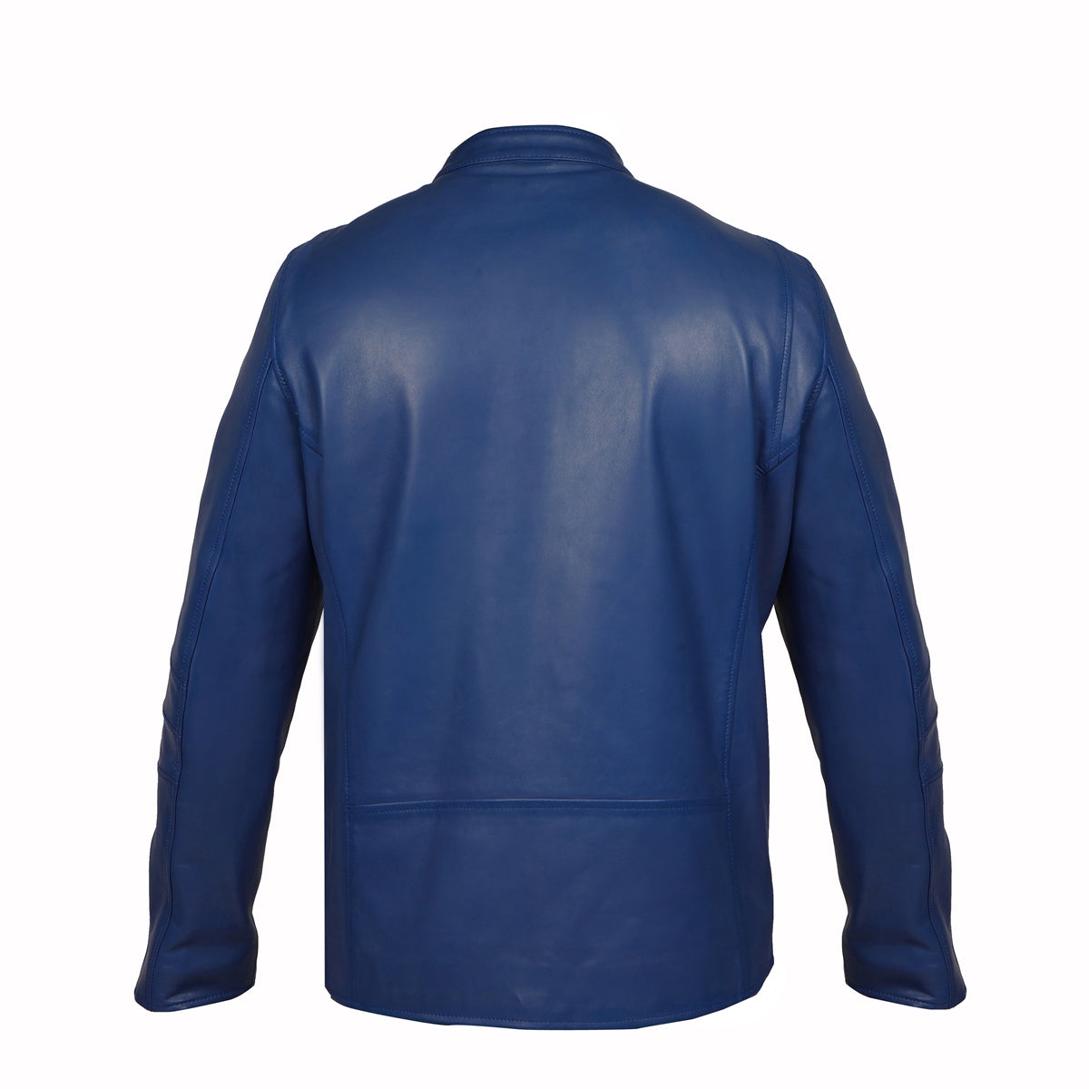 Classic Stylish Slim Fit Sky Blue Ban Neck Collar Front Zipper Pockets Men's Leather Jacket By Brune & Bareskin