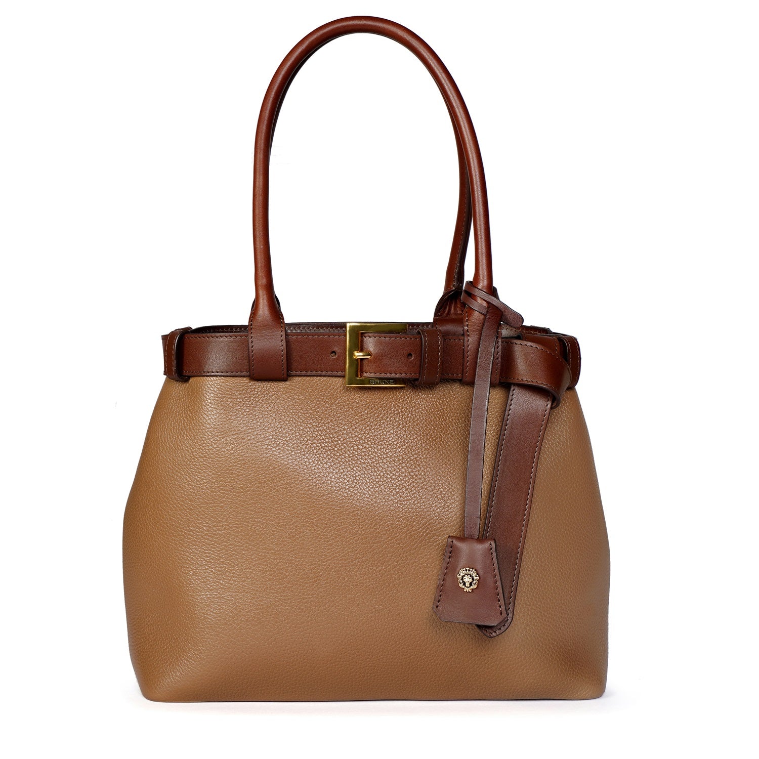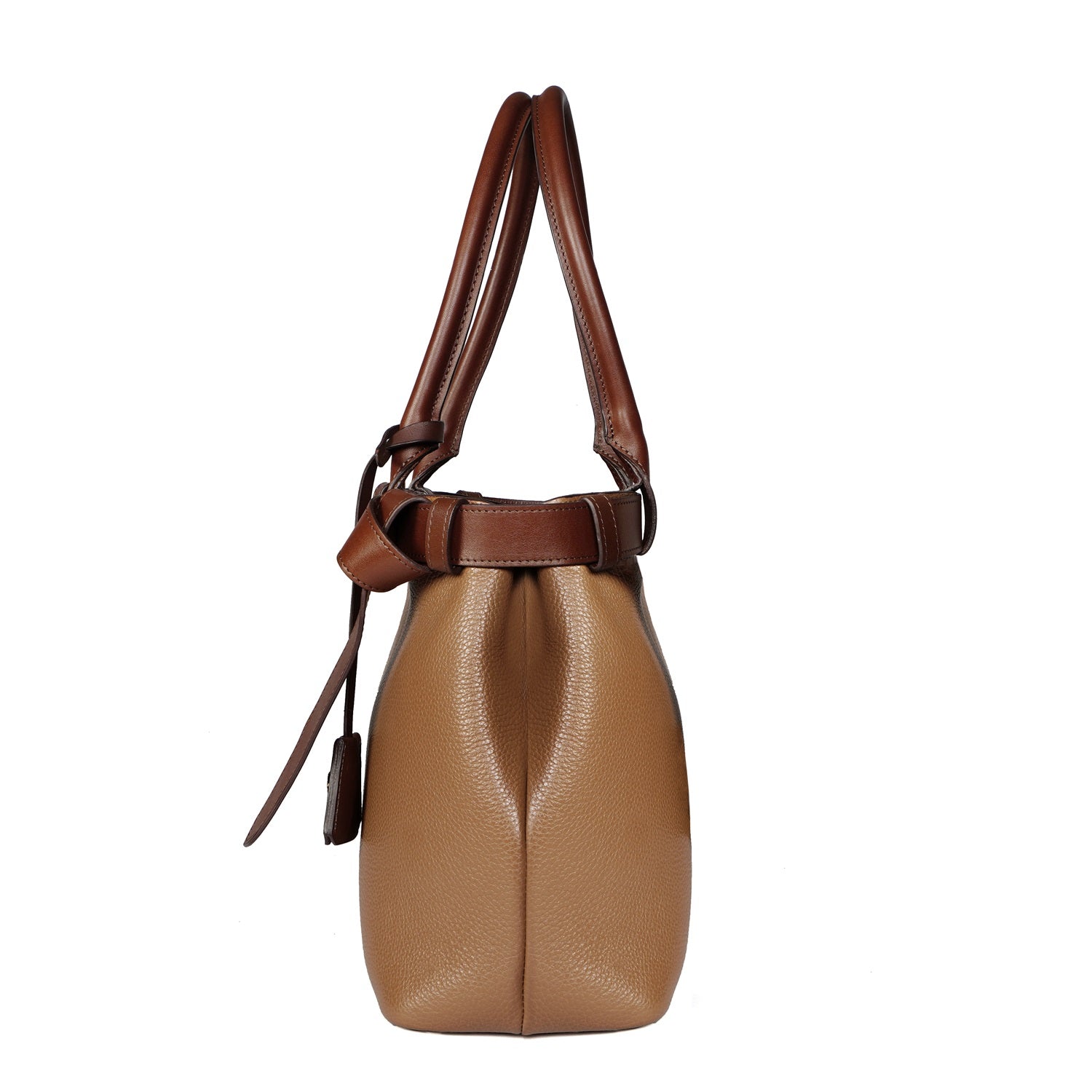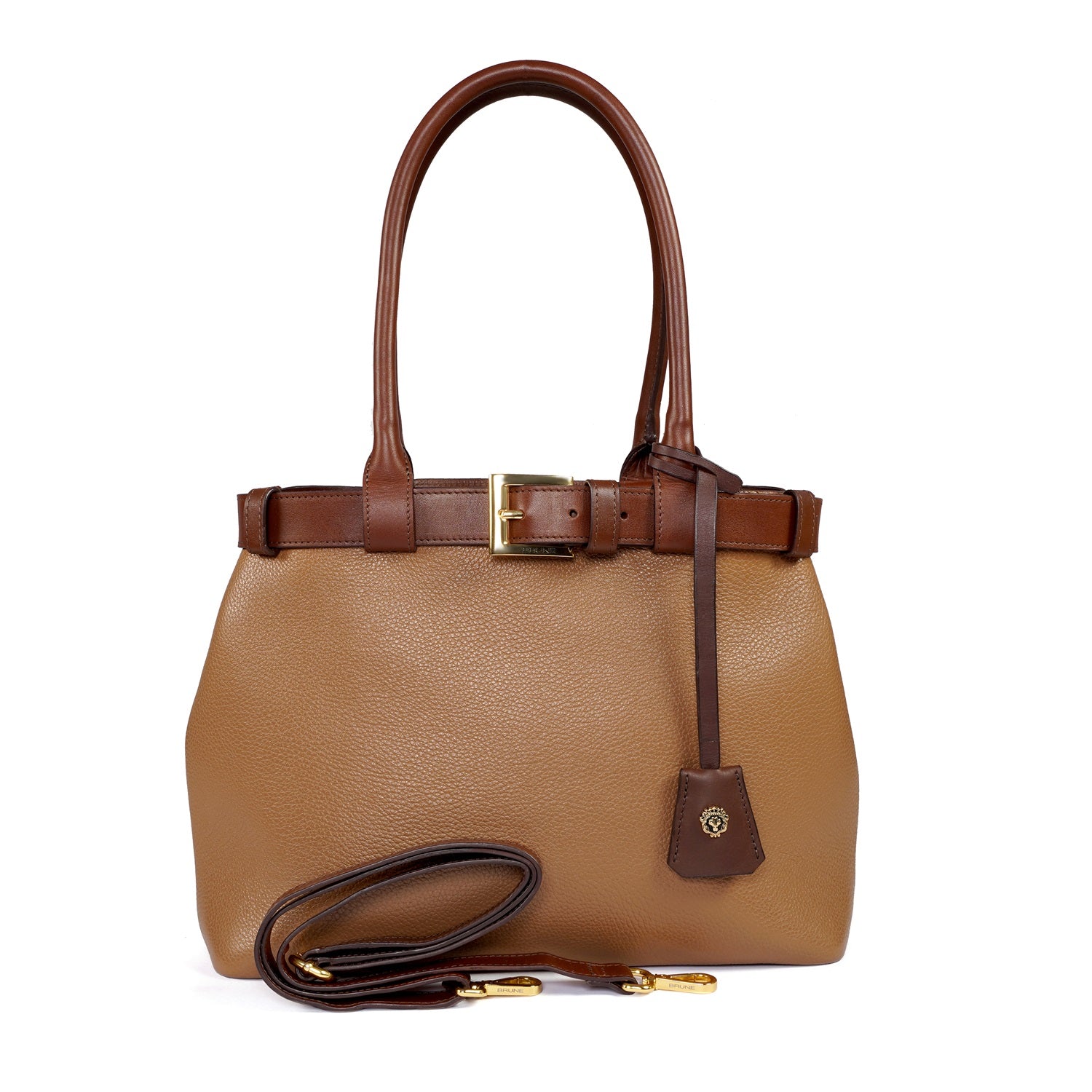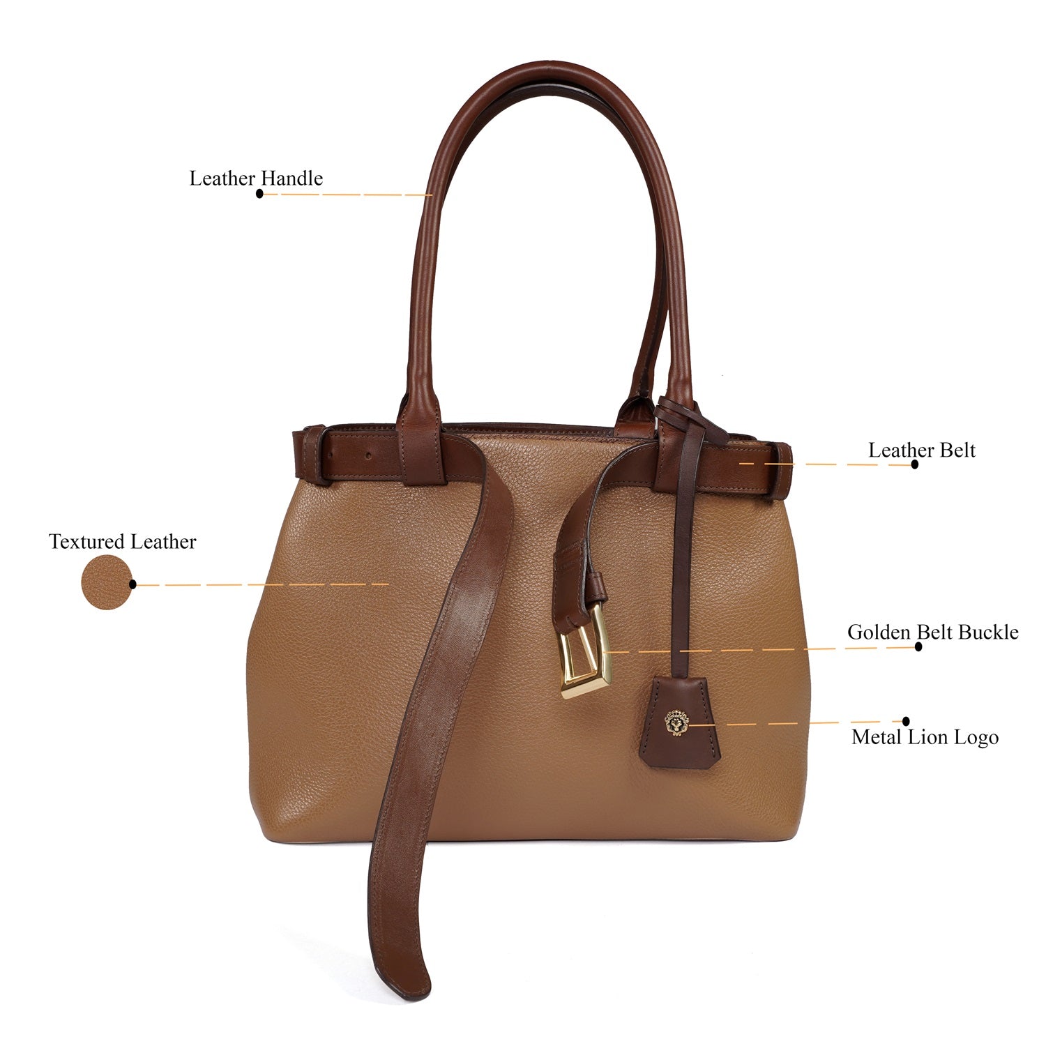 Classic Tan Textured Leather Handbag with Dual-Tone Belt Detailing