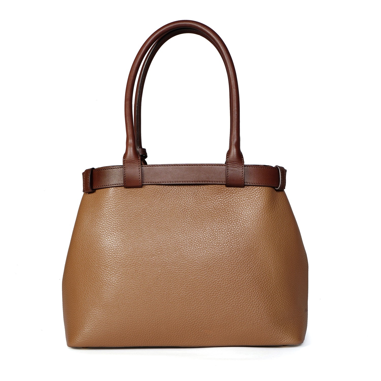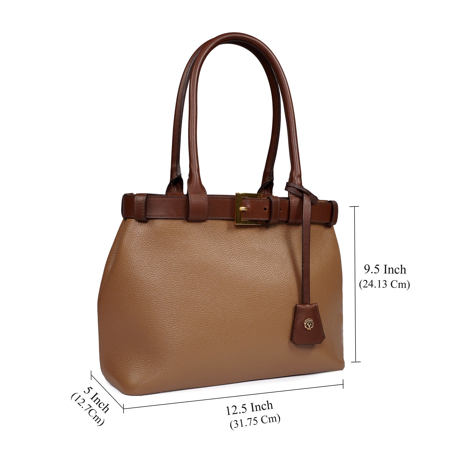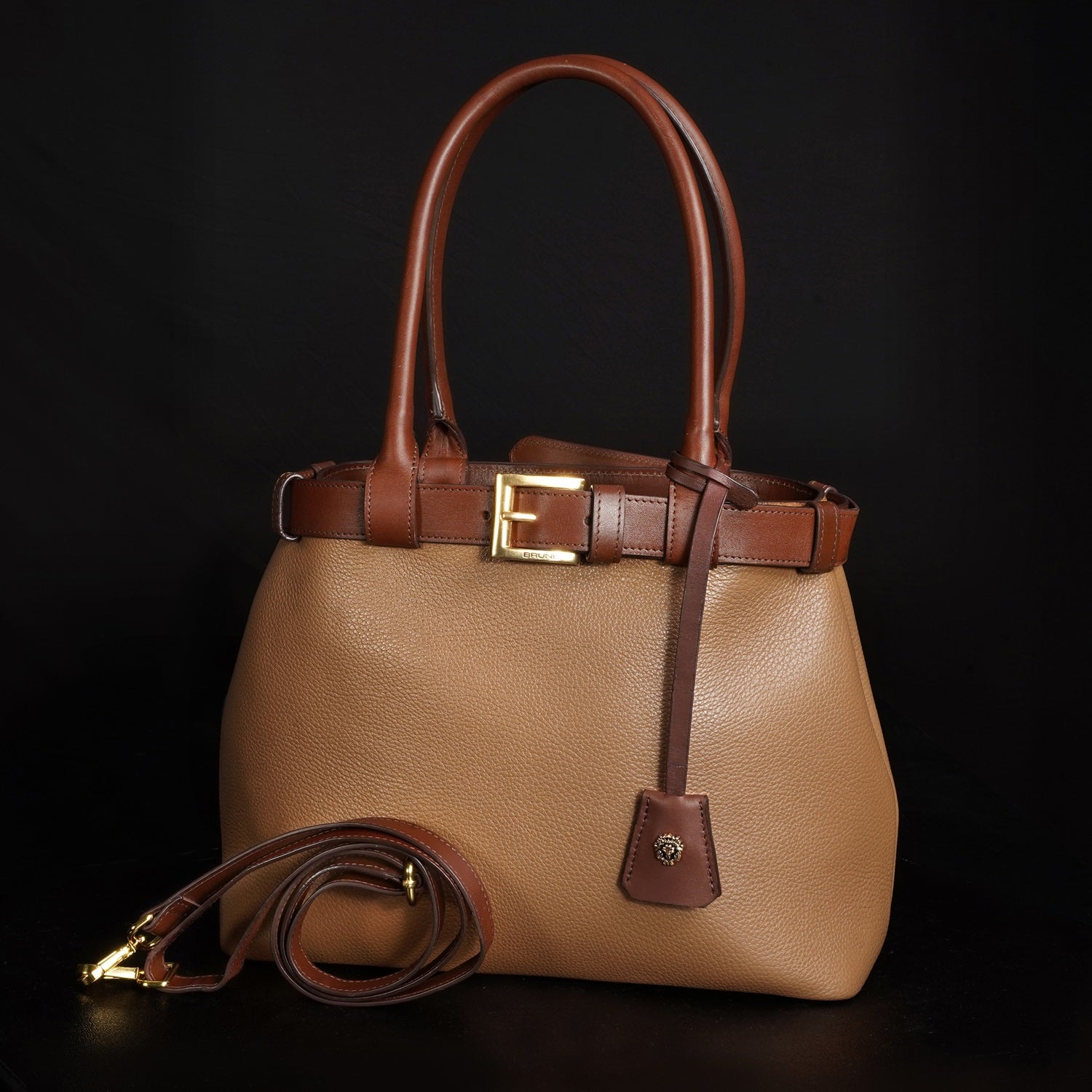 Classic Tan Textured Leather Handbag with Dual-Tone Belt Detailing