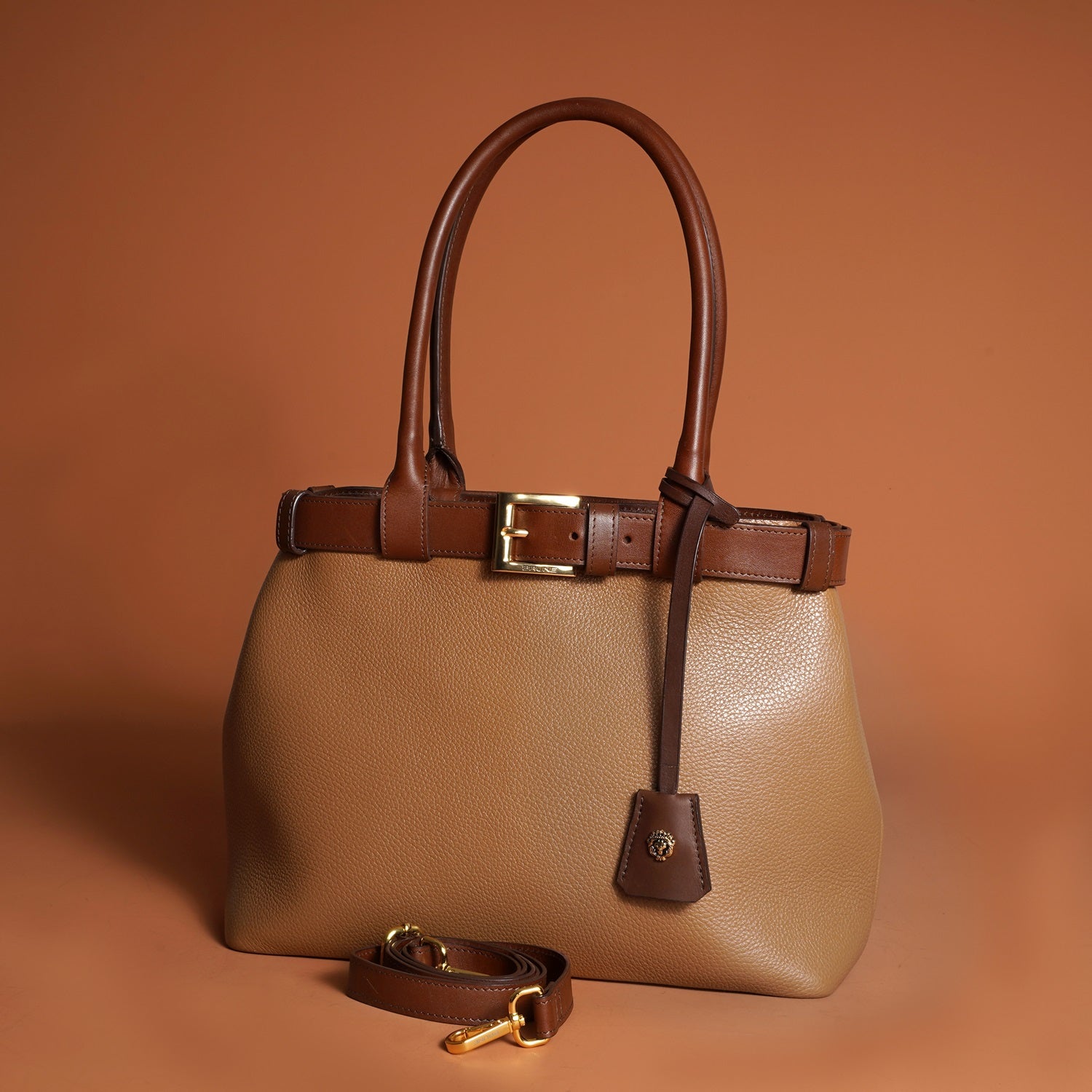 Crafted from high-quality textured leather, the bag features a dual-tone finish that exudes luxury. The sturdy leather handles offer a comfortable grip, while the sleek leather belt with a golden buckle adds a refined accent to the overall design. The signature Metal Lion Logo symbolizes strength and premium artistry, completing the bag’s regal appeal.