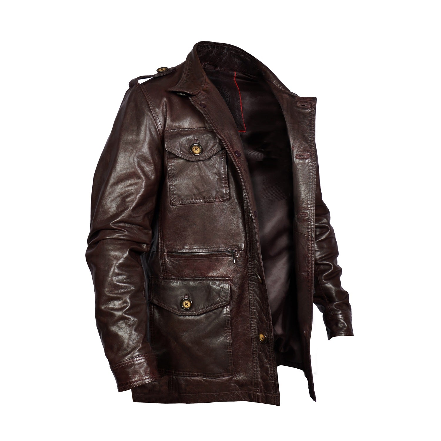 Get ready to conquer the urban jungle in style with the Safari Jacket in dark brown Leather by Brand Brune & Bareskin! Handcrafted from genuine leather, this stylish shirt-style jacket features multiple flap pockets, front button detailing, and a gun metal lion logo. Its premium lining, concealed internal pockets, and front hidden zipper closure offer both warmth and style. Upgrade your wardrobe with this high fashion field jacket that blends comfort and fashion seamlessly.