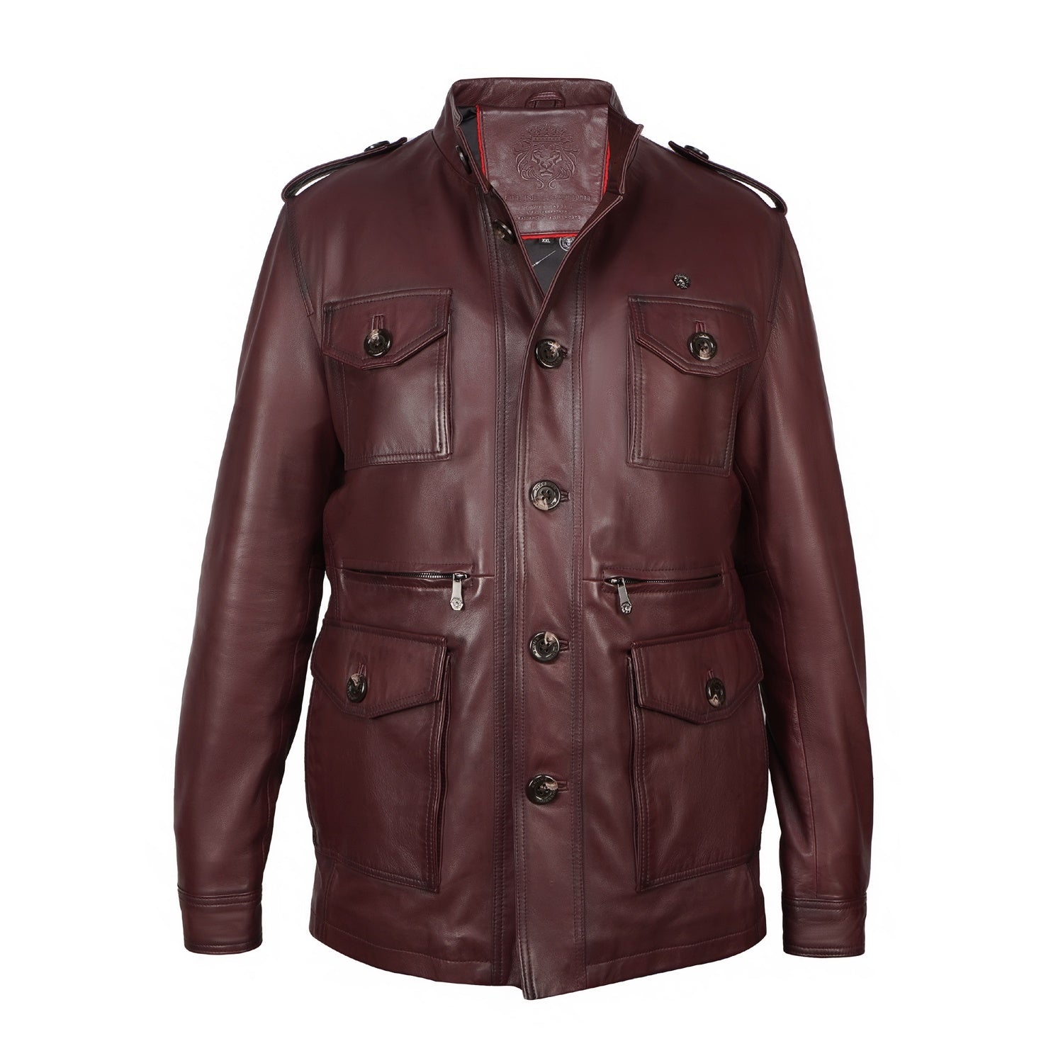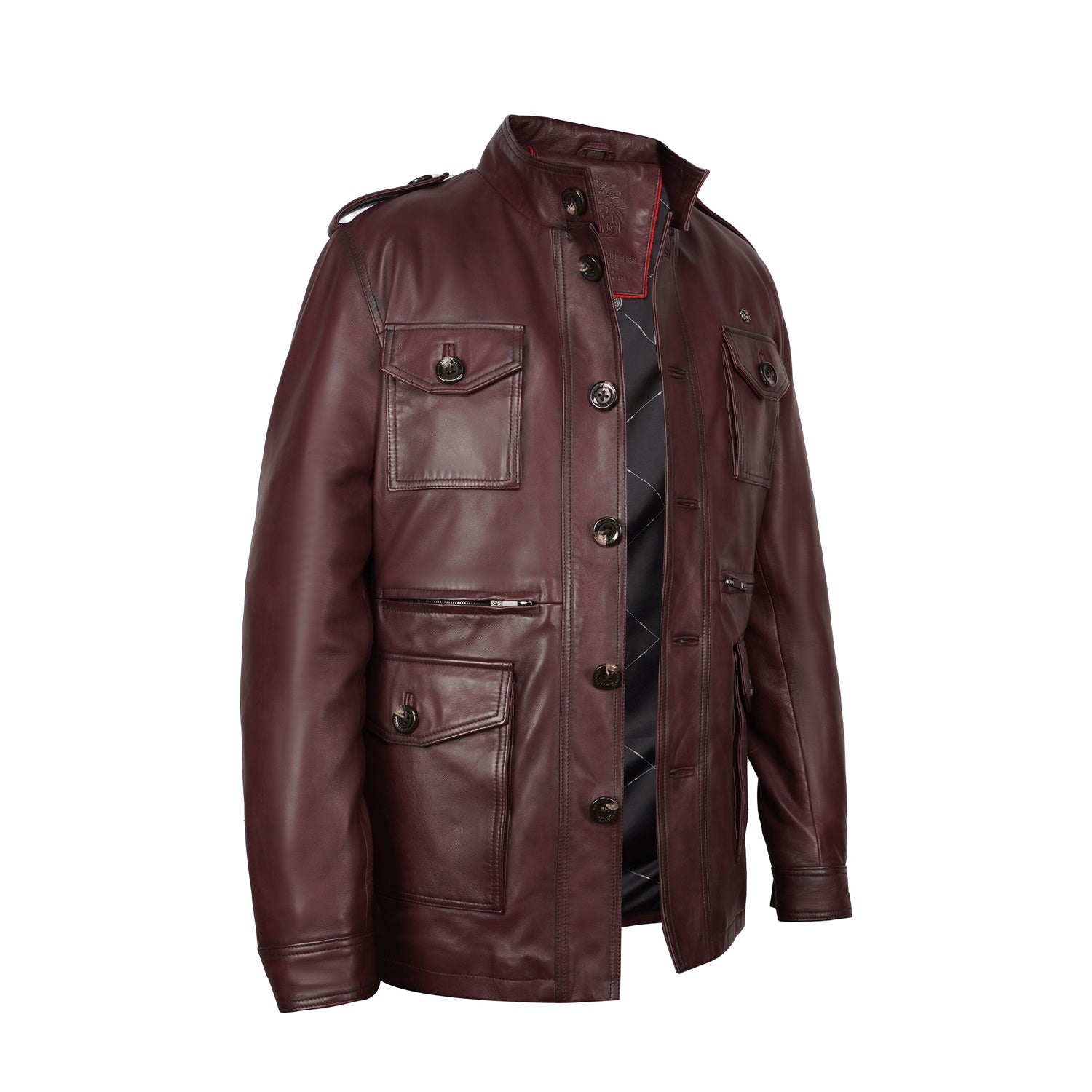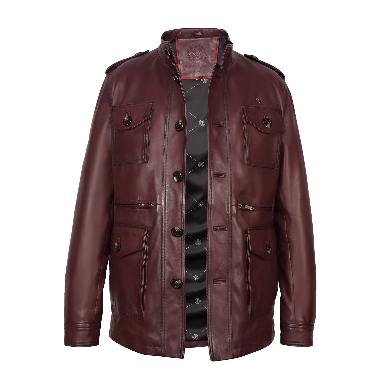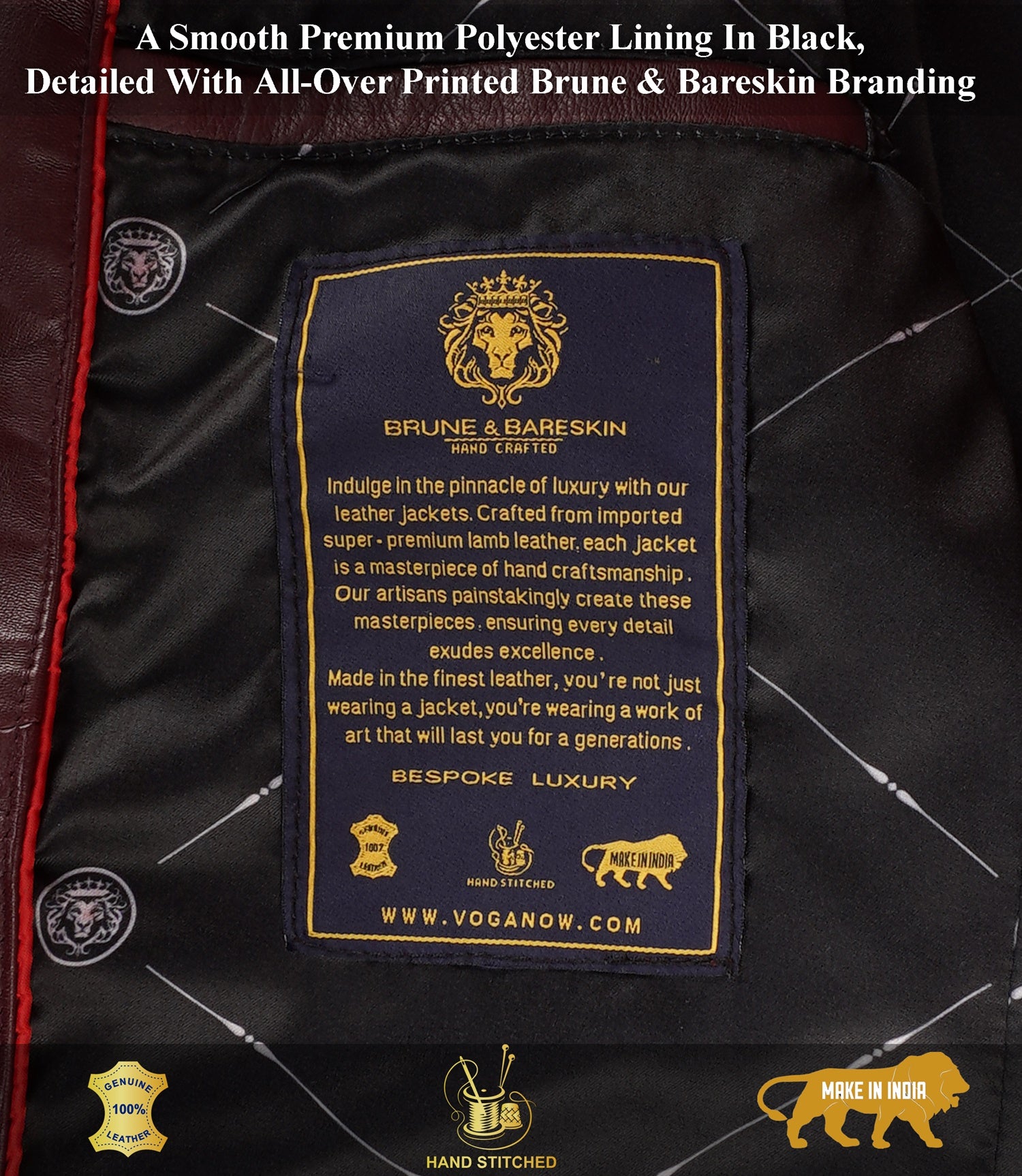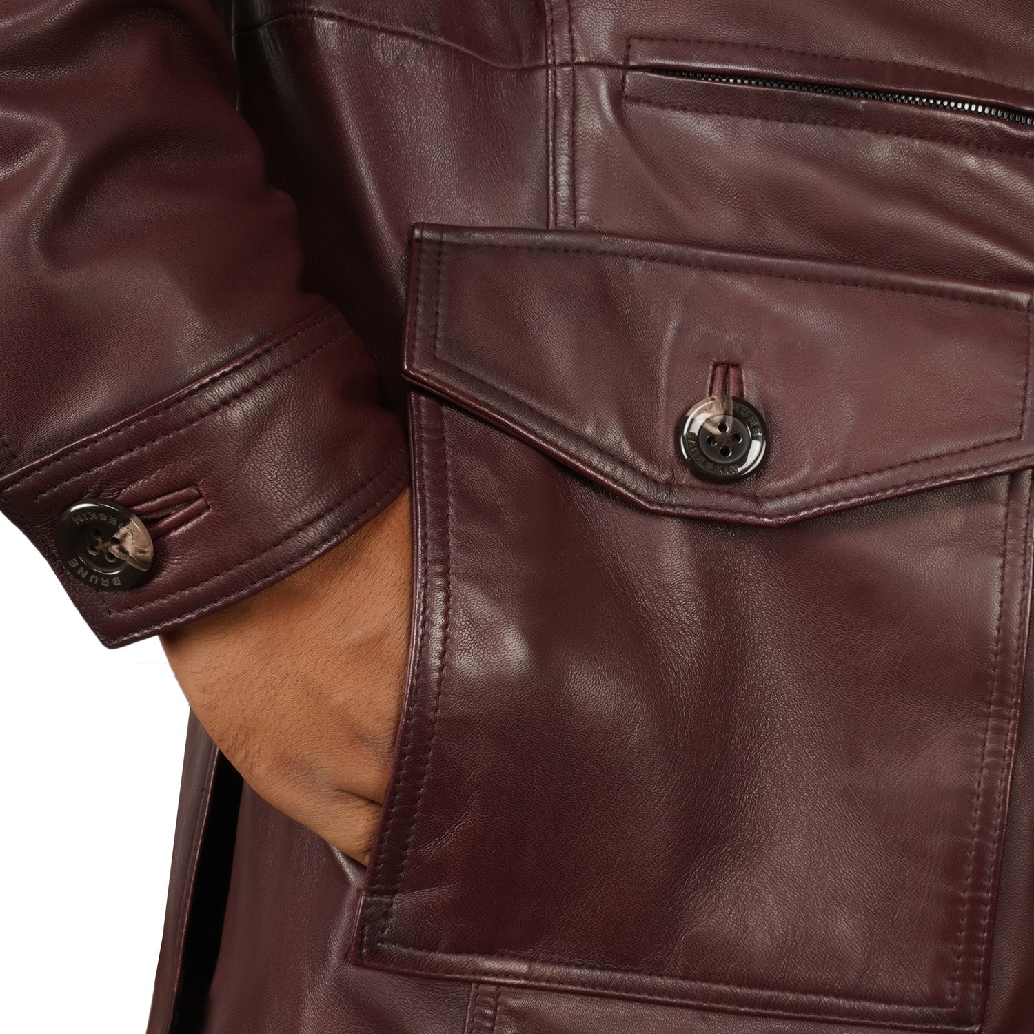 Get ready to conquer the urban jungle in style with the Safari Jacket in dark brown Leather by Brand Brune & Bareskin! Handcrafted from genuine leather, this stylish shirt-style jacket features multiple flap pockets, front button detailing, and a gun metal lion logo. Its premium lining, concealed internal pockets, and front hidden zipper closure offer both warmth and style. Upgrade your wardrobe with this high fashion field jacket that blends comfort and fashion seamlessly.
