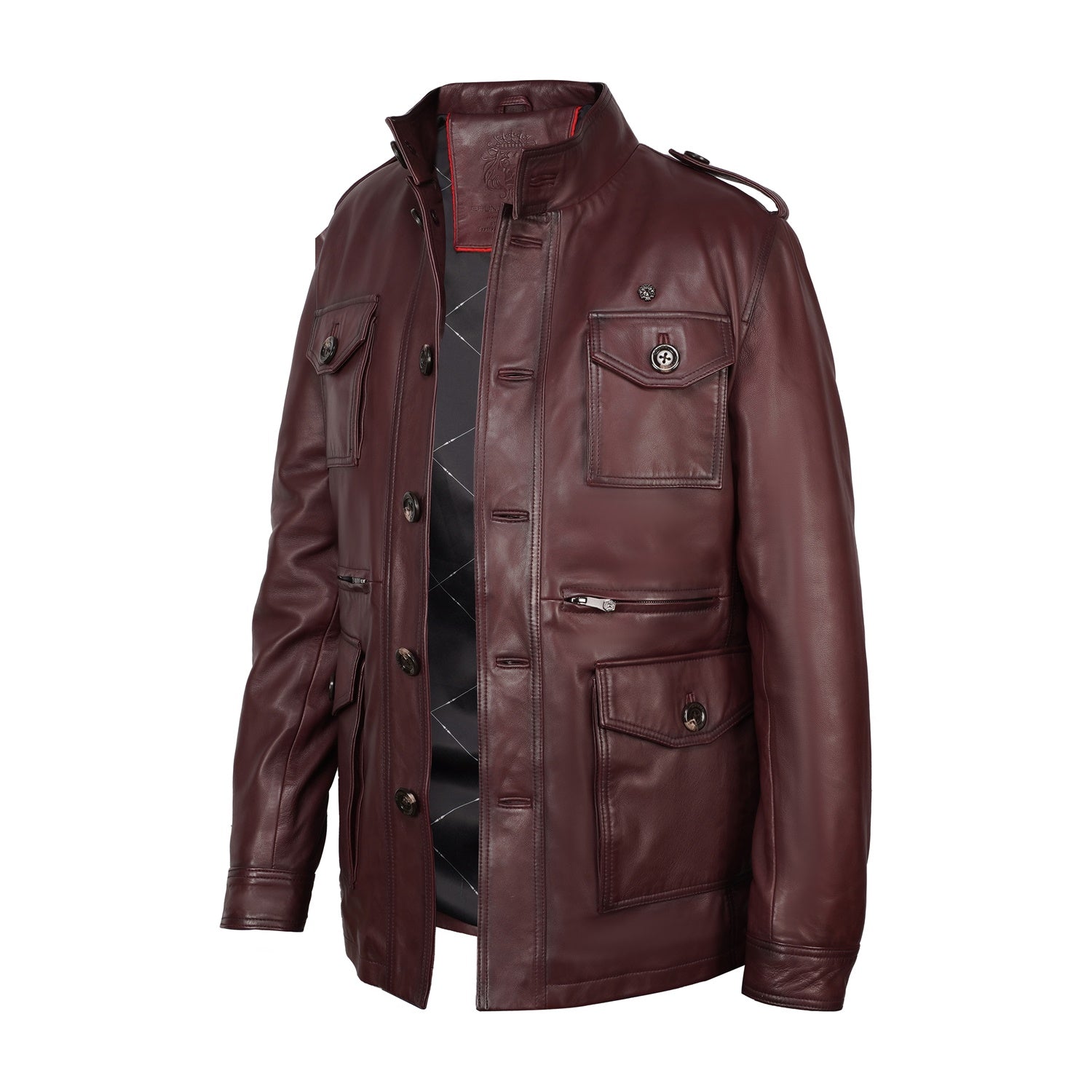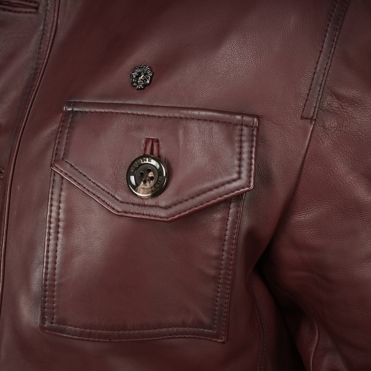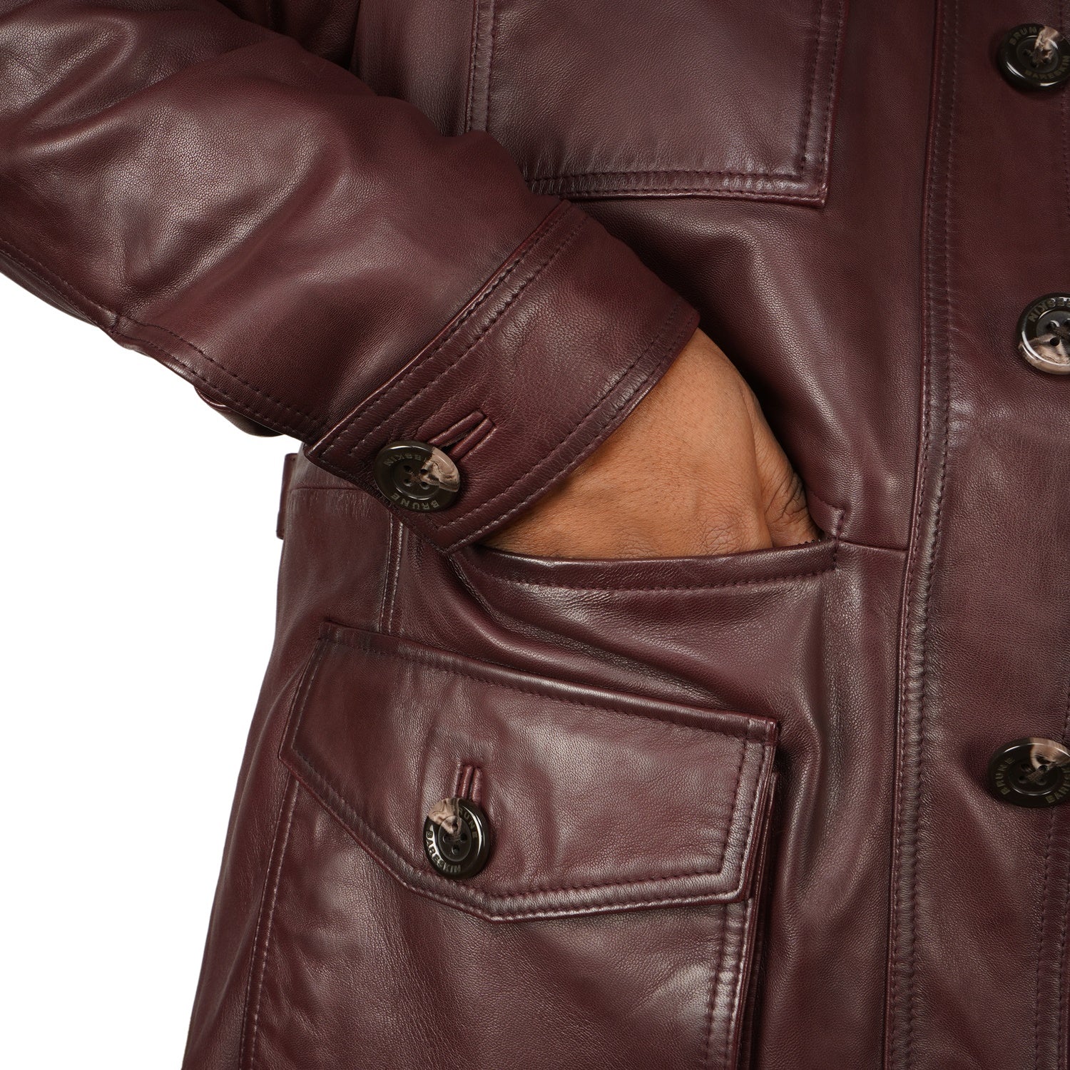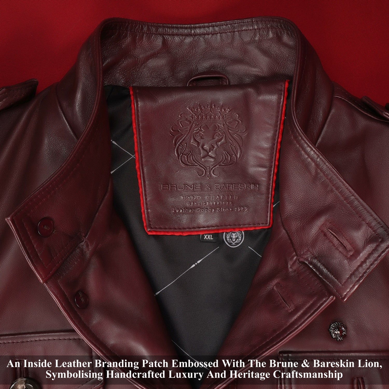 Get ready to conquer the urban jungle in style with the Safari Jacket in dark brown Leather by Brand Brune & Bareskin! Handcrafted from genuine leather, this stylish shirt-style jacket features multiple flap pockets, front button detailing, and a gun metal lion logo. Its premium lining, concealed internal pockets, and front hidden zipper closure offer both warmth and style. Upgrade your wardrobe with this high fashion field jacket that blends comfort and fashion seamlessly.