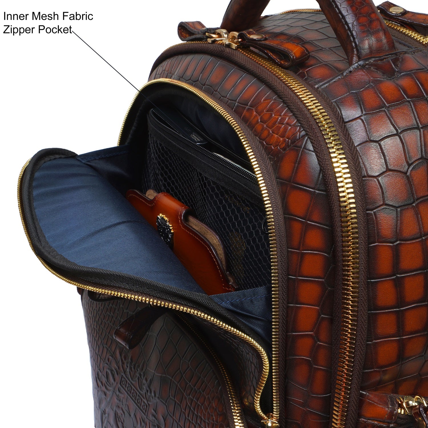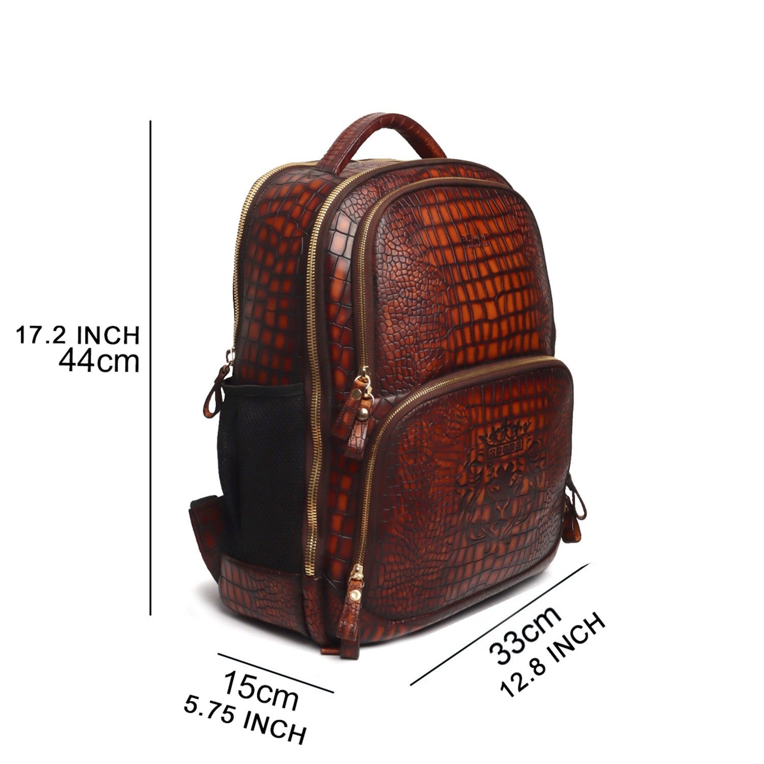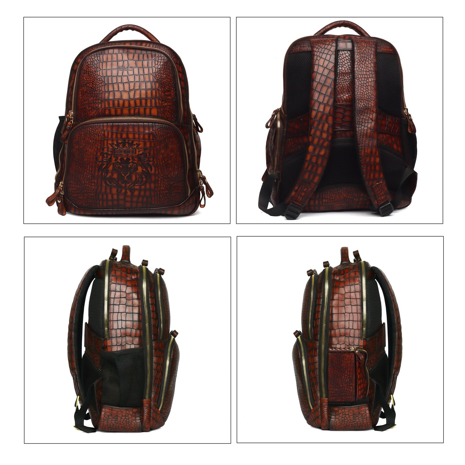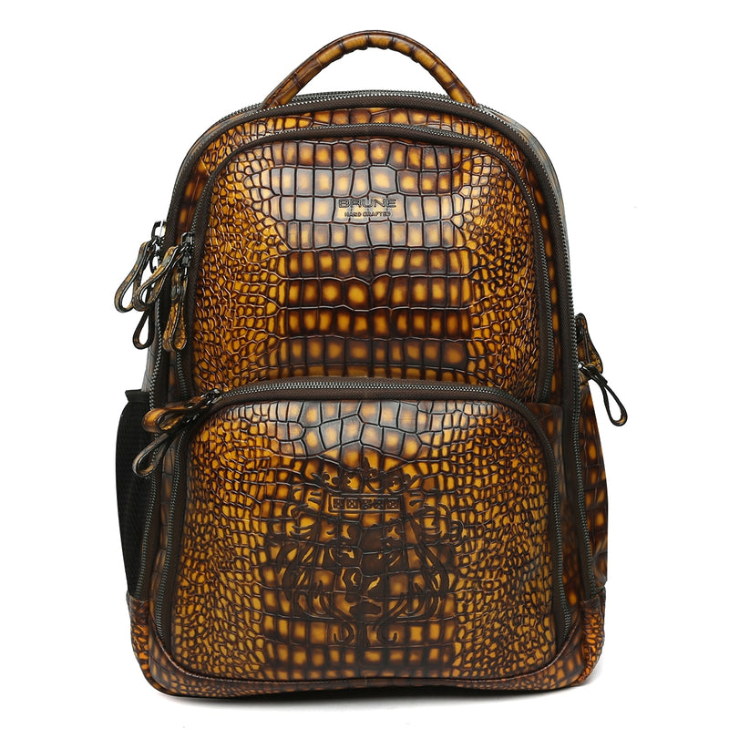 Colors in Leathers are rare to seen, but we are here to ask "What is your choice of color in Leather?" It's a Cognac Leather unisex Backpack in Deep Cut Croco Leather with smokey patina finish. It features 2 large zip compartments including laptop pocket & suitcase opening to carry clothes and 2 small pockets to carry documents or any other accessories. This amazing travel leather backpack is crafted with genuine leather by generations' long craftsmen experience. Its elegant look ensures to keep the every eye on you. This is a perfect accessory for a perfect airport look. You can write your name Initials on the products too with our bespoke services. Lion Logo in contrasting color is enhancing royalty of the product. The precisely created size makes it easy to go in flights as check-in luggage bag. Padded straps and back make it very comfortable while carrying on shoulders. It can get attached easily with the roll over back sleeve.