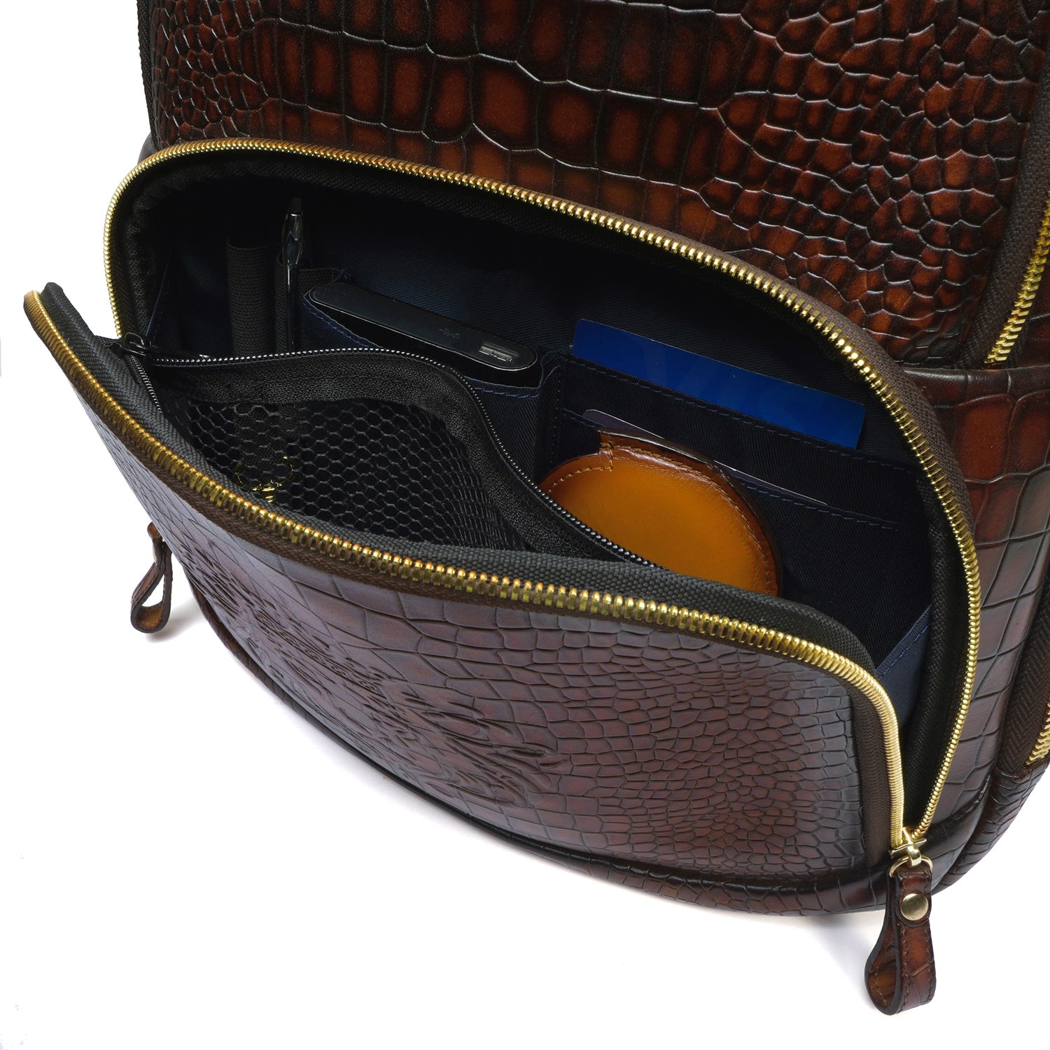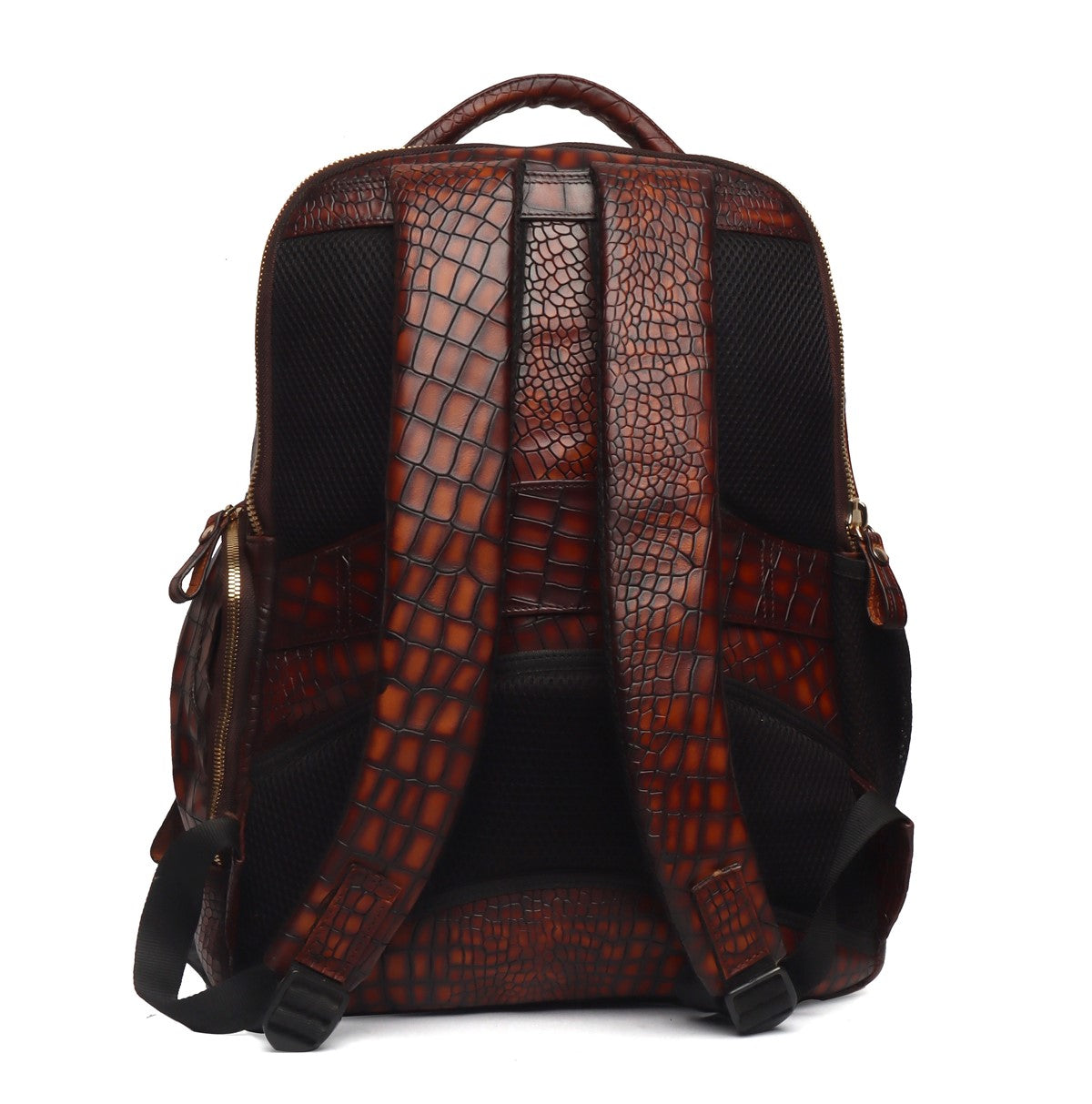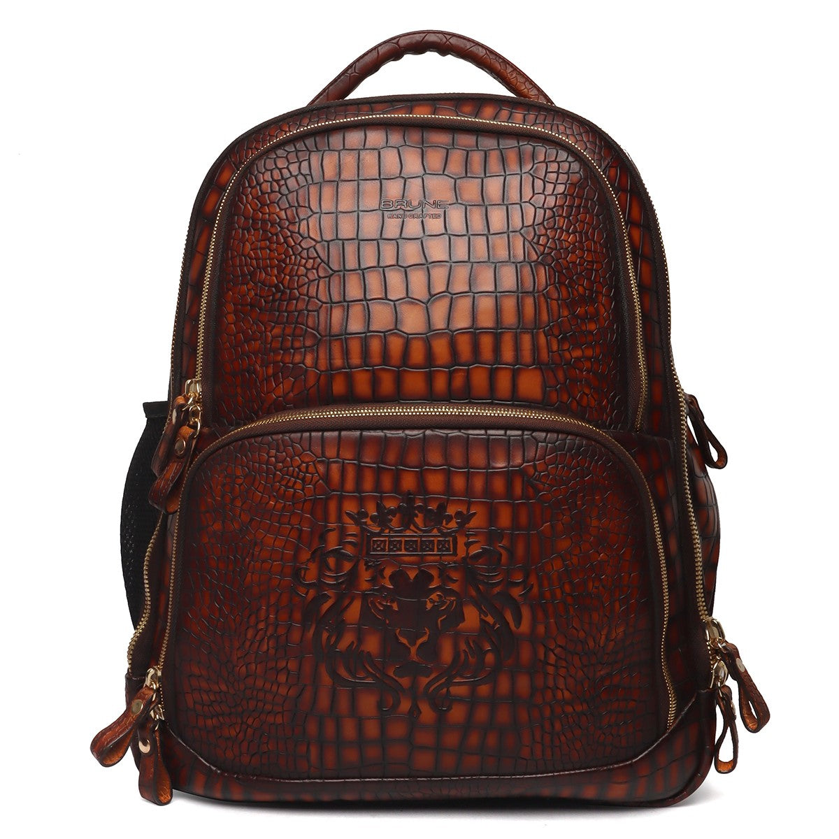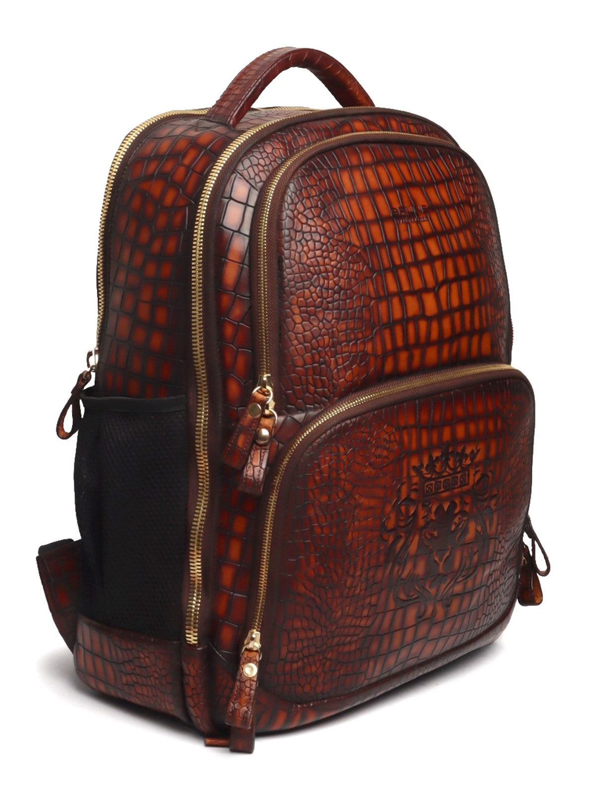 Colors in Leathers are rare to seen, but we are here to ask "What is your choice of color in Leather?" It's a Cognac Leather unisex Backpack in Deep Cut Croco Leather with smokey patina finish. It features 2 large zip compartments including laptop pocket & suitcase opening to carry clothes and 2 small pockets to carry documents or any other accessories. This amazing travel leather backpack is crafted with genuine leather by generations' long craftsmen experience. Its elegant look ensures to keep the every eye on you. This is a perfect accessory for a perfect airport look. You can write your name Initials on the products too with our bespoke services. Lion Logo in contrasting color is enhancing royalty of the product. The precisely created size makes it easy to go in flights as check-in luggage bag. Padded straps and back make it very comfortable while carrying on shoulders. It can get attached easily with the roll over back sleeve.
