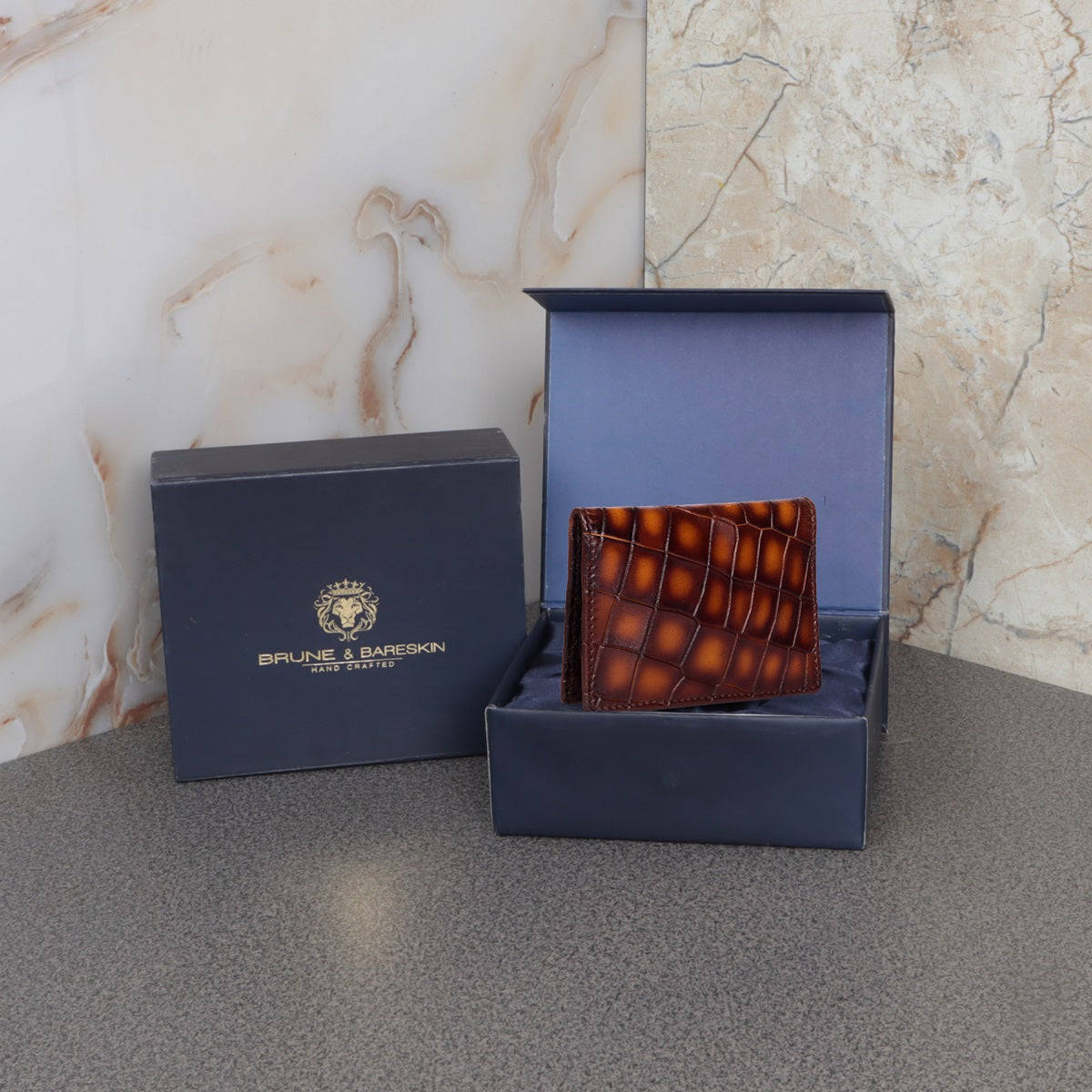 Keep your Identity safe or in style with Brune & Bareskin Card Holders. It holds the cards effortlessly in a dedicated secure pocket. Cognac Deep Cut Croco Textured Leather Cardholder is there to give you style, safety as well as security for your cards. It is one of the most valuable belongings of our life. This bi-fold cognac deep cut leather cardholder with BRUNE & BARESKIN signature metal Lion brand logo on it increases its elegance. Bi-fold opening cardholder features multiple pockets to carry Cash, debit/credit cards, identity cards, etc. Moreover, You can get it customized in your favorite color shade with Name Initials with our bespoke services.