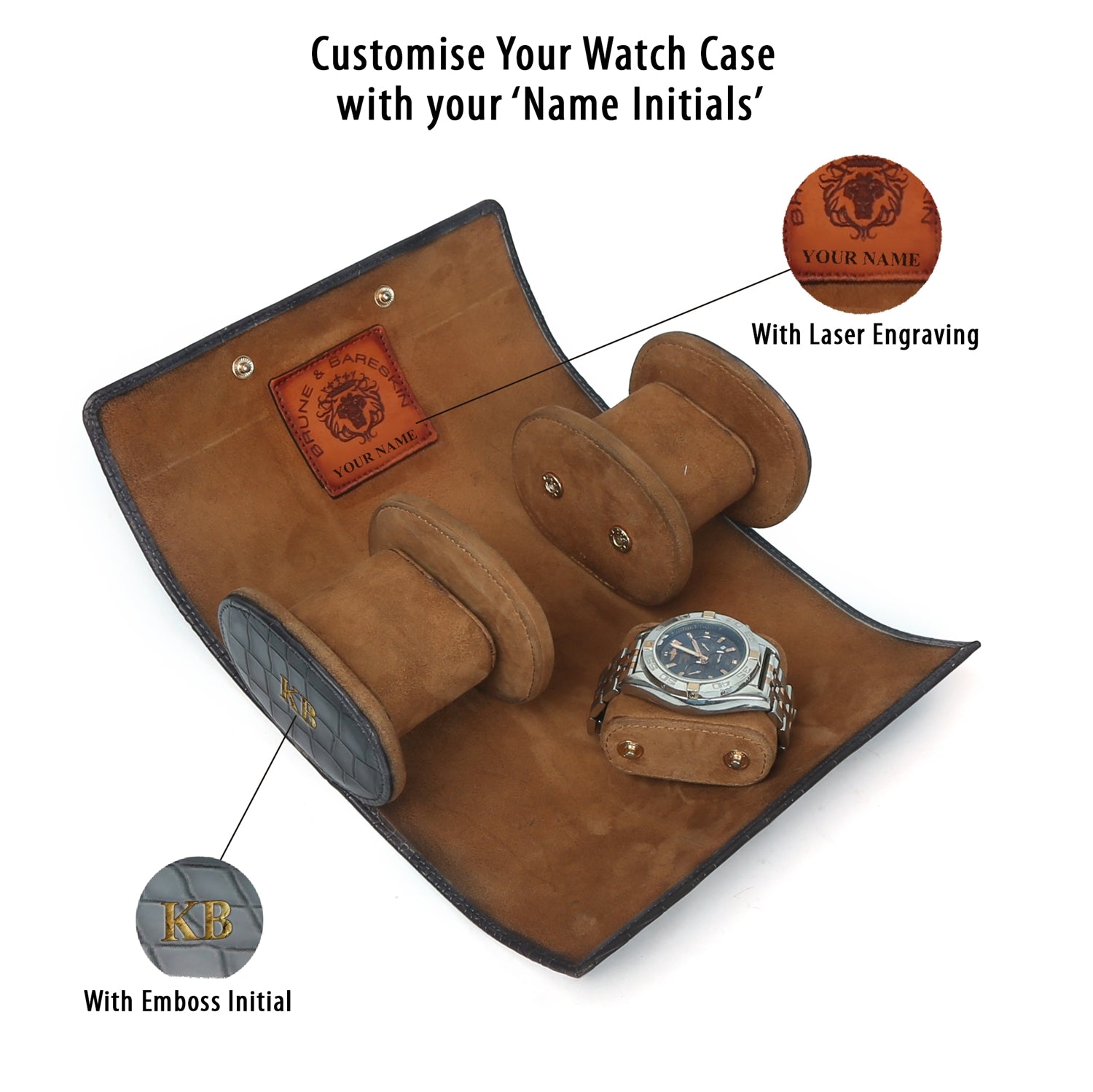 Brune & Bareskin cognac smokey deep cut croco leather wrist watch roll is a storage accessory designed for watches. It is made of high-quality leather with a deep-cut crocodile pattern and a cognac smoky finish that gives it a unique and elegant look. The roll is designed to store multiple wristwatches securely and protect them from dust, scratches, and other forms of damage and designed with snap button closure.. The interior of the roll is lined with soft and plush material that provides extra cushioning to the watches. The roll can be easily rolled up and secured with a leather strap and buckle, making it easy to carry and store when traveling. It is a luxurious and practical accessory for watch collectors and enthusiasts.