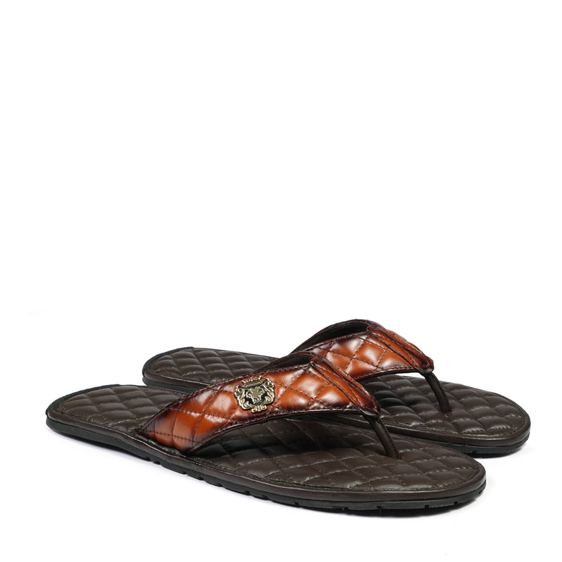 Cognac V- Strap Slide-in Slippers with Diamond Stitched Base in Deep Cut Leather
