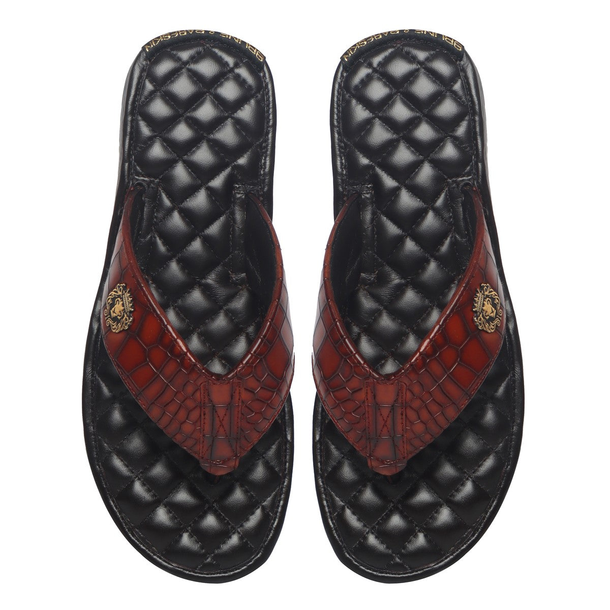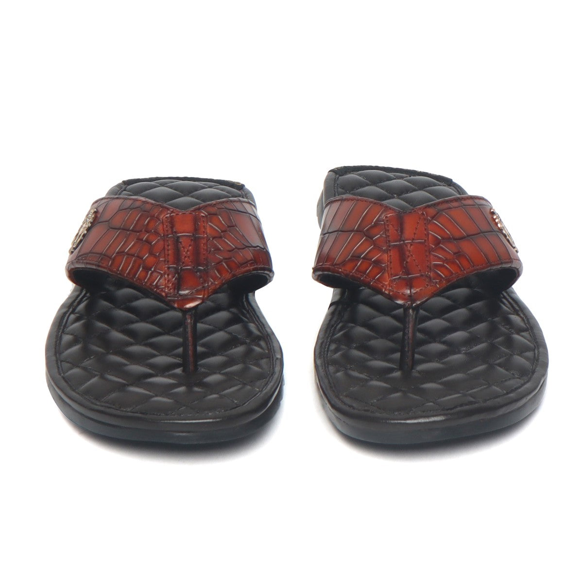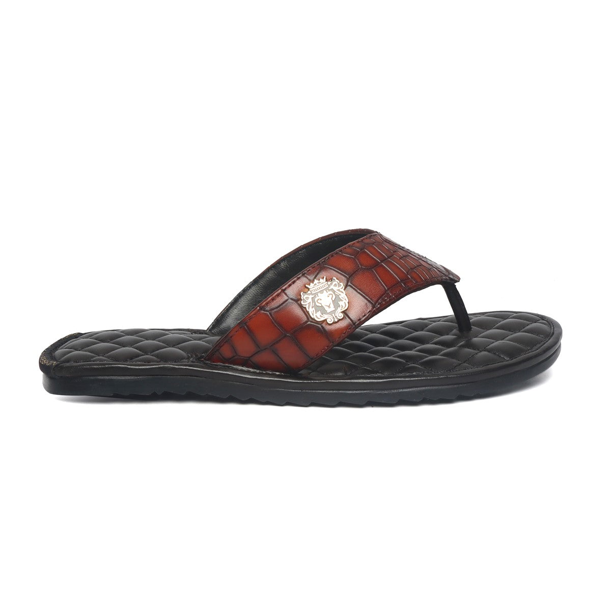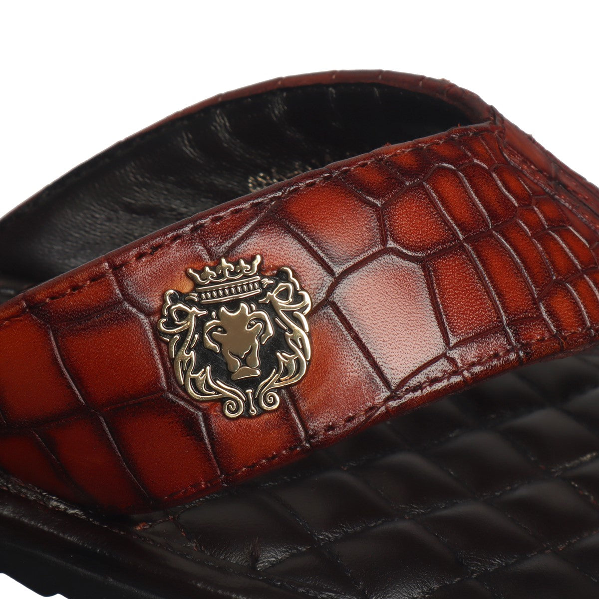 This Cognac T- Strap Deep Cut Croco Leather Slippers By Brune & Bareskin are designed to give complete comfort and style to the feet in this season. The Metal Lion logo contrasting golden provides vogue and ruggedness at the same time. They are a good pick to wear with casuals and ethnicities.