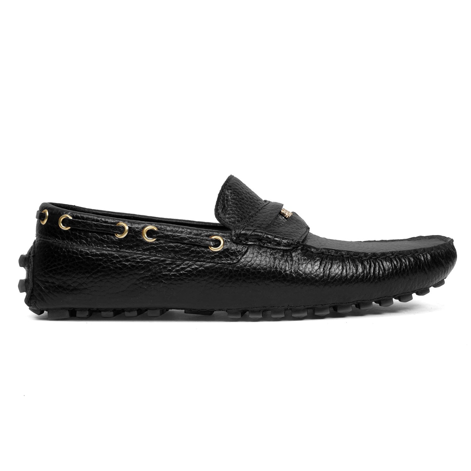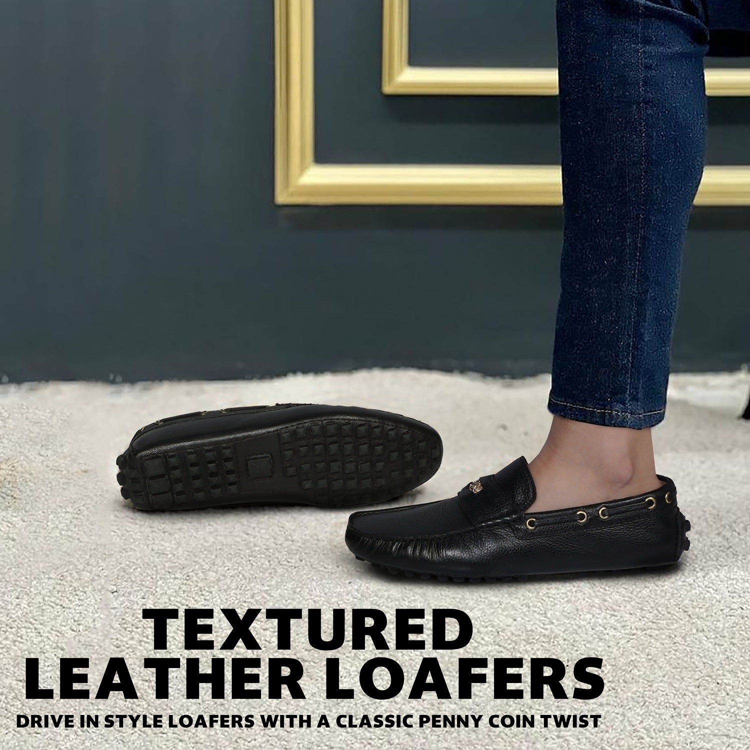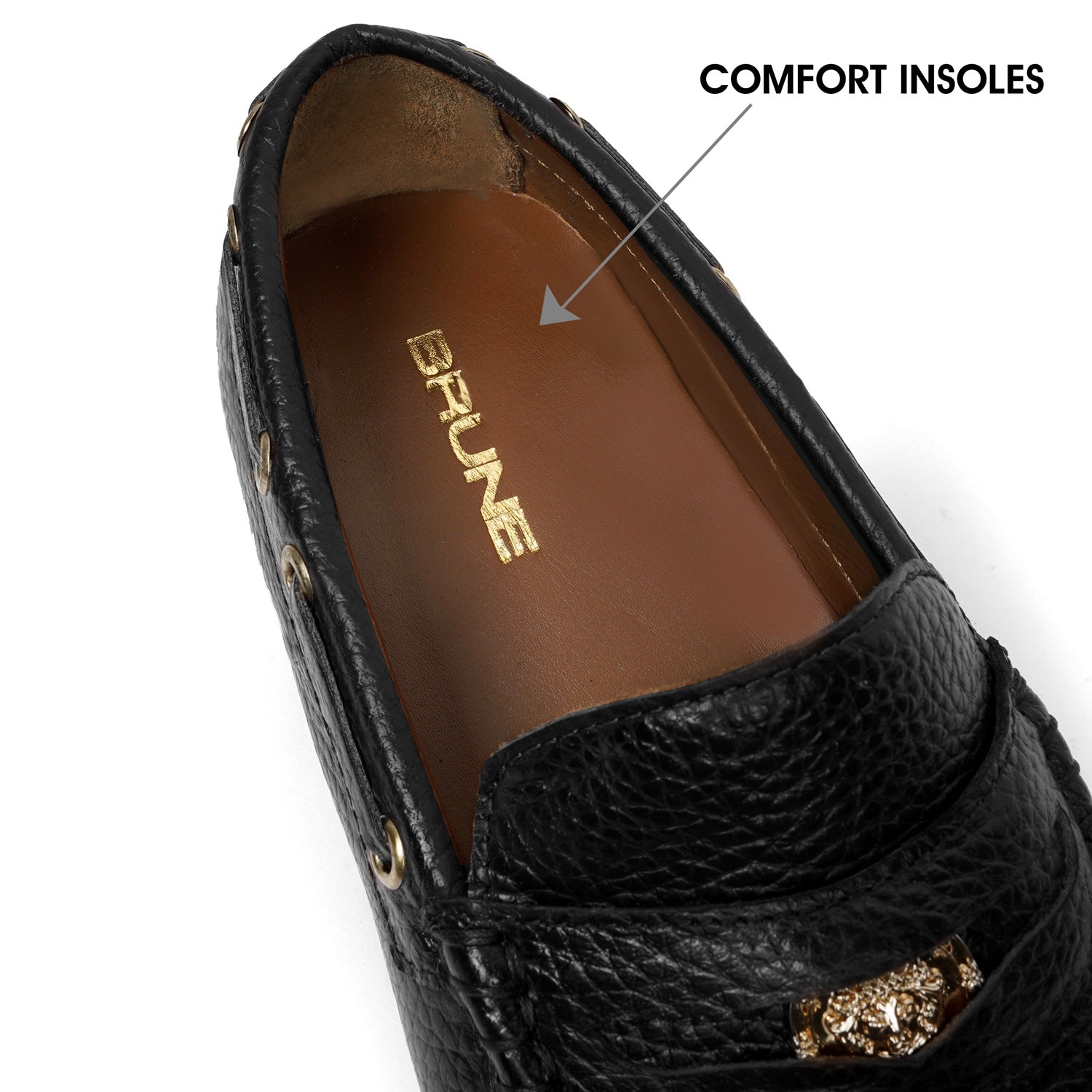 Expertly crafted by Brune & Bareskin, these men's driver loafers elevate your style with a touch of sophistication. The black textured moccasin design is handcrafted with a trademark lion logo and a fixed side lacing design. The extra-padded insole and nubs leather sole offer unparalleled comfort and traction. Plus, the added benefit of an exchangeable coin penny makes these formal slip-on shoes truly unique.